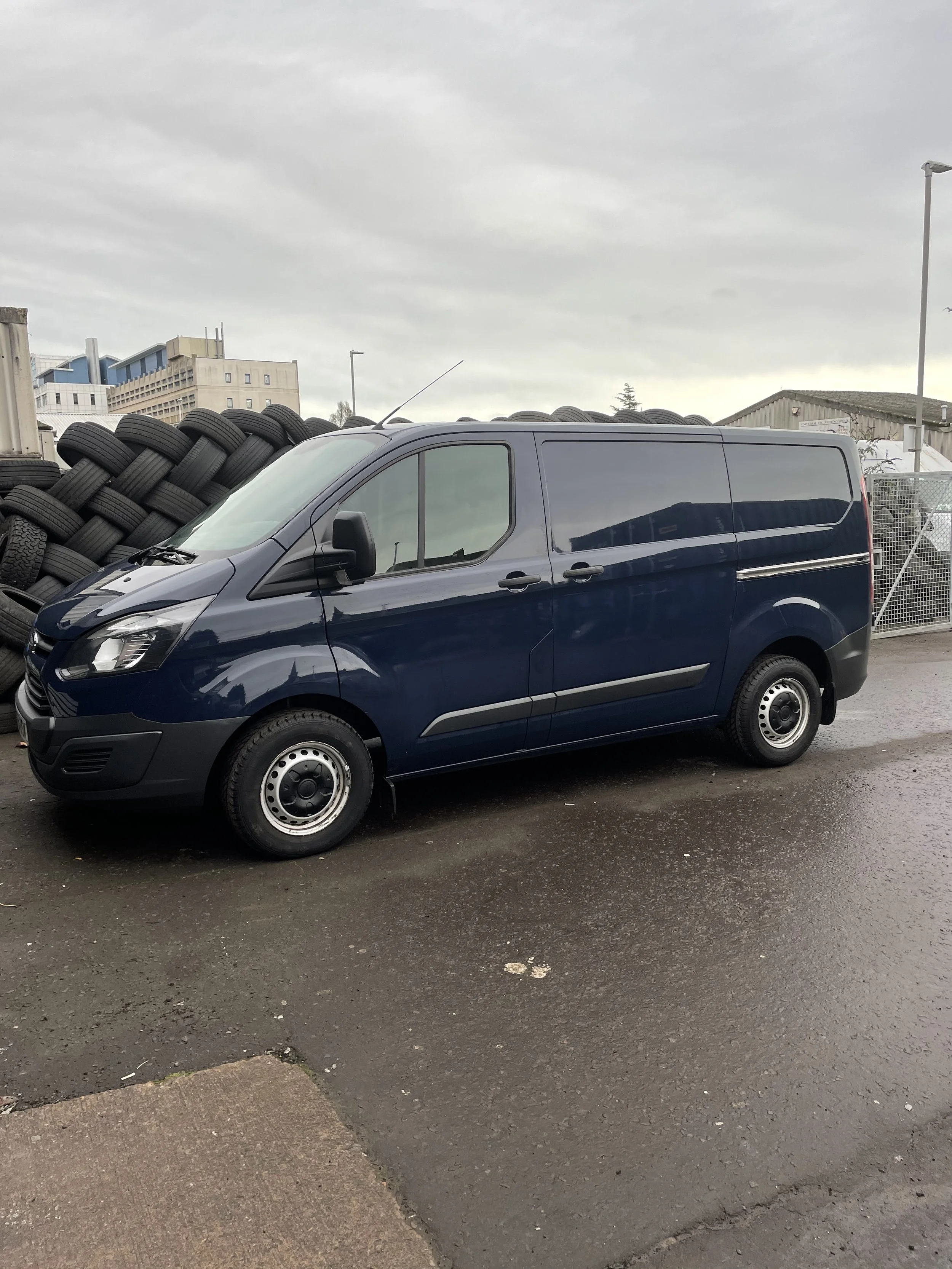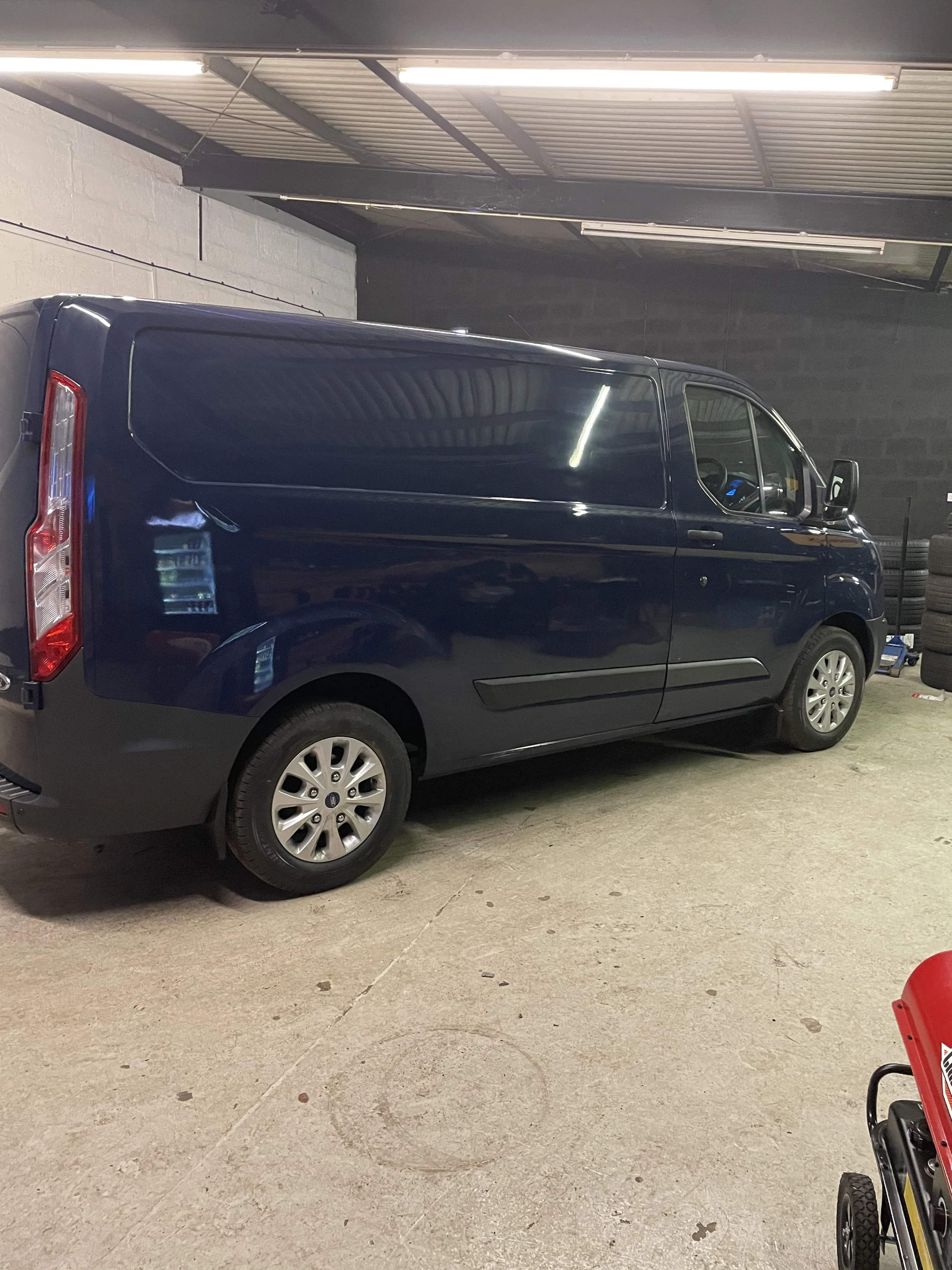 A dark blue cargo van parked inside a garage with a concrete floor and black brick walls. There are tires stacked on the right side and a red object partially visible in the lower right corner.