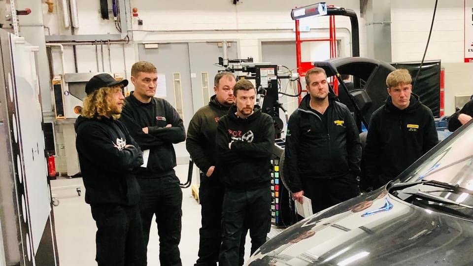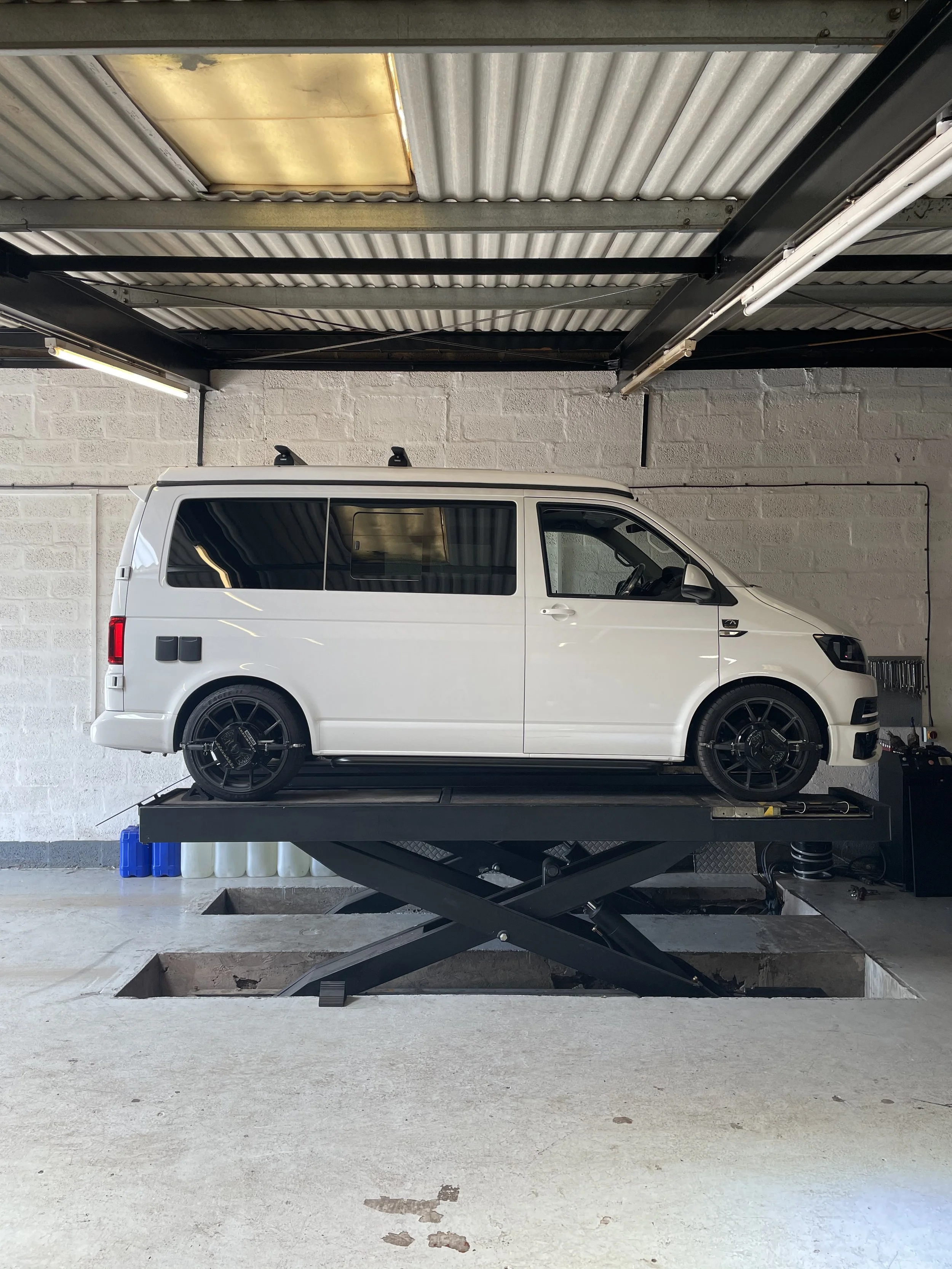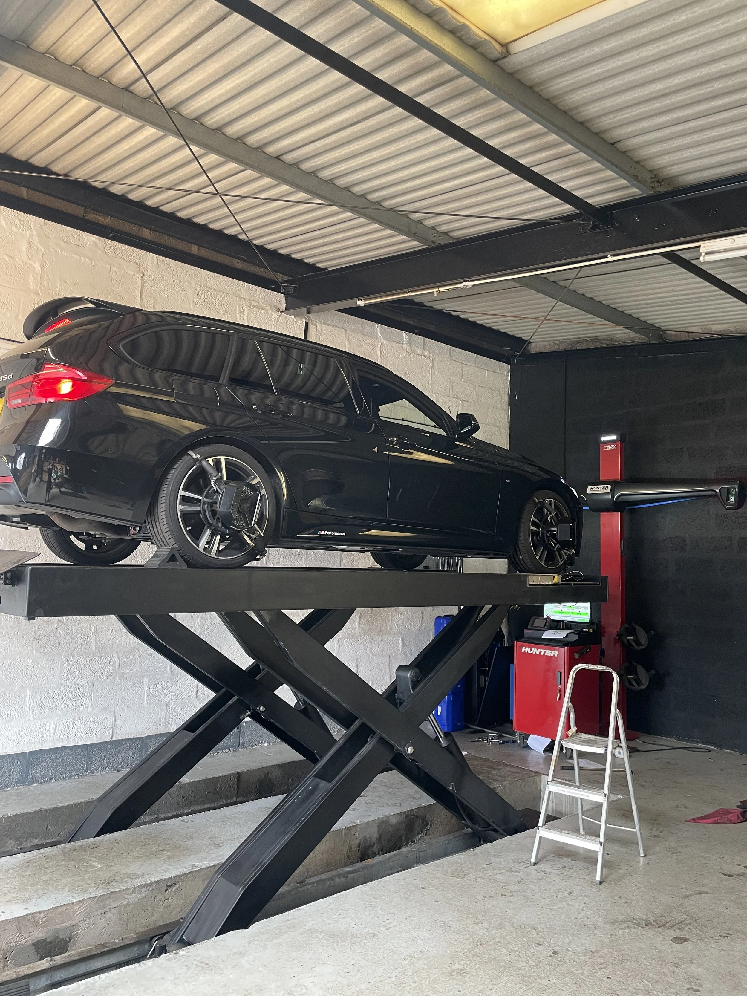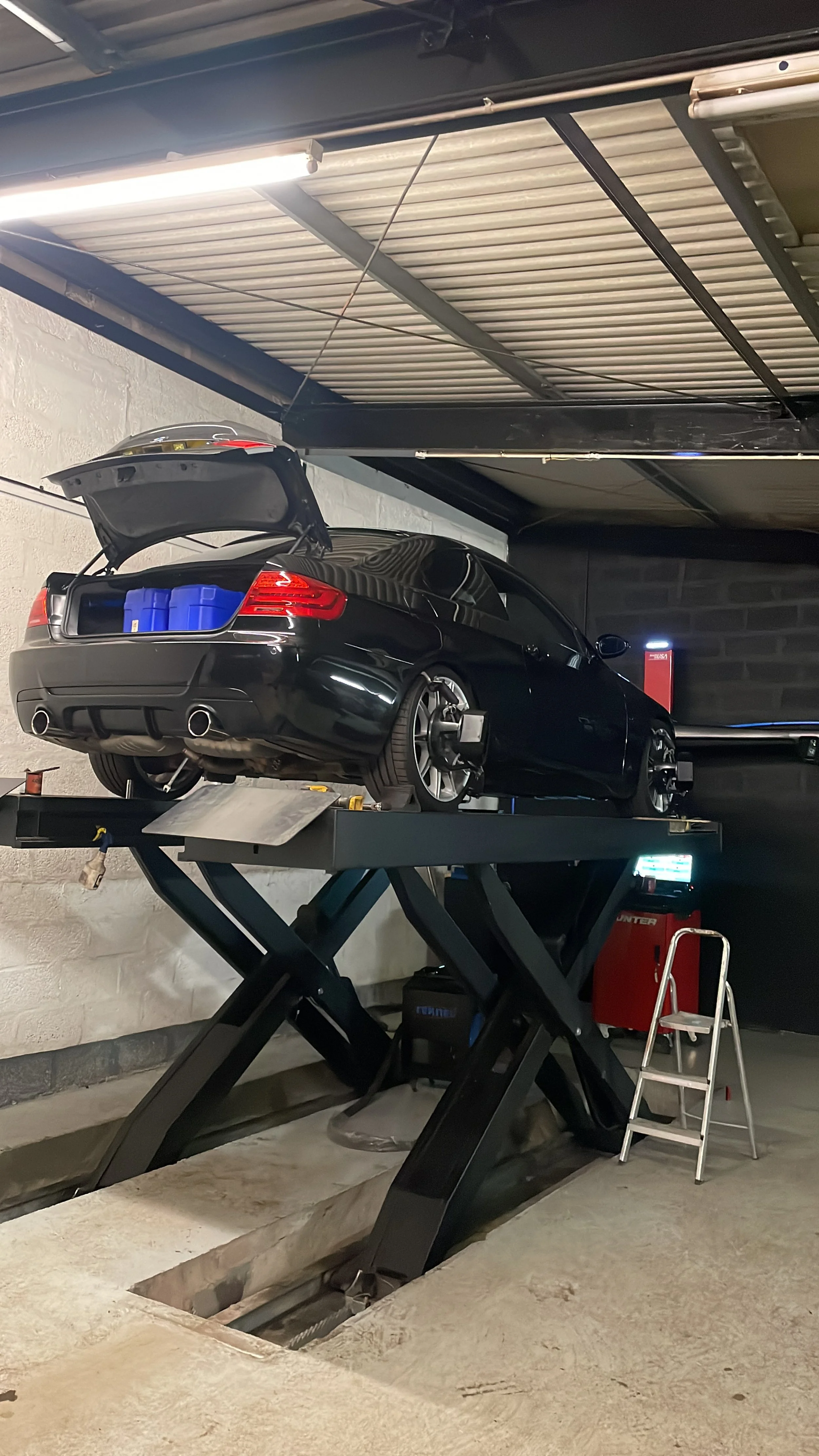 Black sports car on a hydraulic lift in an automotive repair garage.