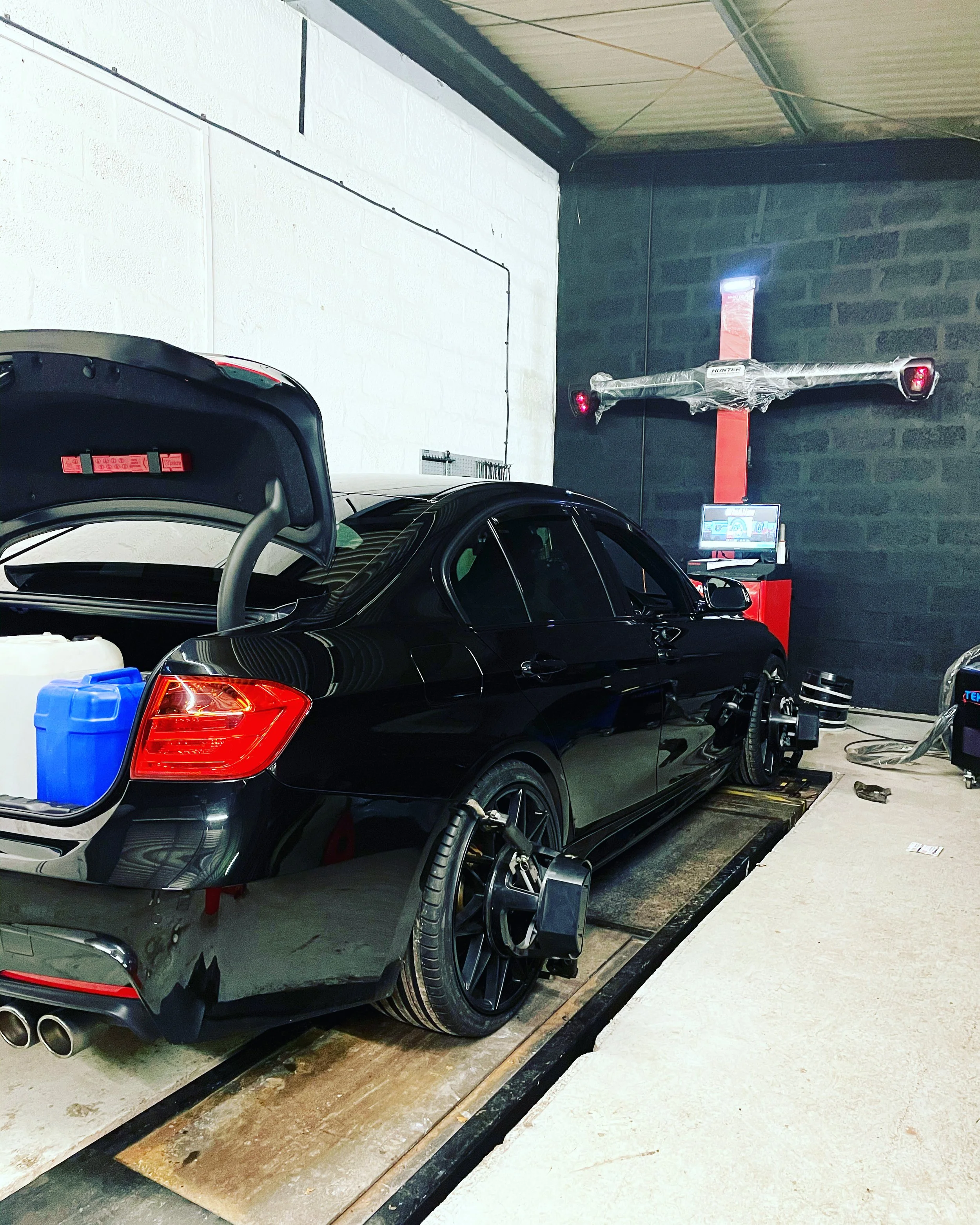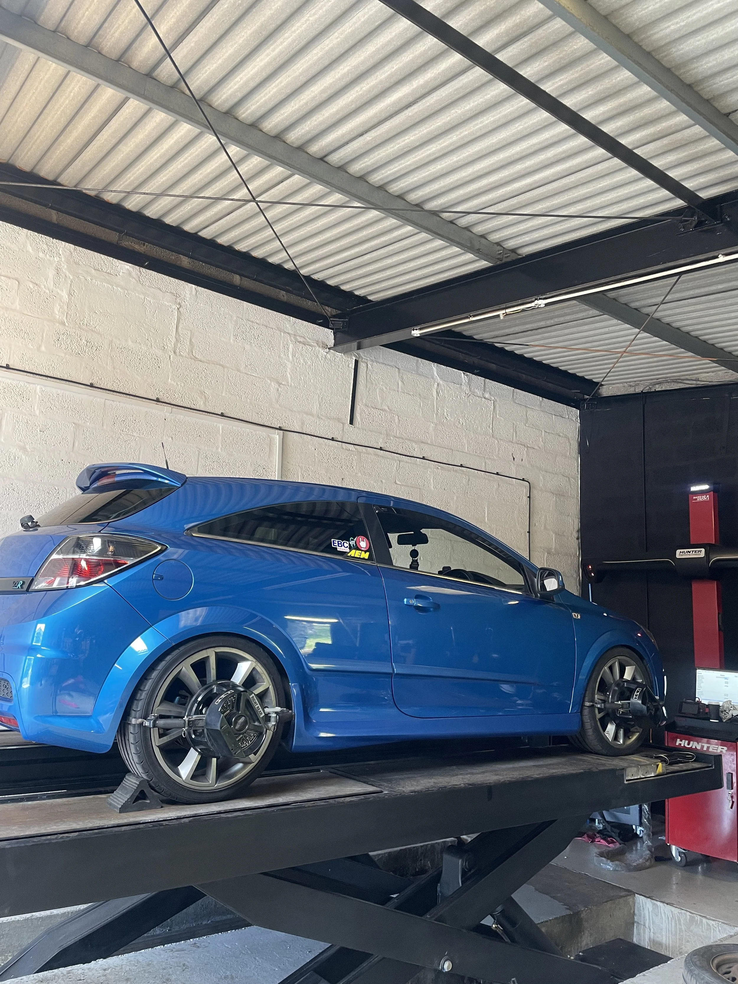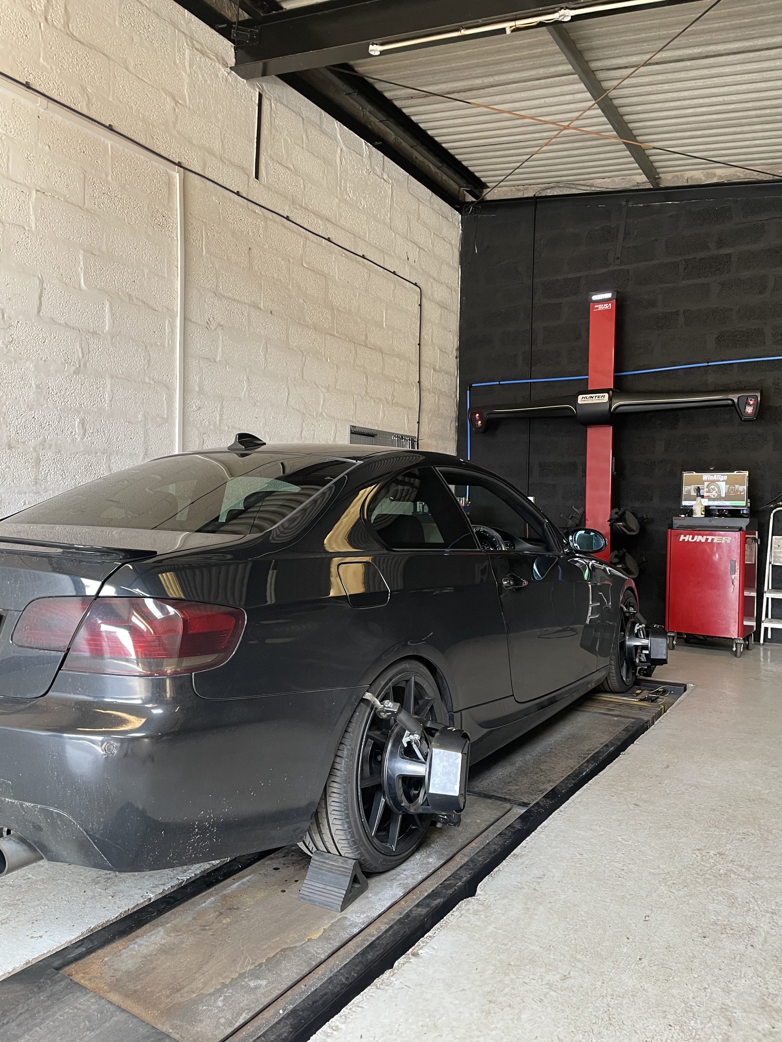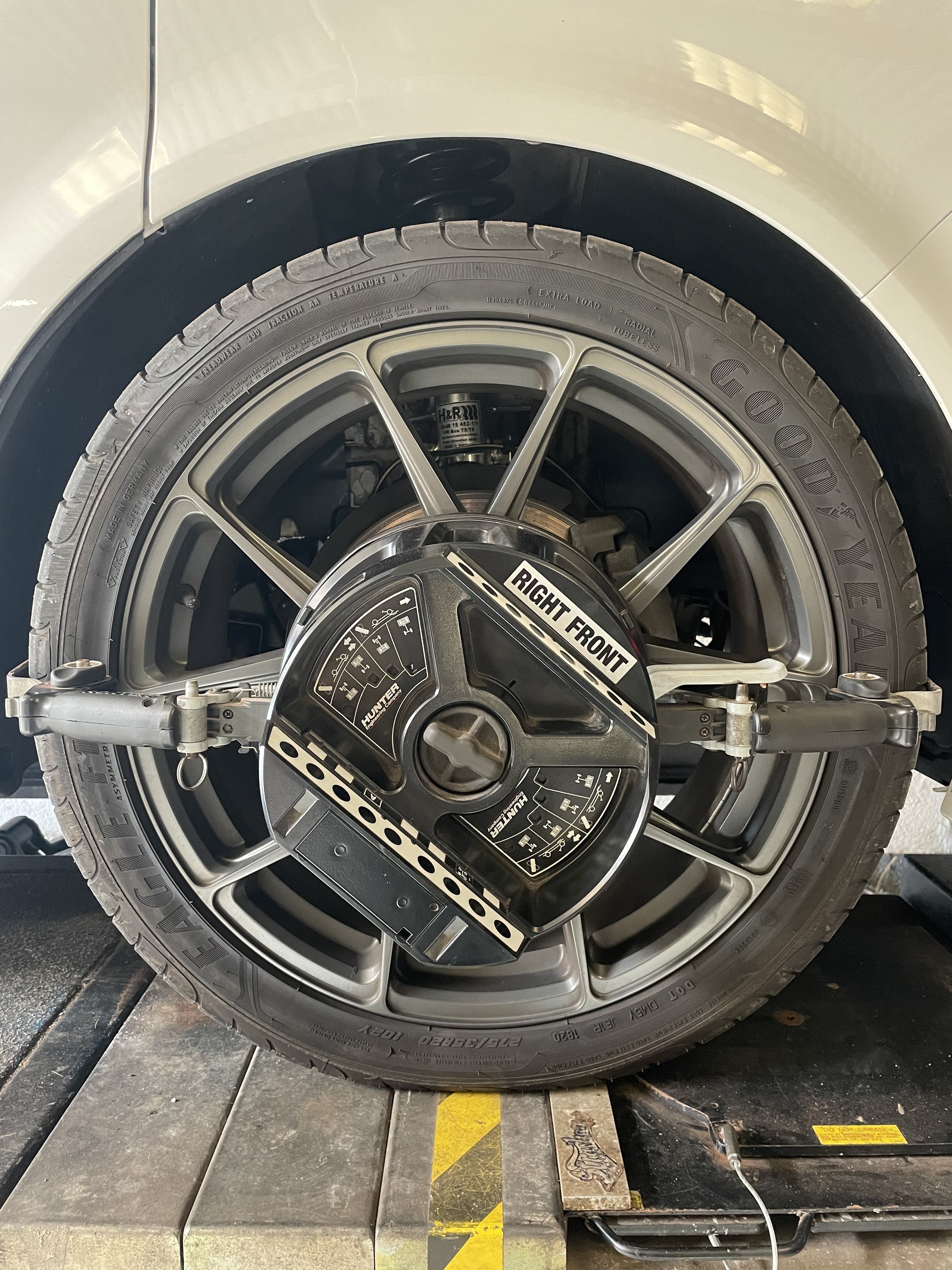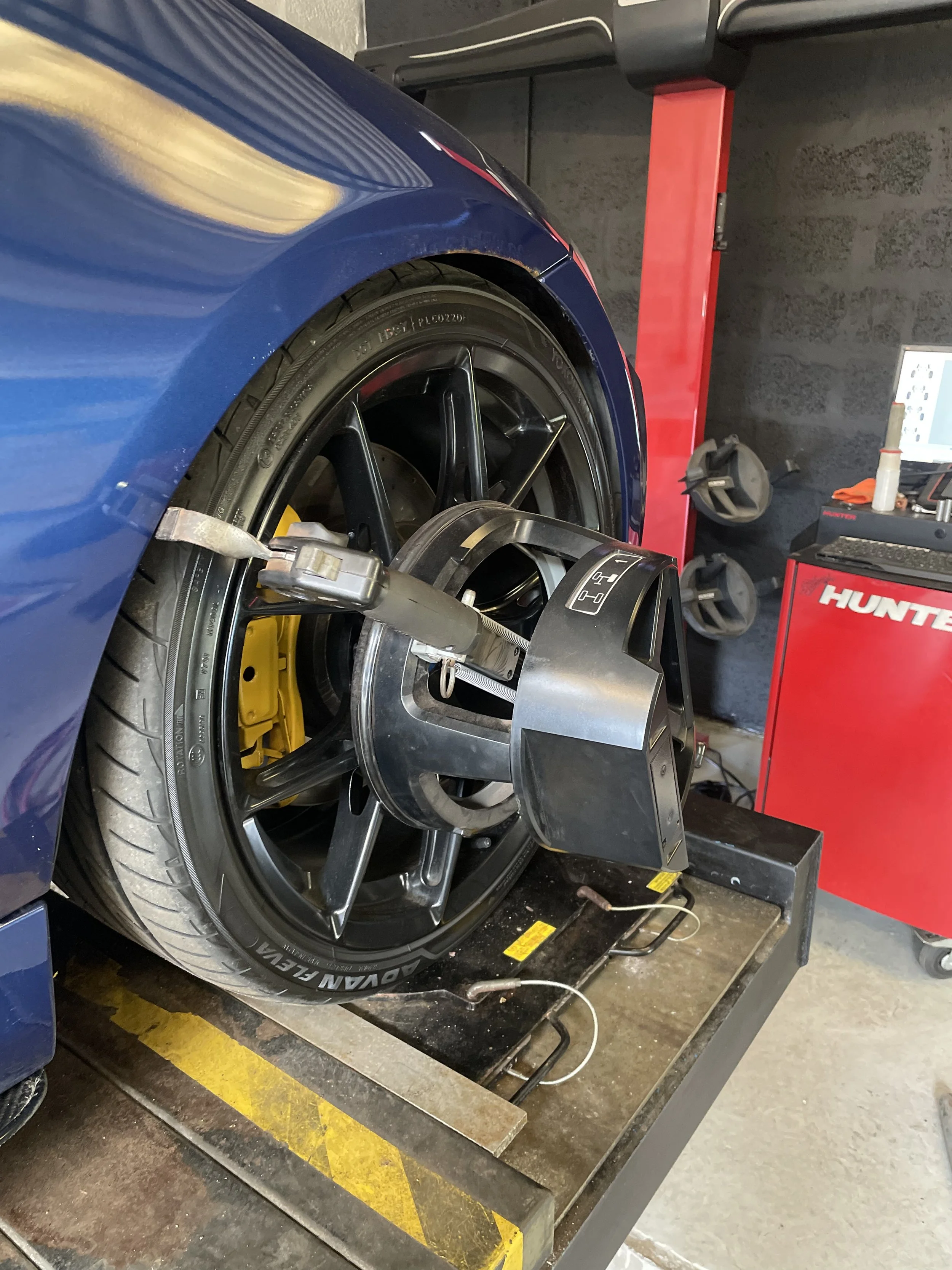A car on a wheel alignment machine in a garage, with a blue body, black wheel with Yokohama A052R tire, and a yellow brake caliper.