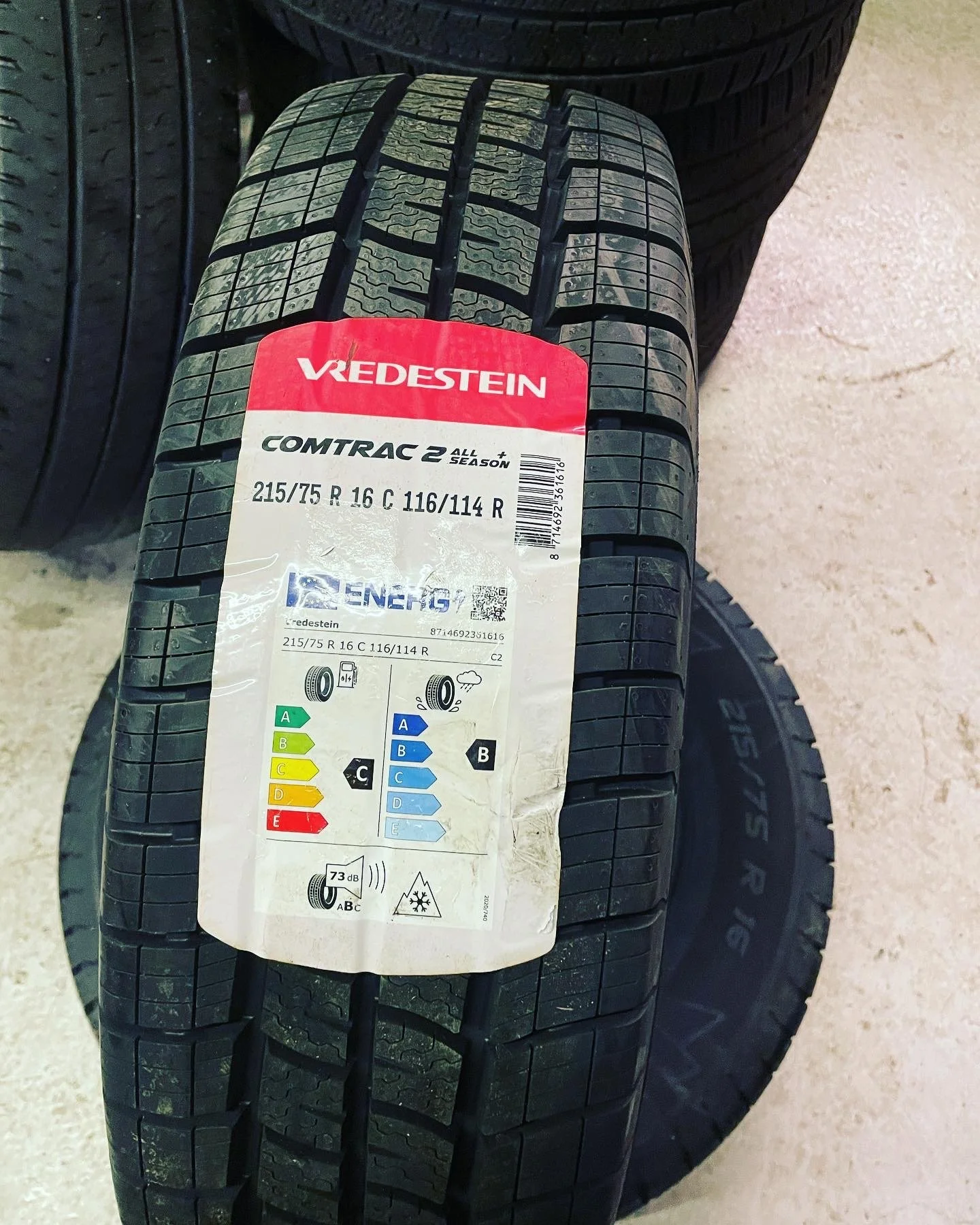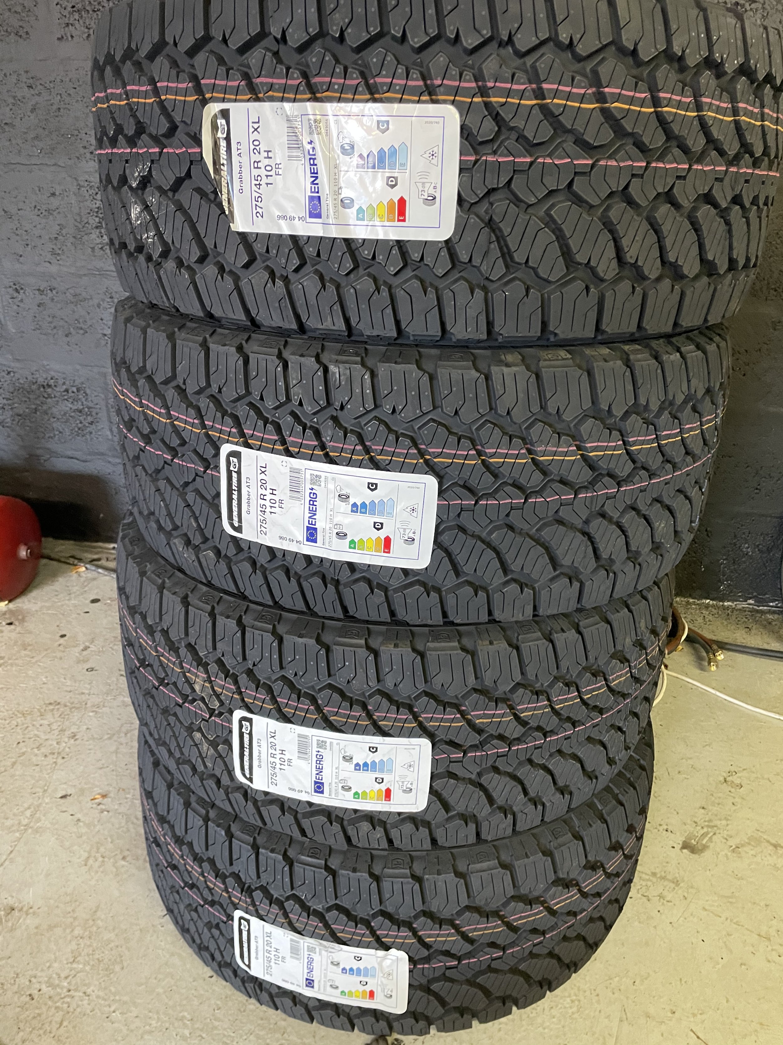 Stack of four black tires with white labels stacked in front of a wooden wall with a painted logo reading 'Freschans' and a circular object with the same logo.