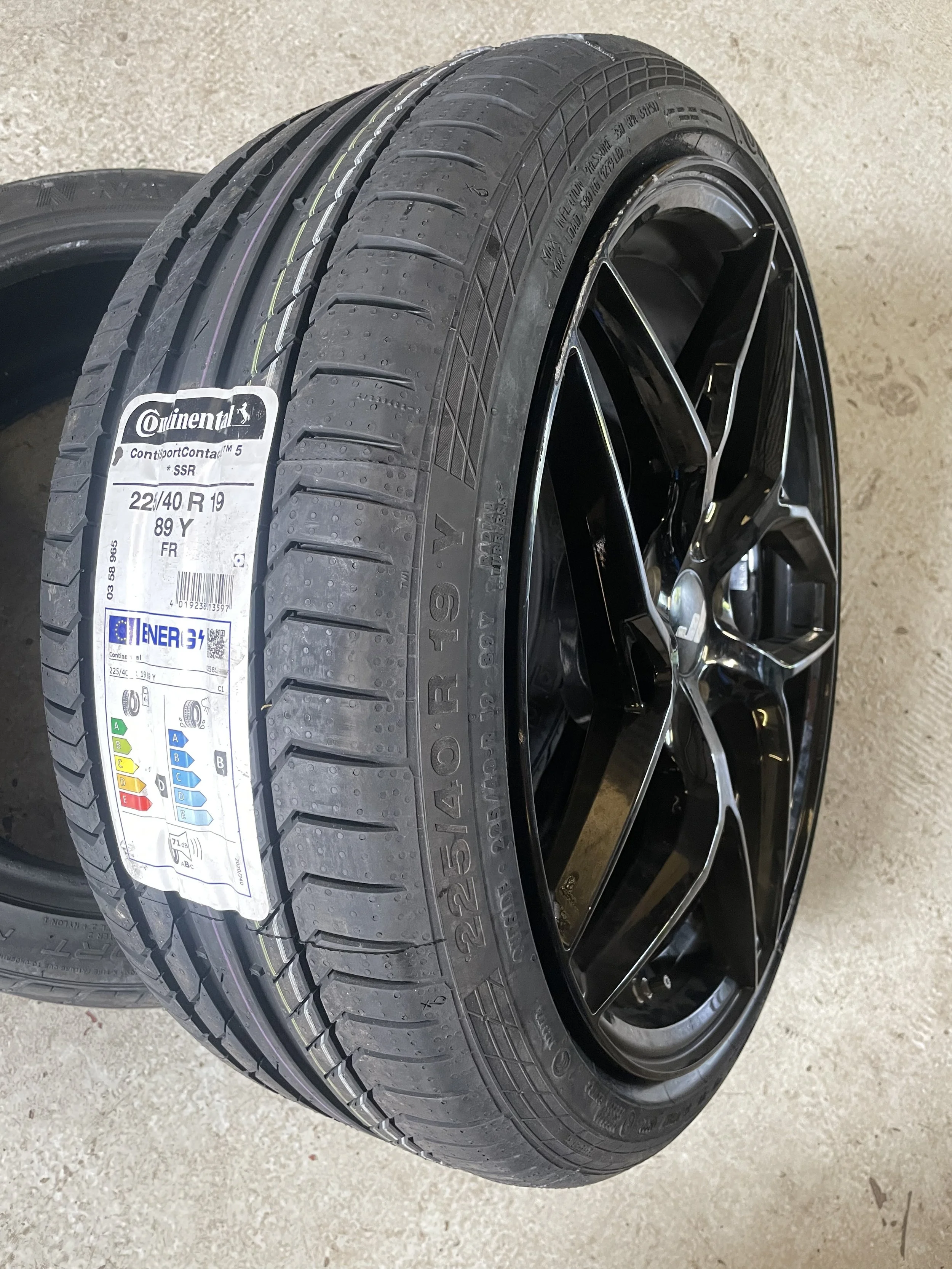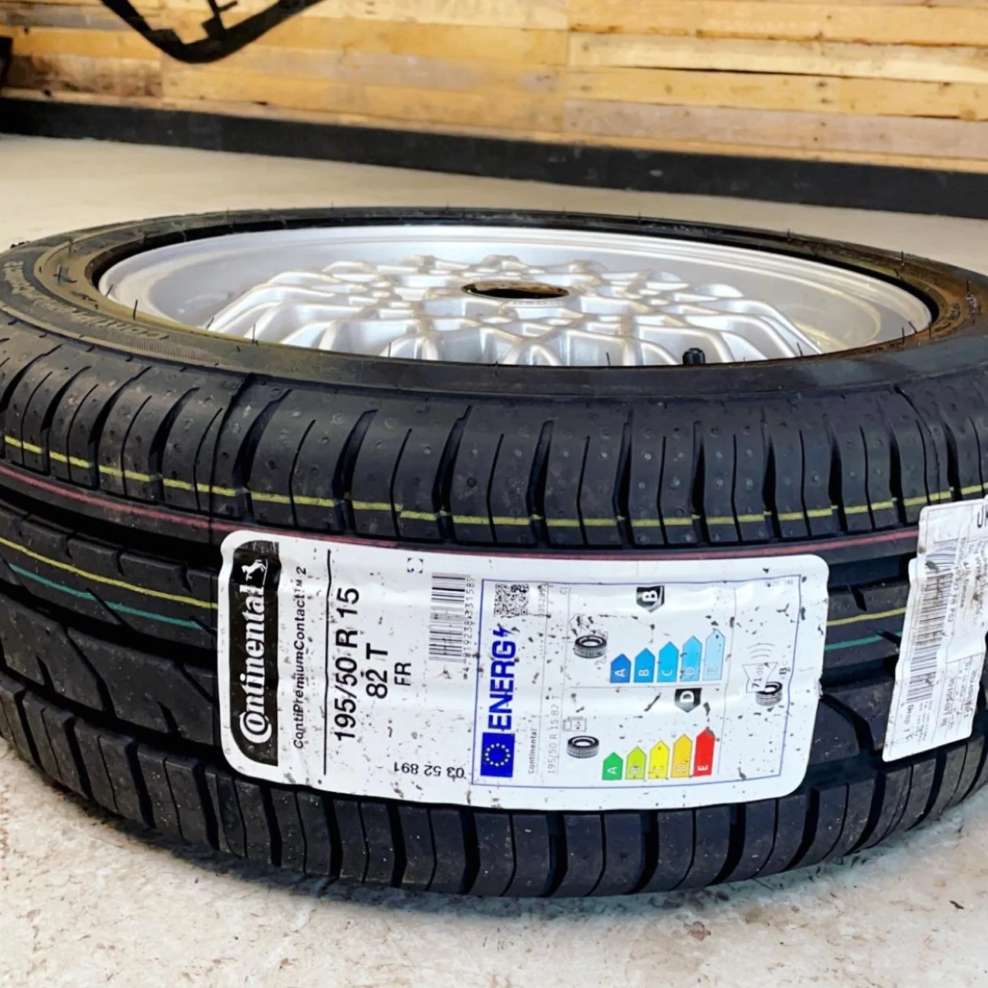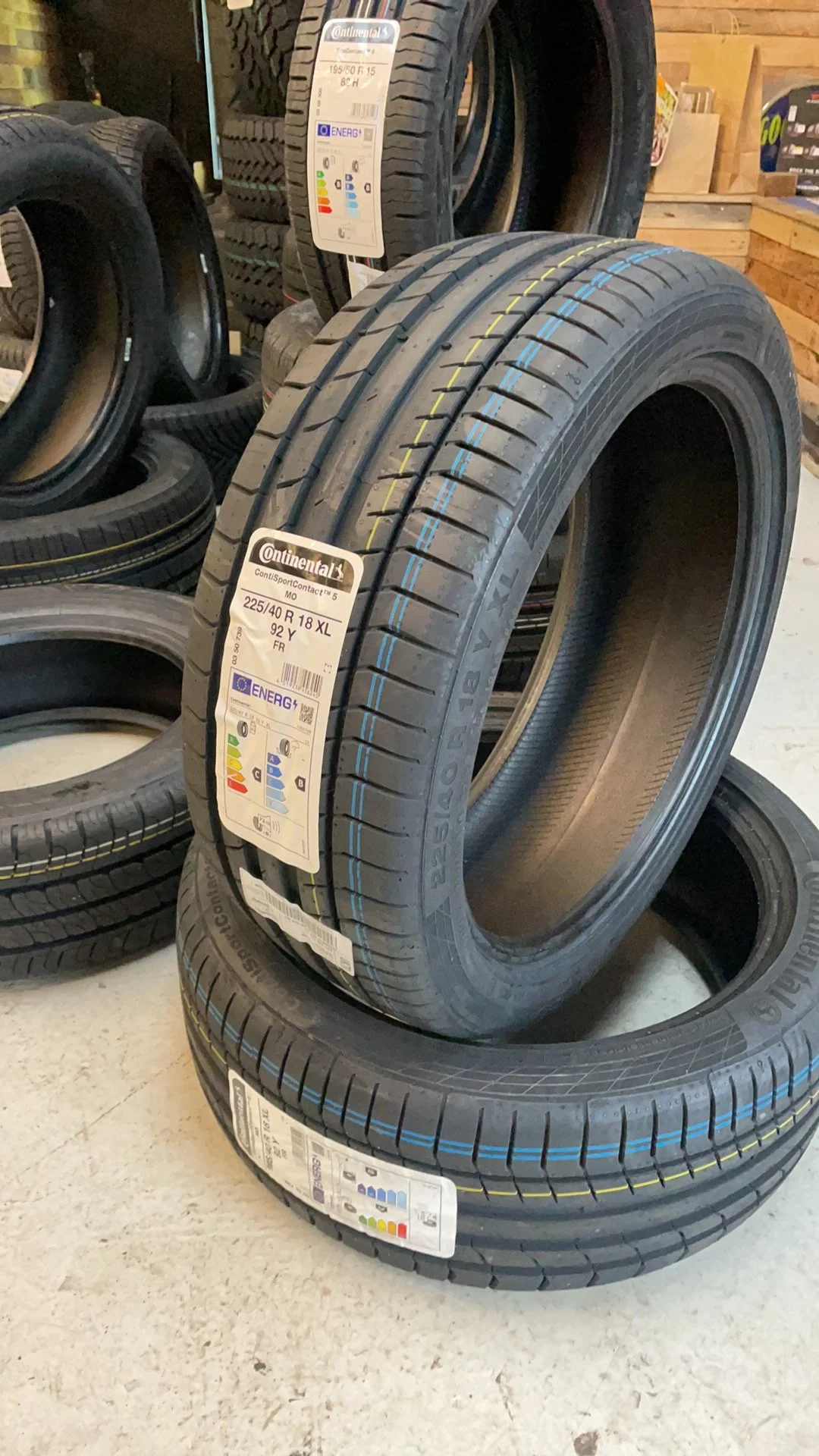 Stack of two black car tires with one mounted on a black alloy wheel, showing size and brand labels.
