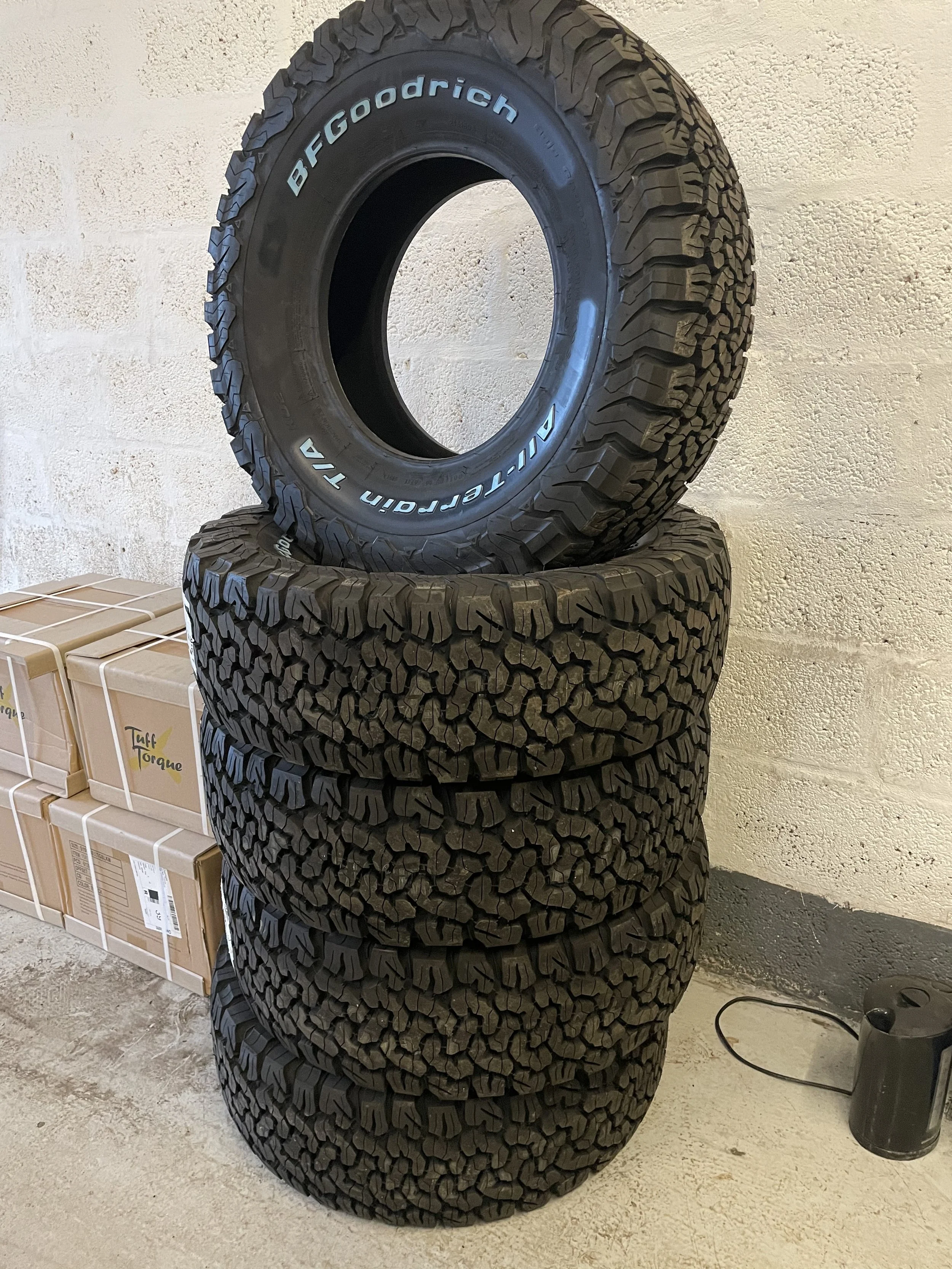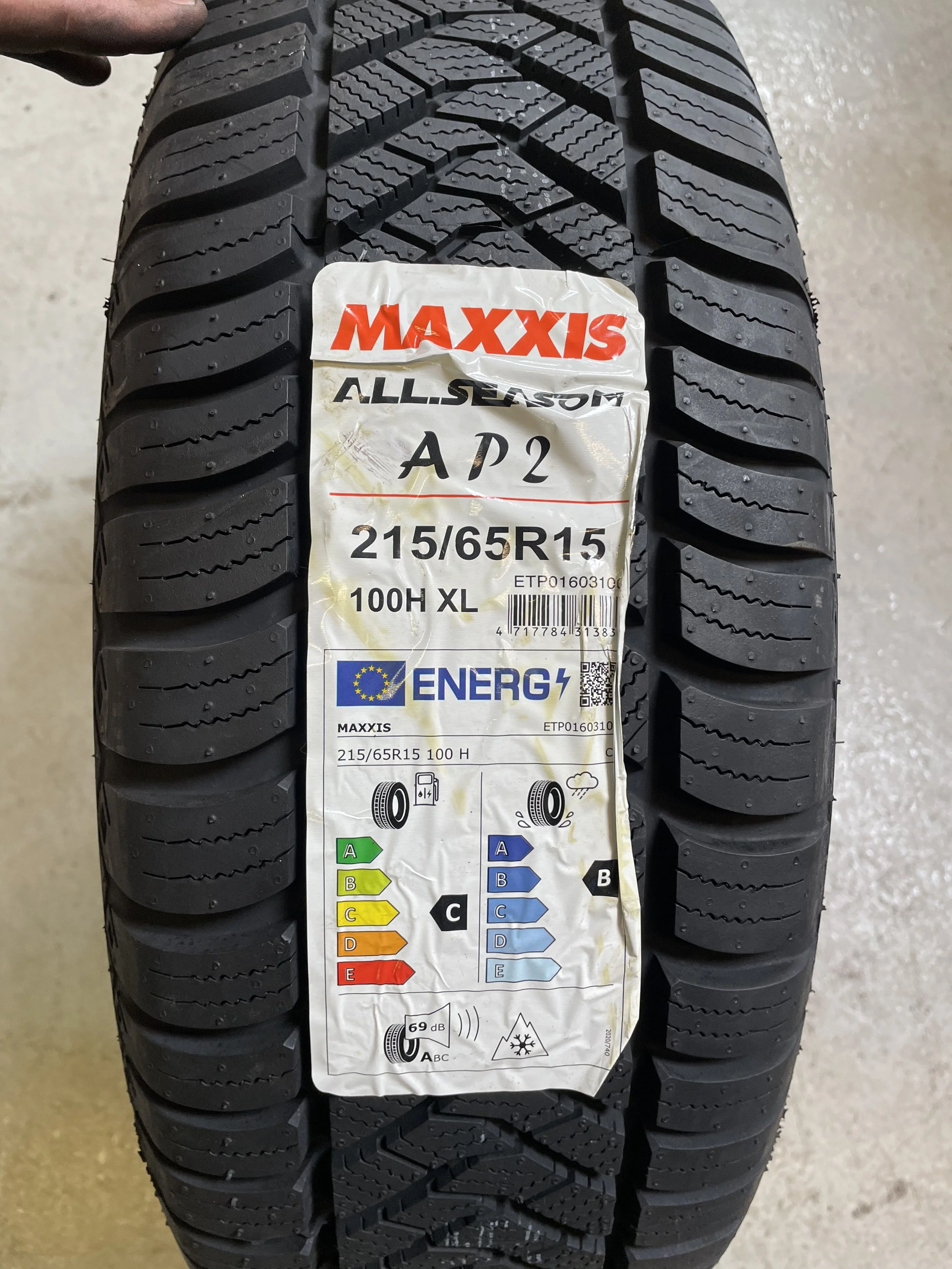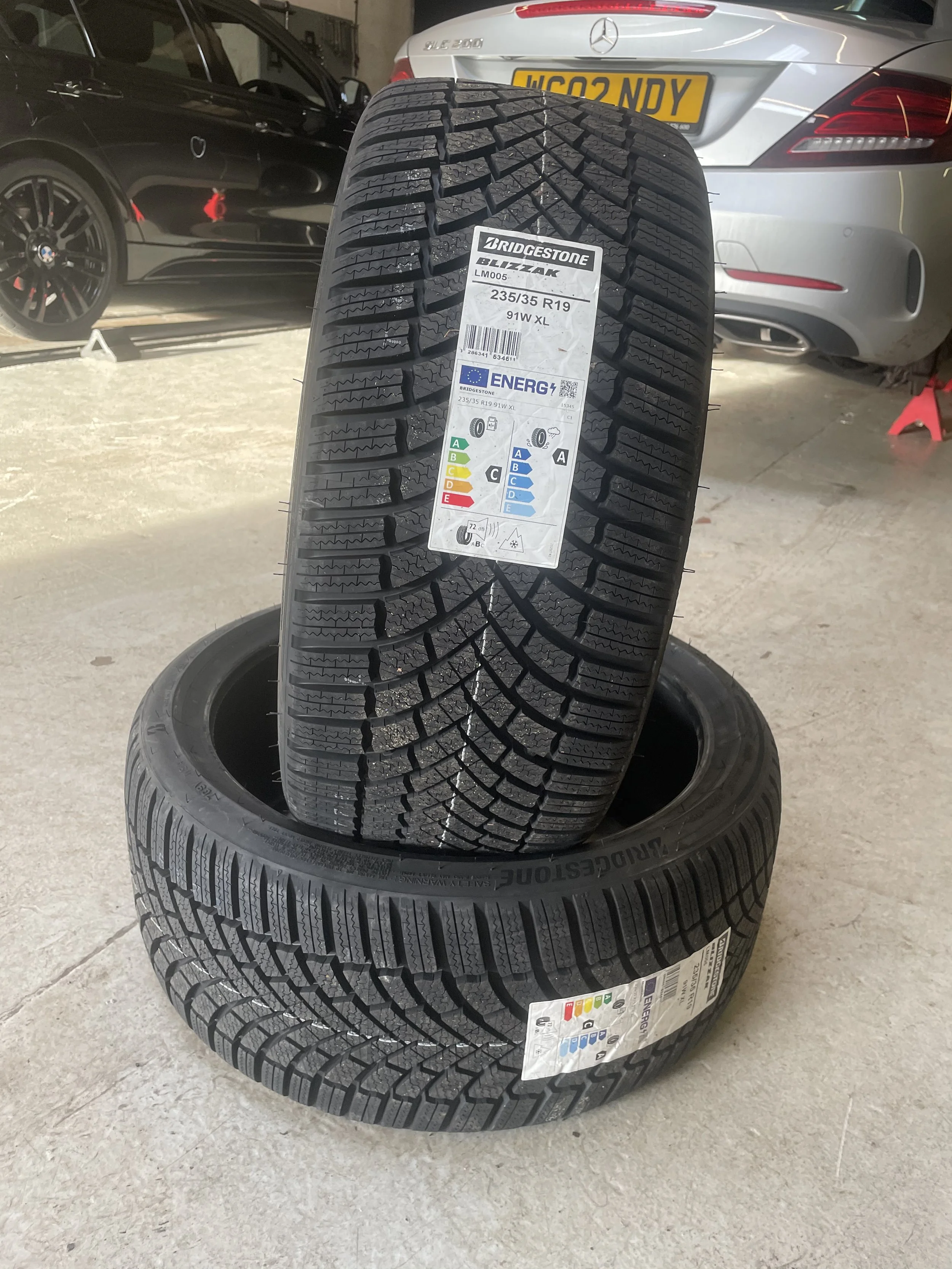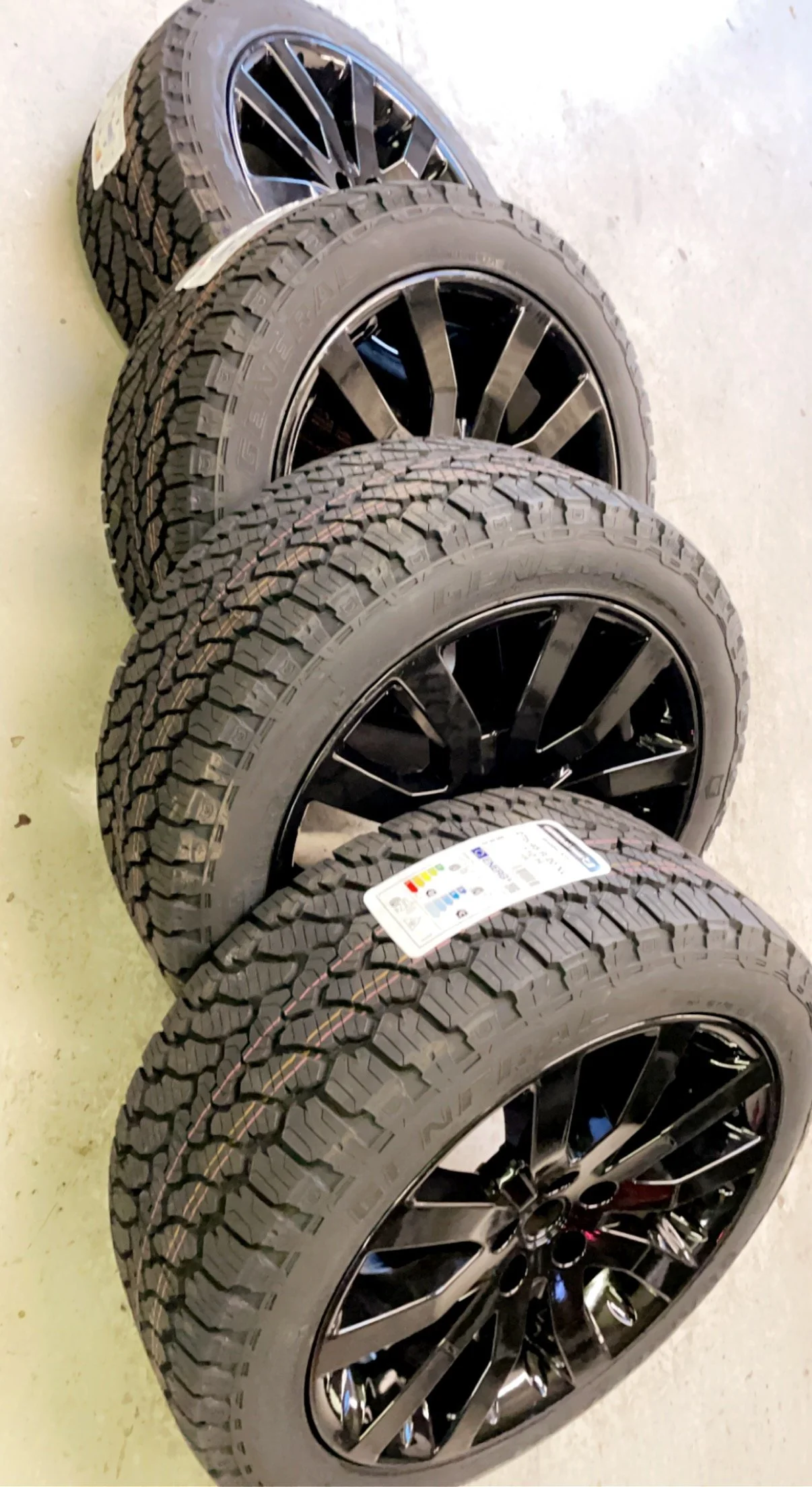 Stack of two black car tires with one mounted on a black alloy wheel, showing size and brand labels.