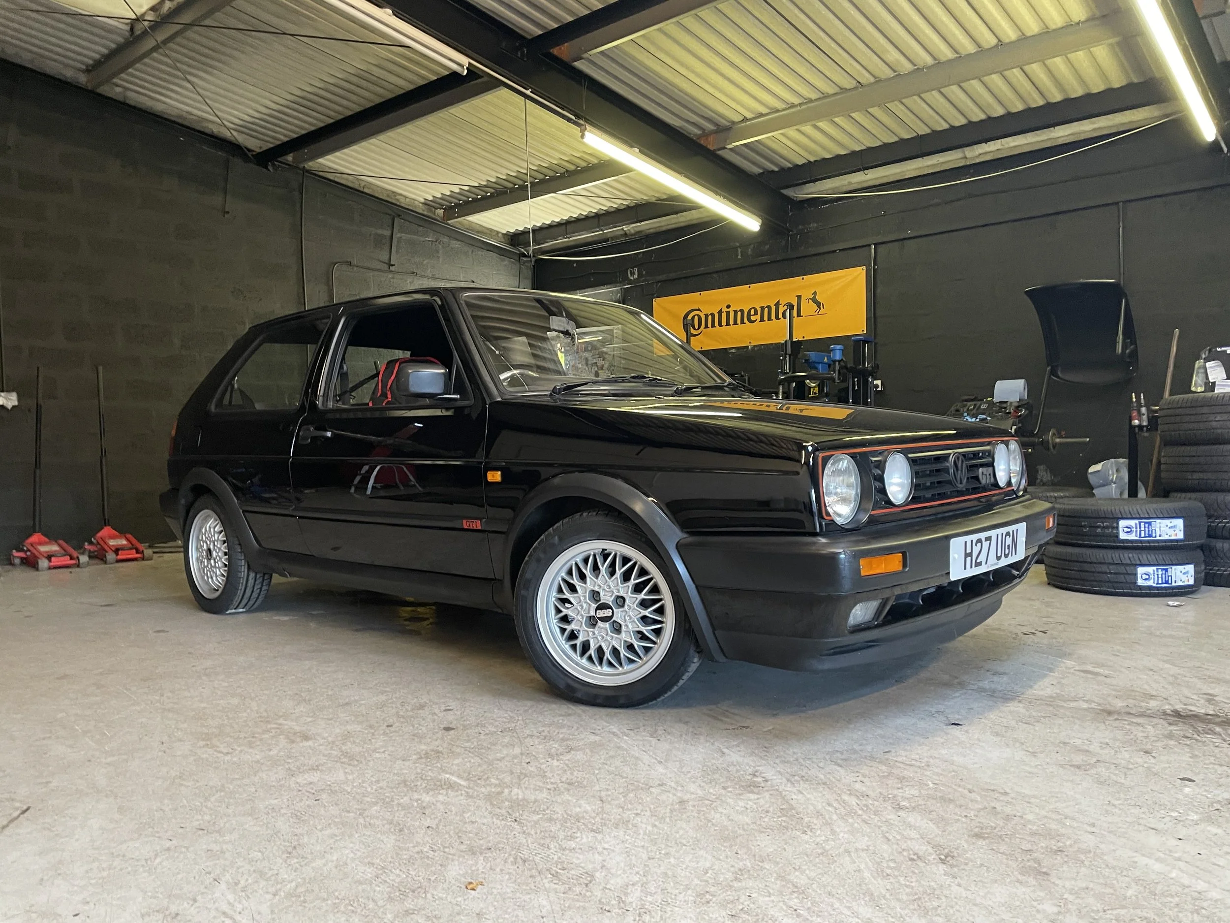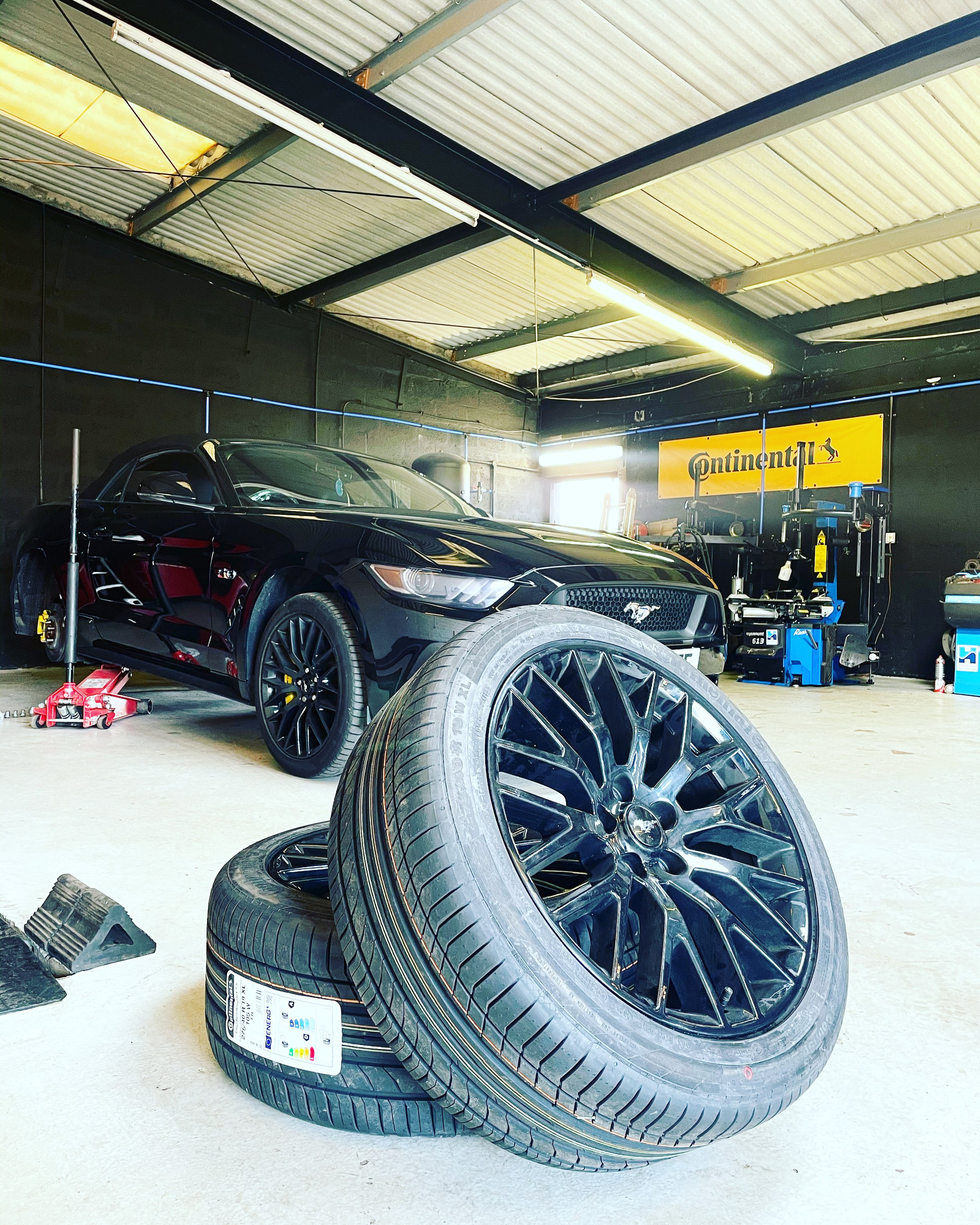 A black Ford Mustang in a garage, with two black tires with rims stacked in foreground, and various tools and equipment around.