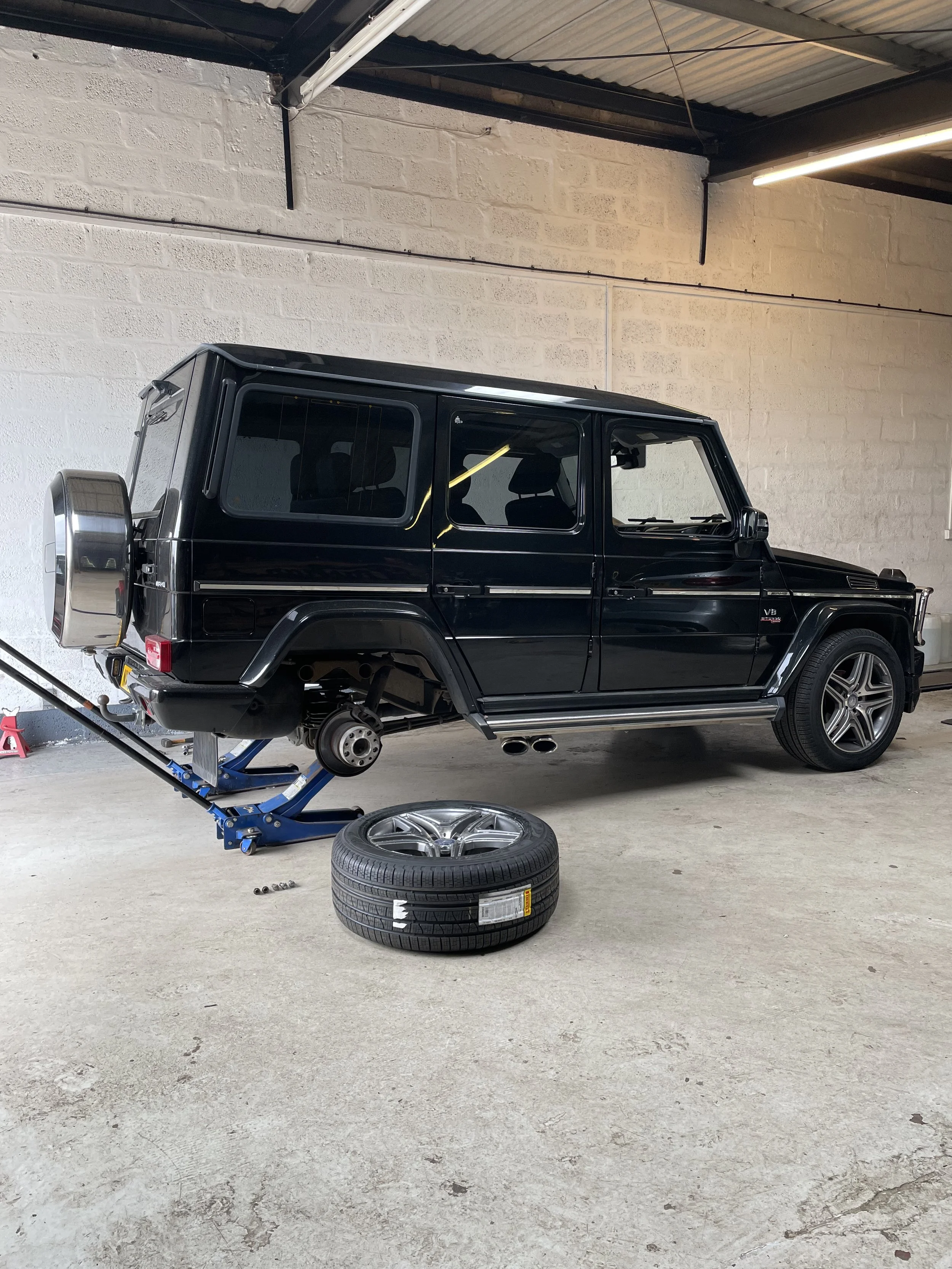 Black Mercedes-Benz G-Class SUV being serviced in a garage, with one wheel removed and a spare tire placed on the ground.