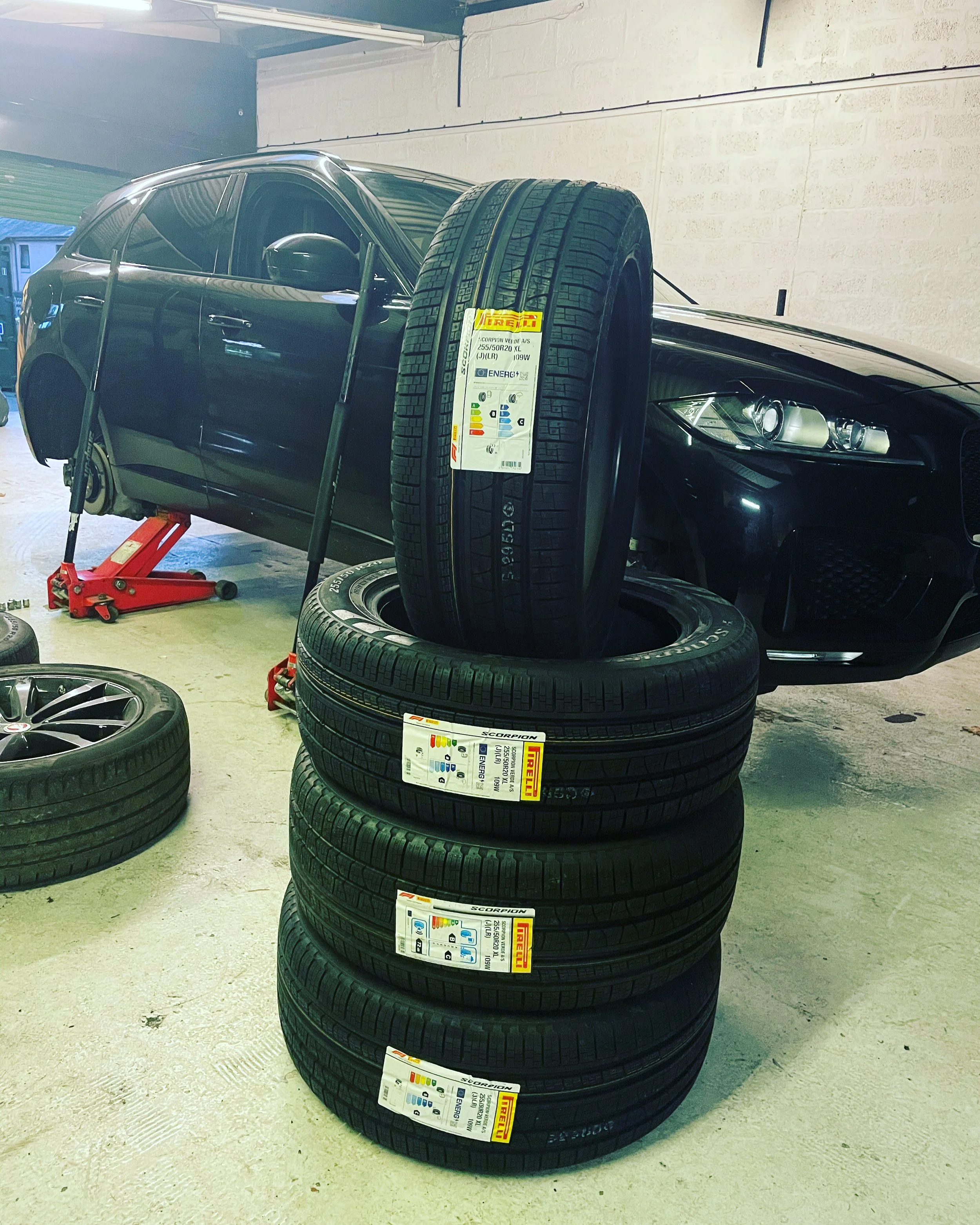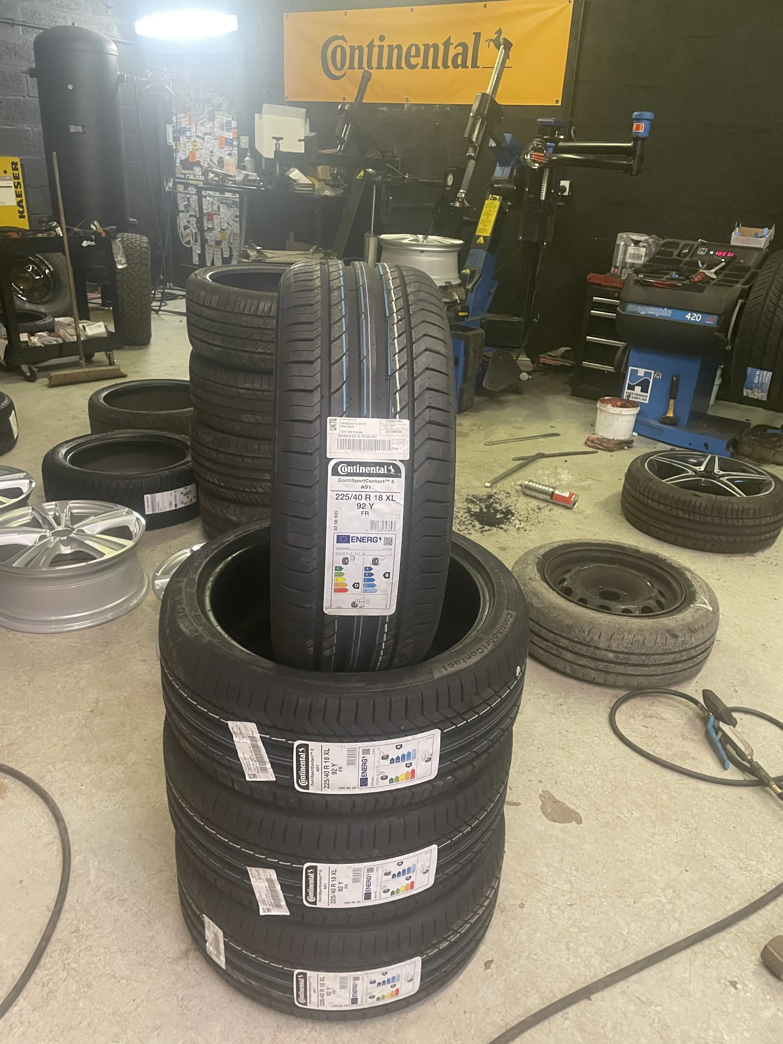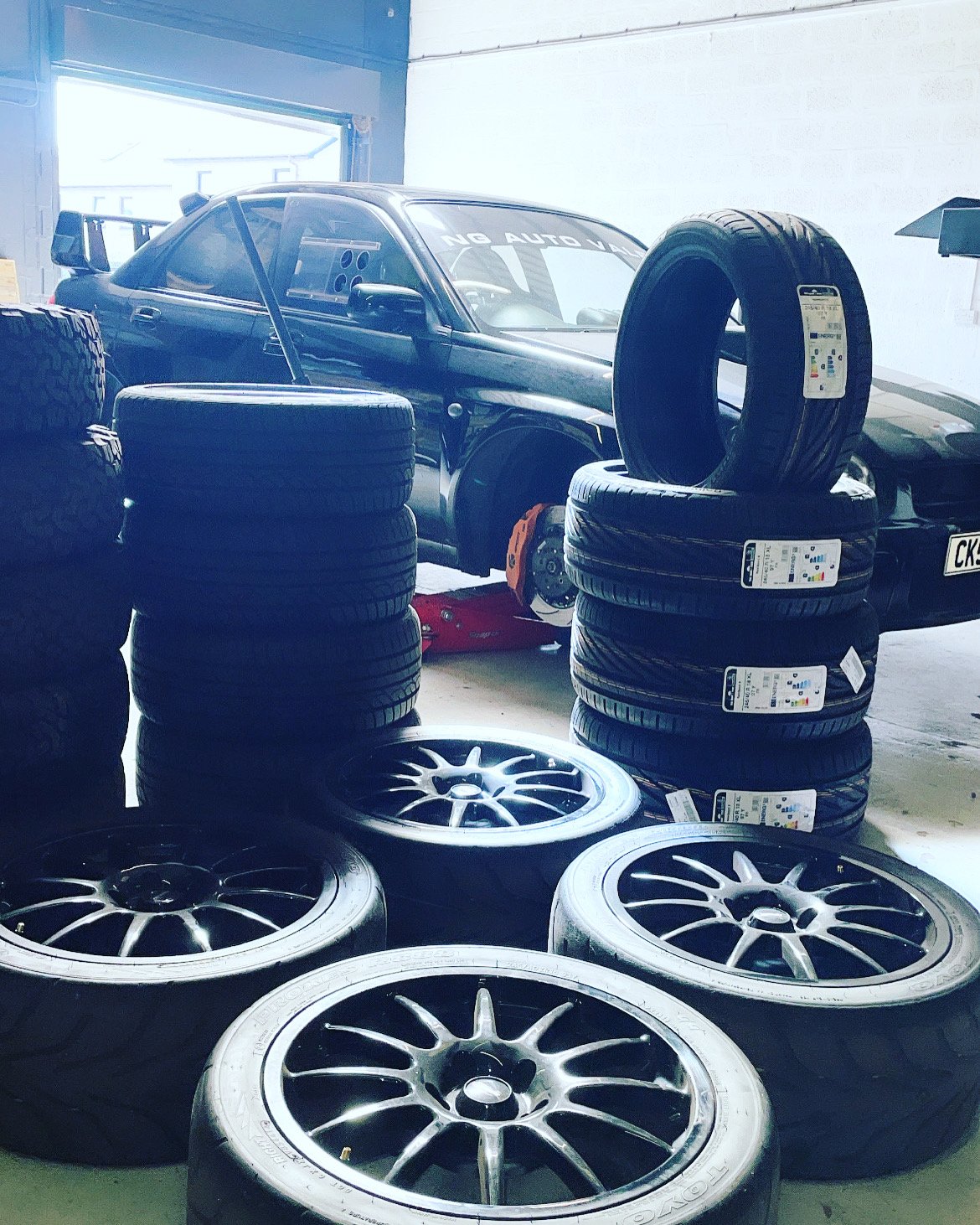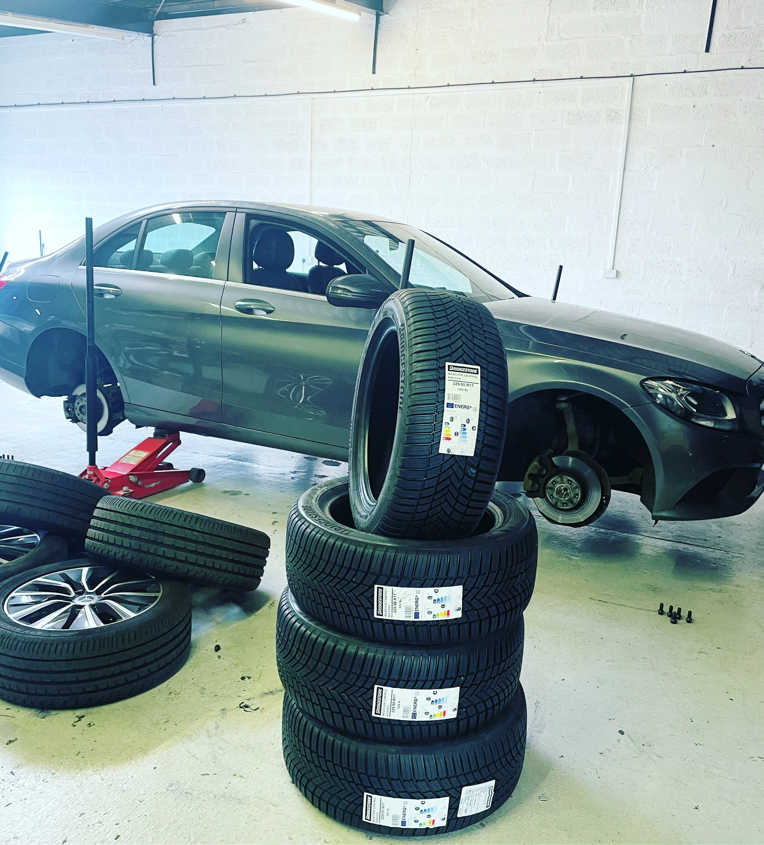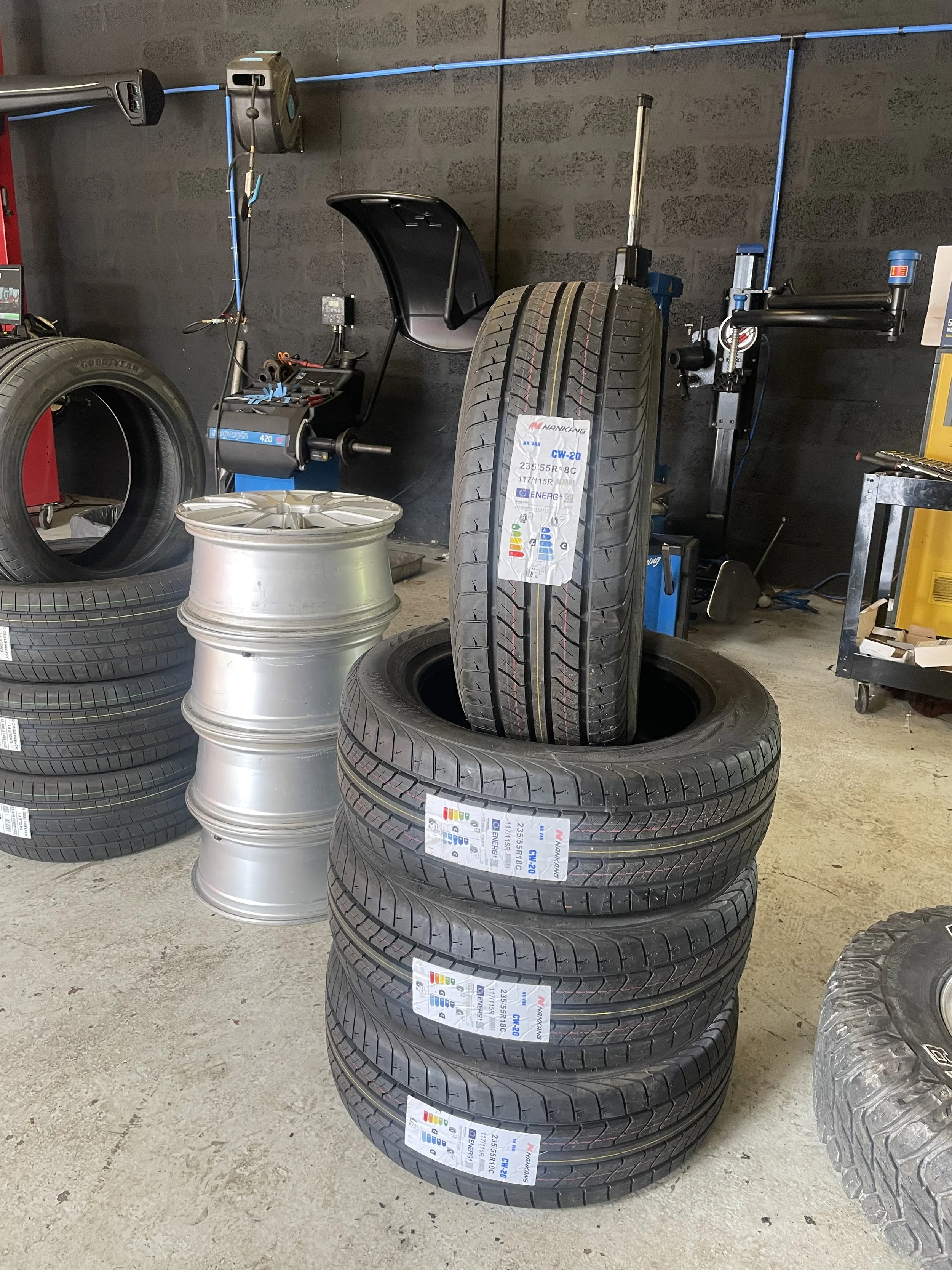 Stacked car tires with a label on each, placed in an auto repair shop with tools and equipment in the background.