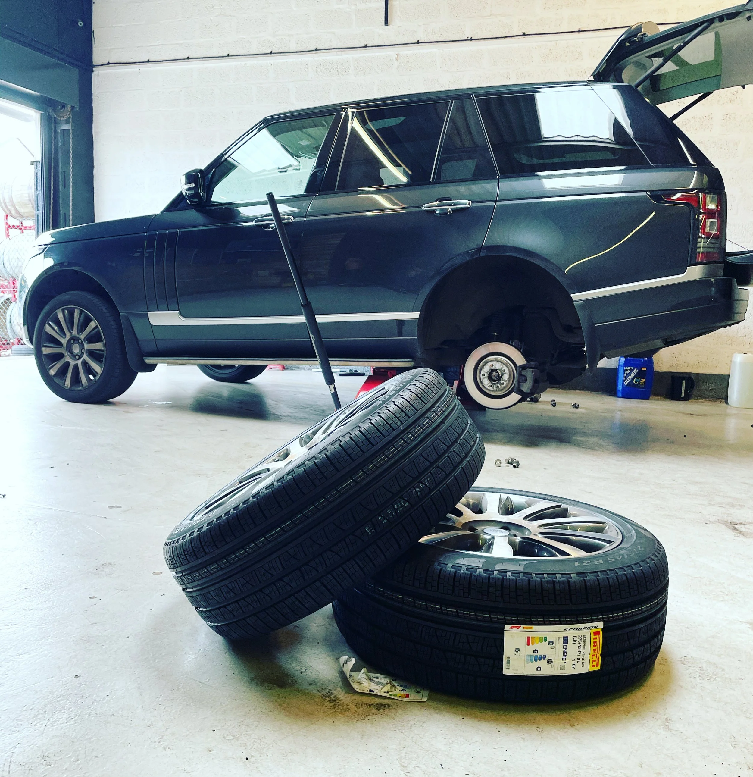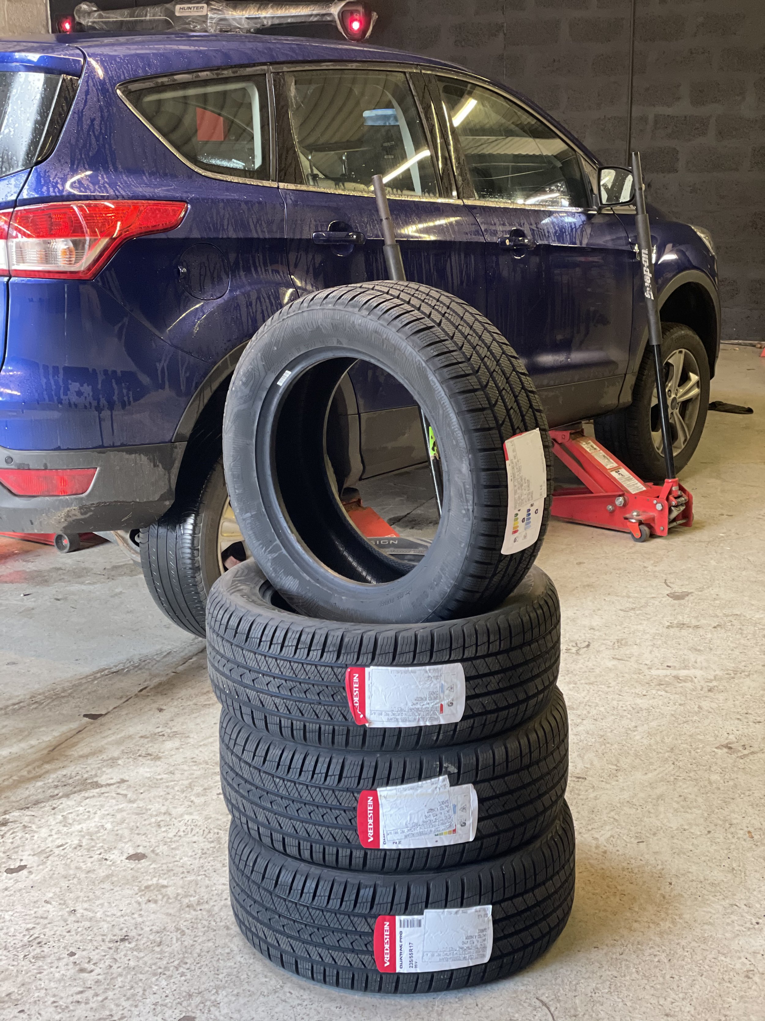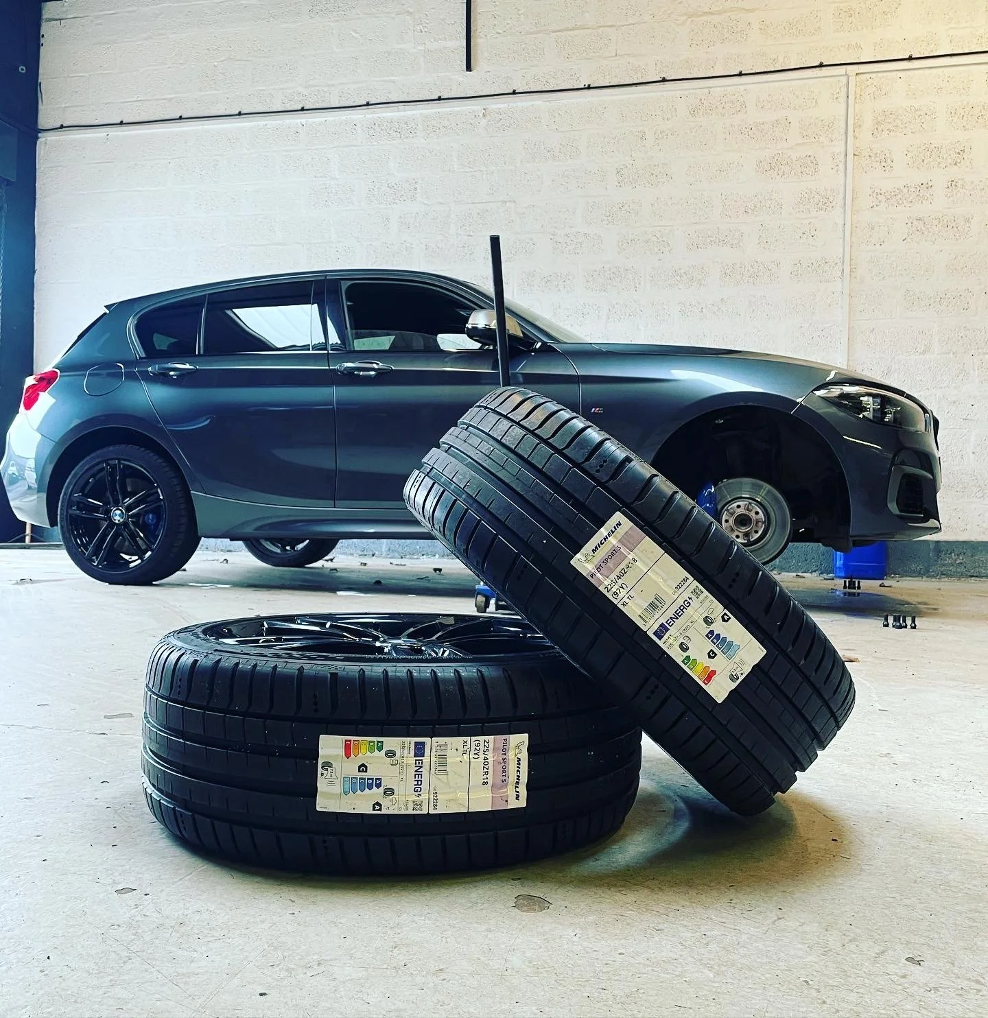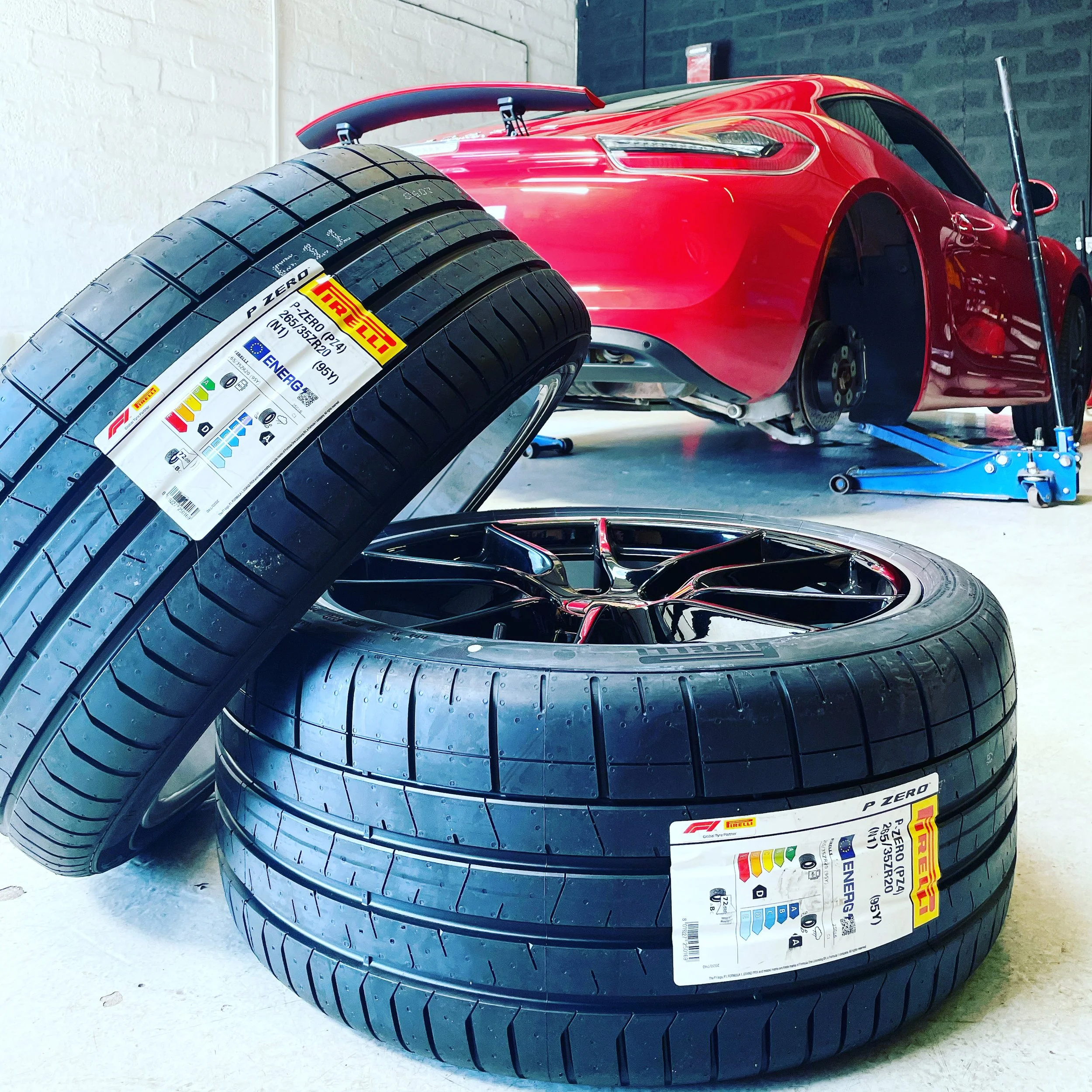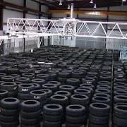 Stacked car tires with a label on each, placed in an auto repair shop with tools and equipment in the background.