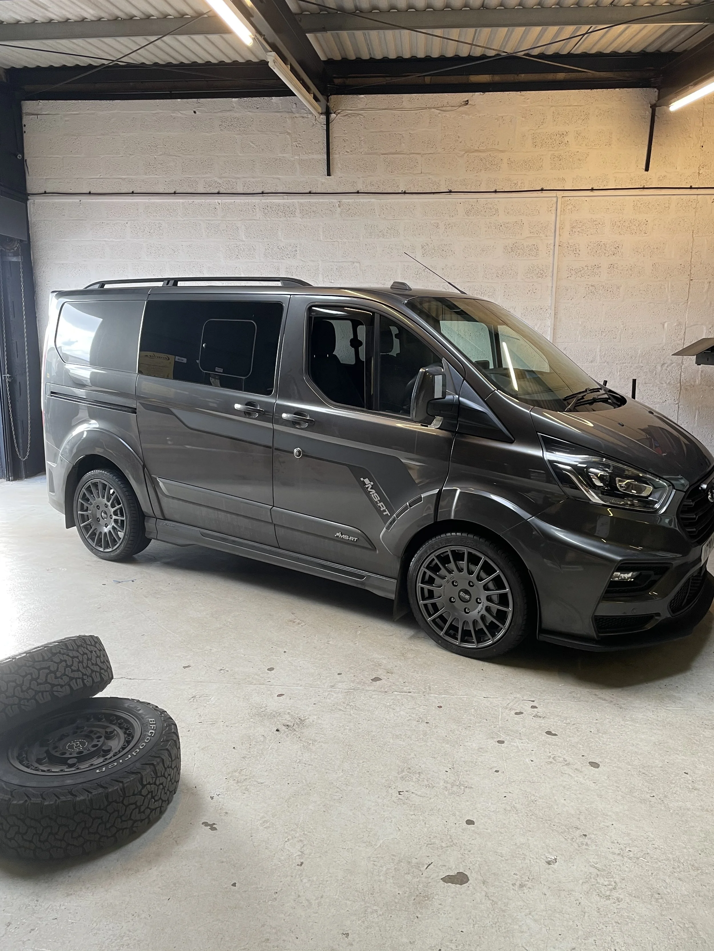 A black cargo van parked inside a garage with cardboard boxes visible inside the windows. Two spare tires on the floor in the foreground.