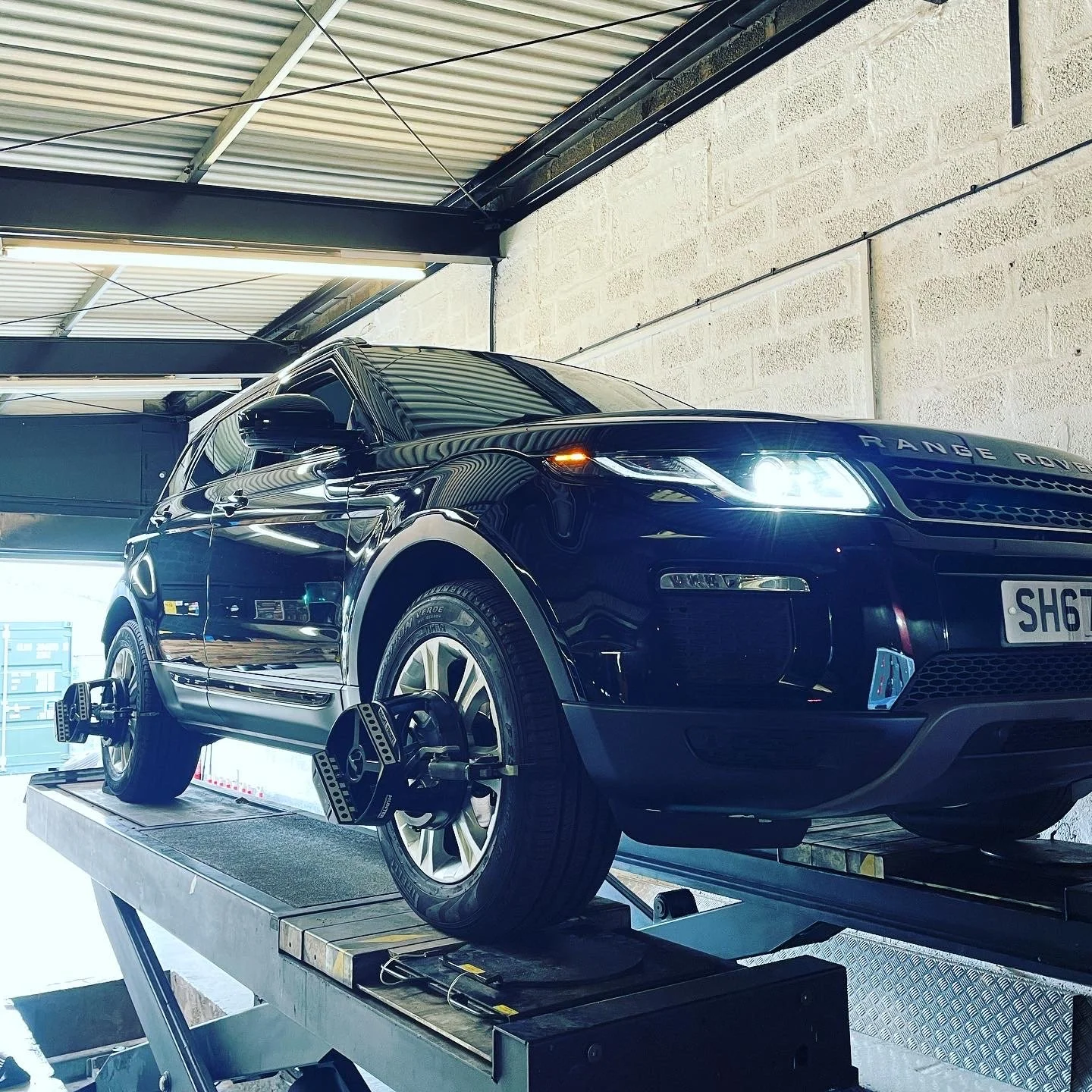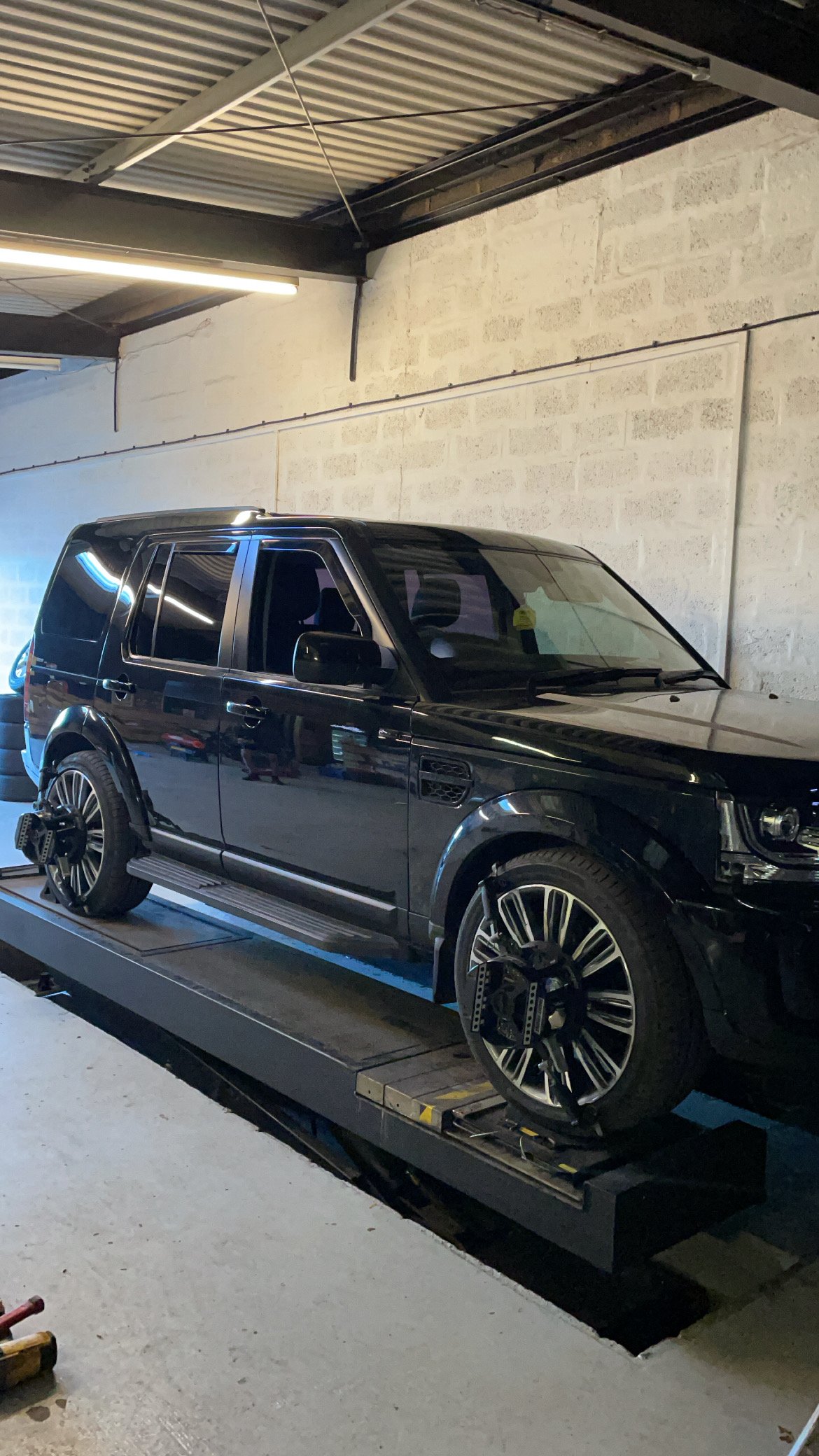 A black luxury SUV, possibly a Range Rover, is on a car testing or calibration platform inside a garage with concrete walls and steel ceiling beams.