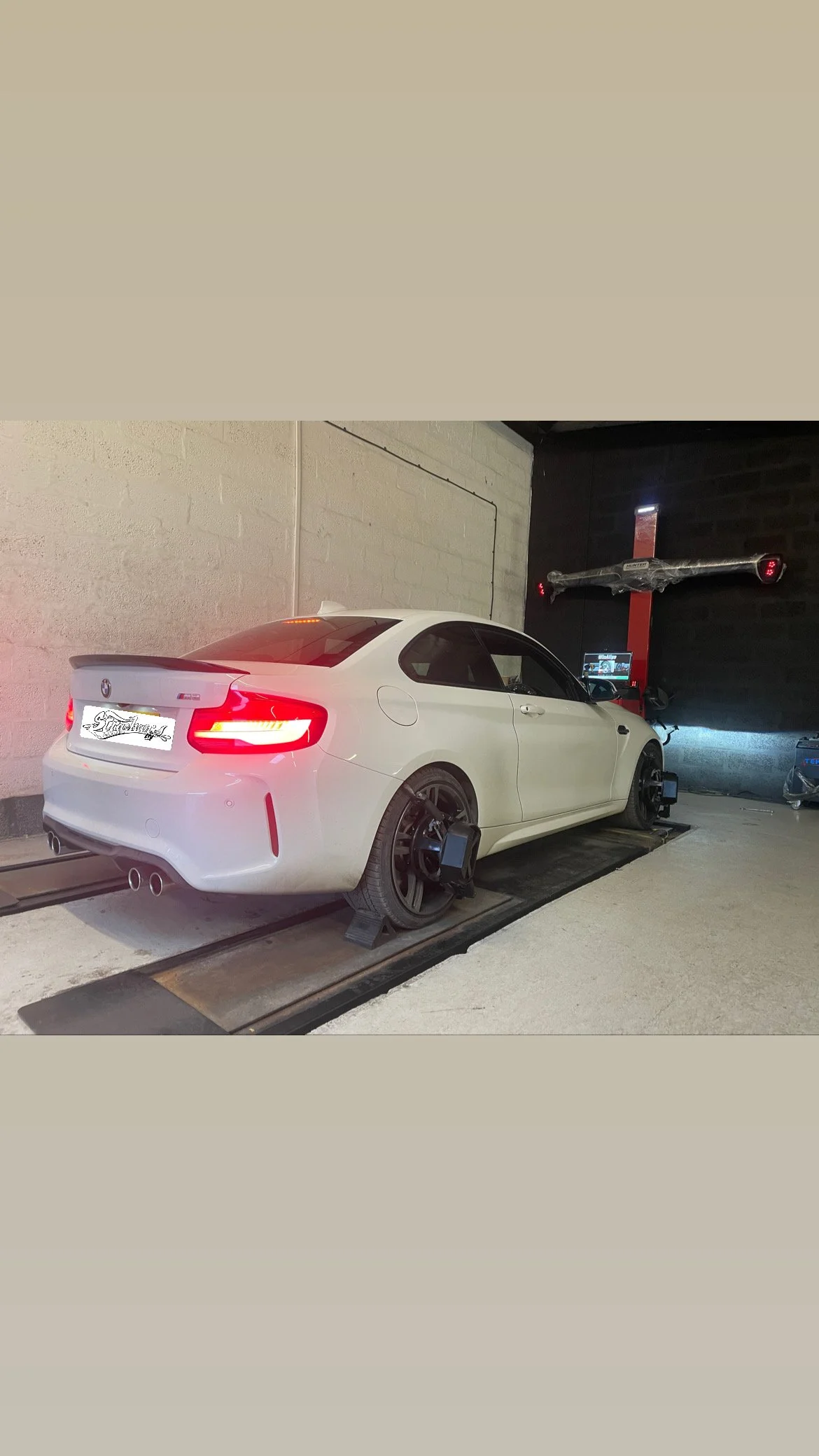 White BMW M2 sports car inside an auto repair workshop, with four black tires stacked nearby, a red hydraulic lift, and a wooden reception desk with the Strachans logo.