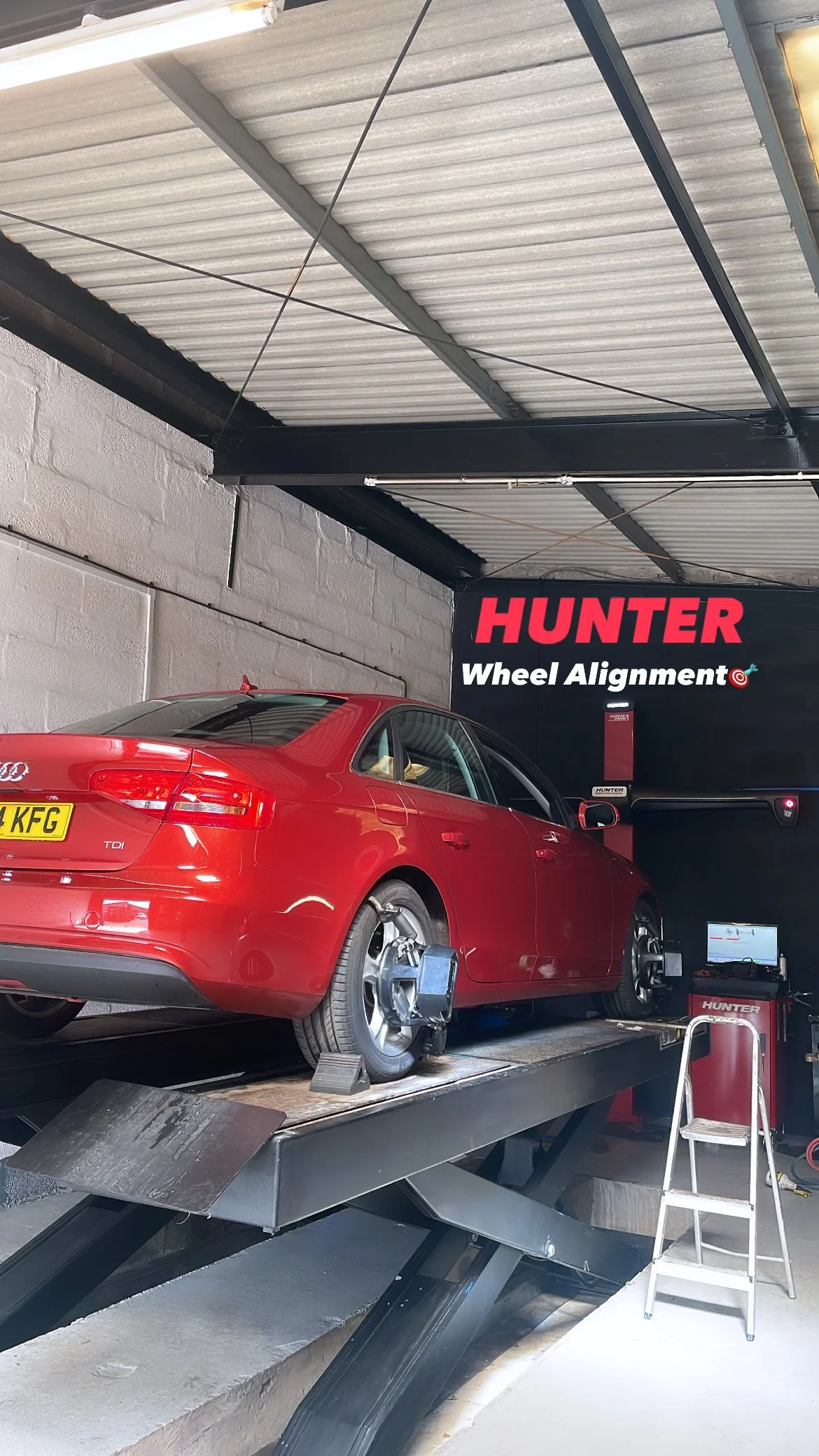 Red Audi car on a wheel alignment machine in a garage with a black wall that reads "HUNTER" and "Wheel Alignment" in white and red text.
