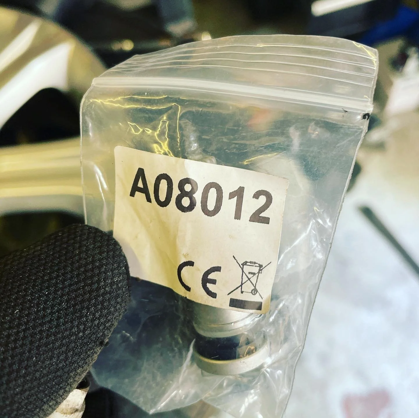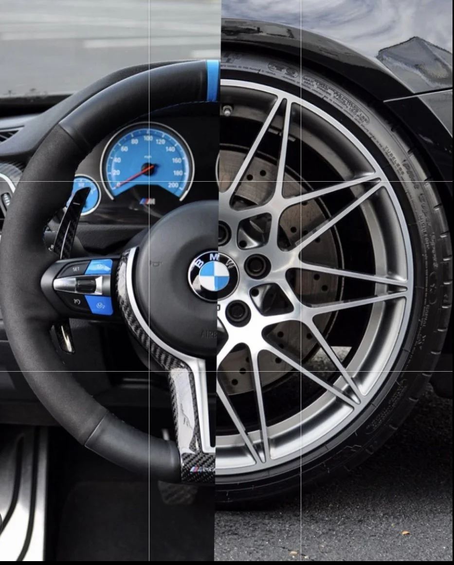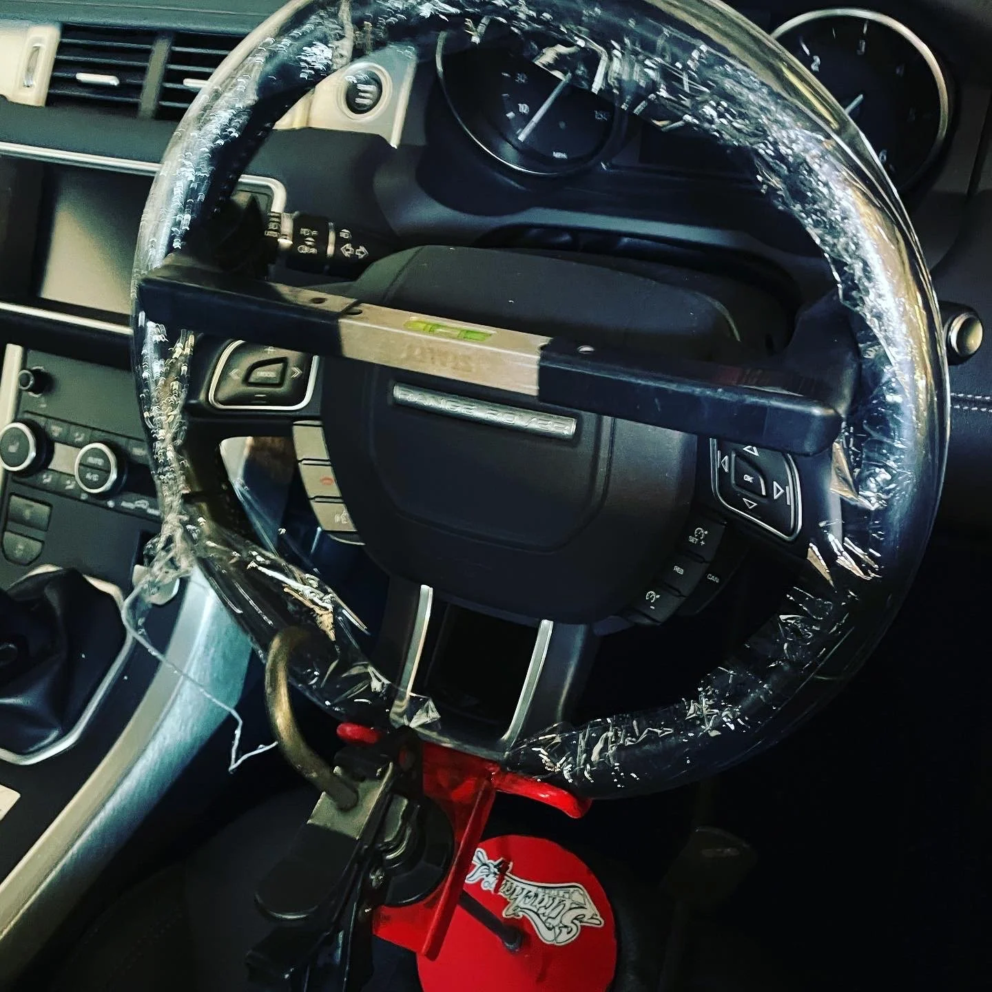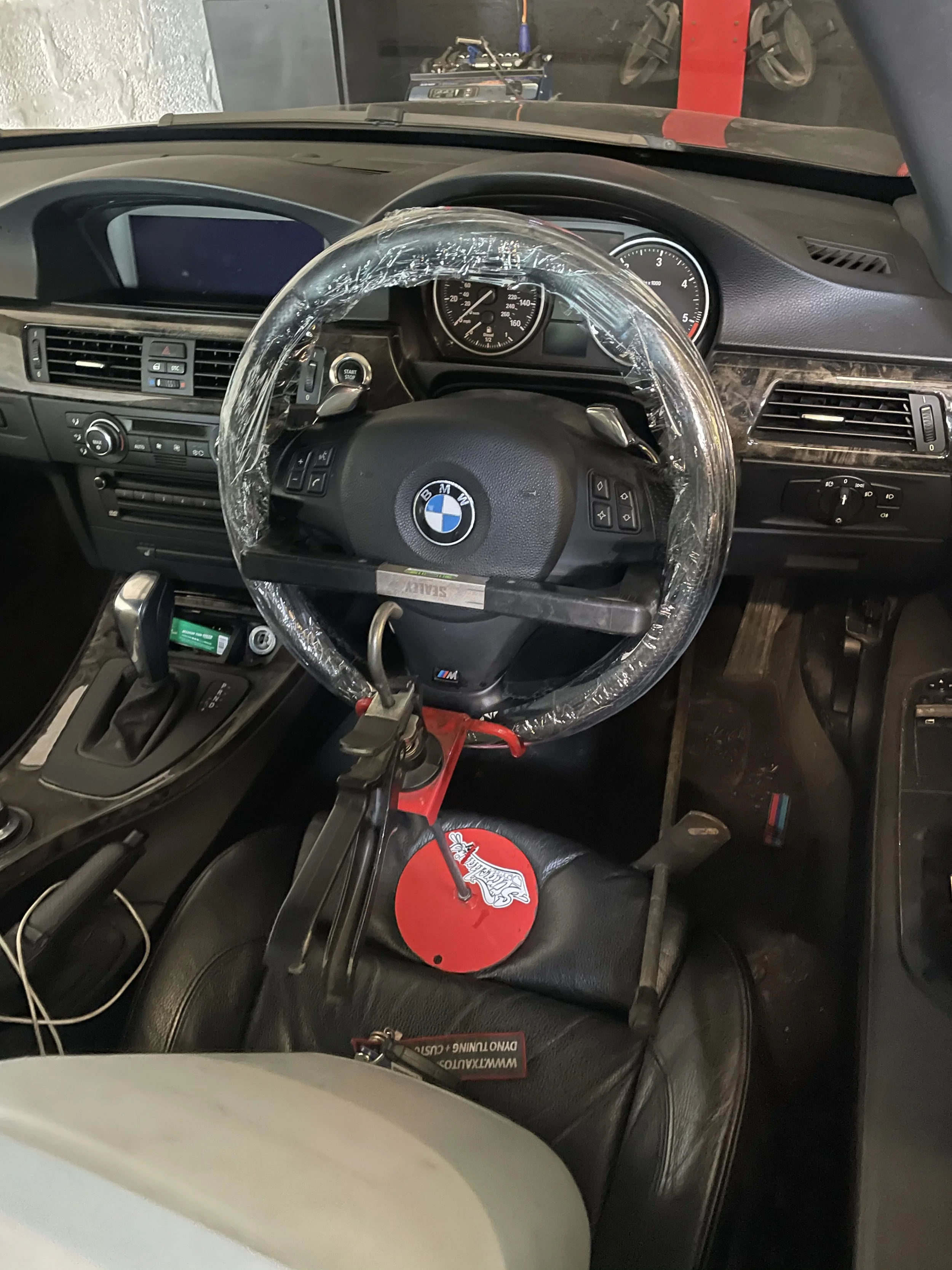 Interior of a BMW car with a steering wheel wrapped in plastic, a gear shifter, and various controls. There are tools and a red hanging hook in the background.