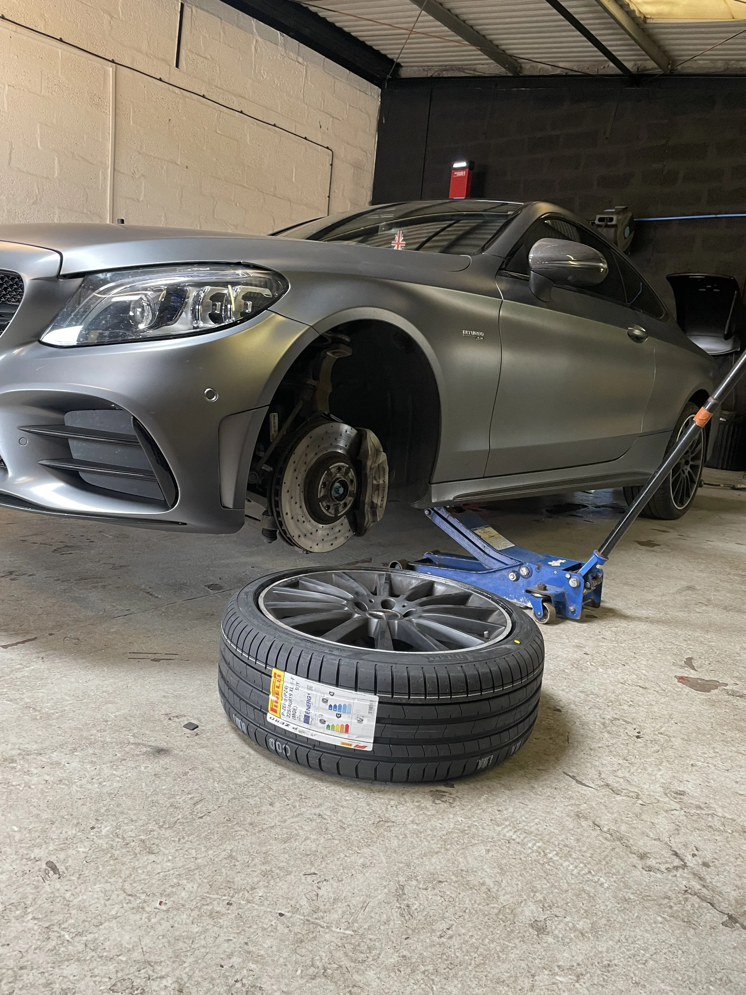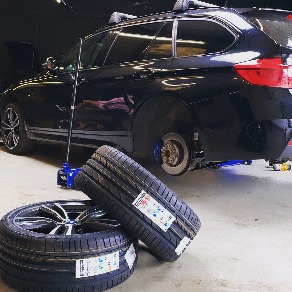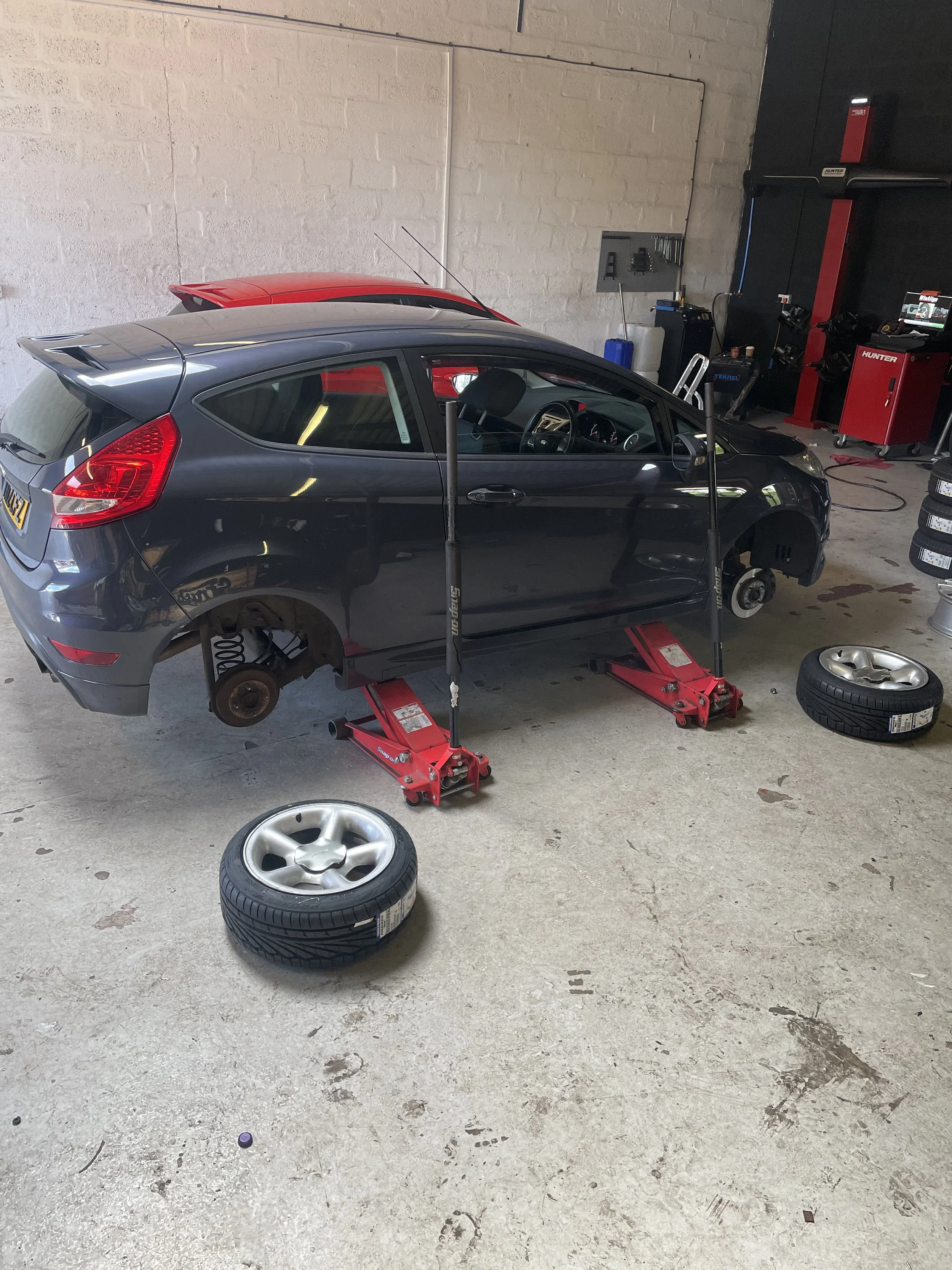 A black hatchback car is on a hydraulic lift on all four sides, with the two front wheels removed. Two tires with silver rims are on the ground nearby. The car is inside a garage with a white brick wall and various tools and equipment in the backgrou