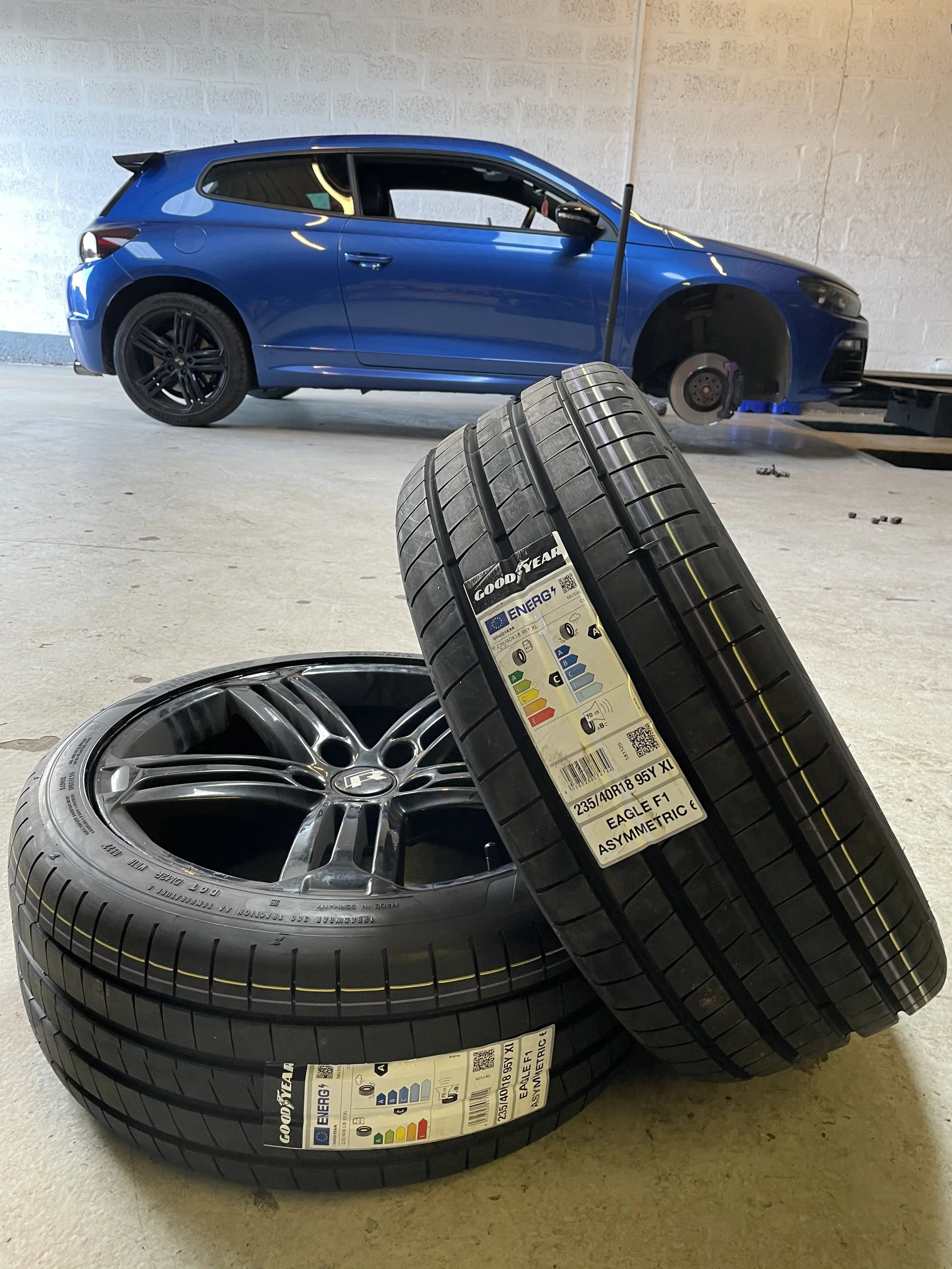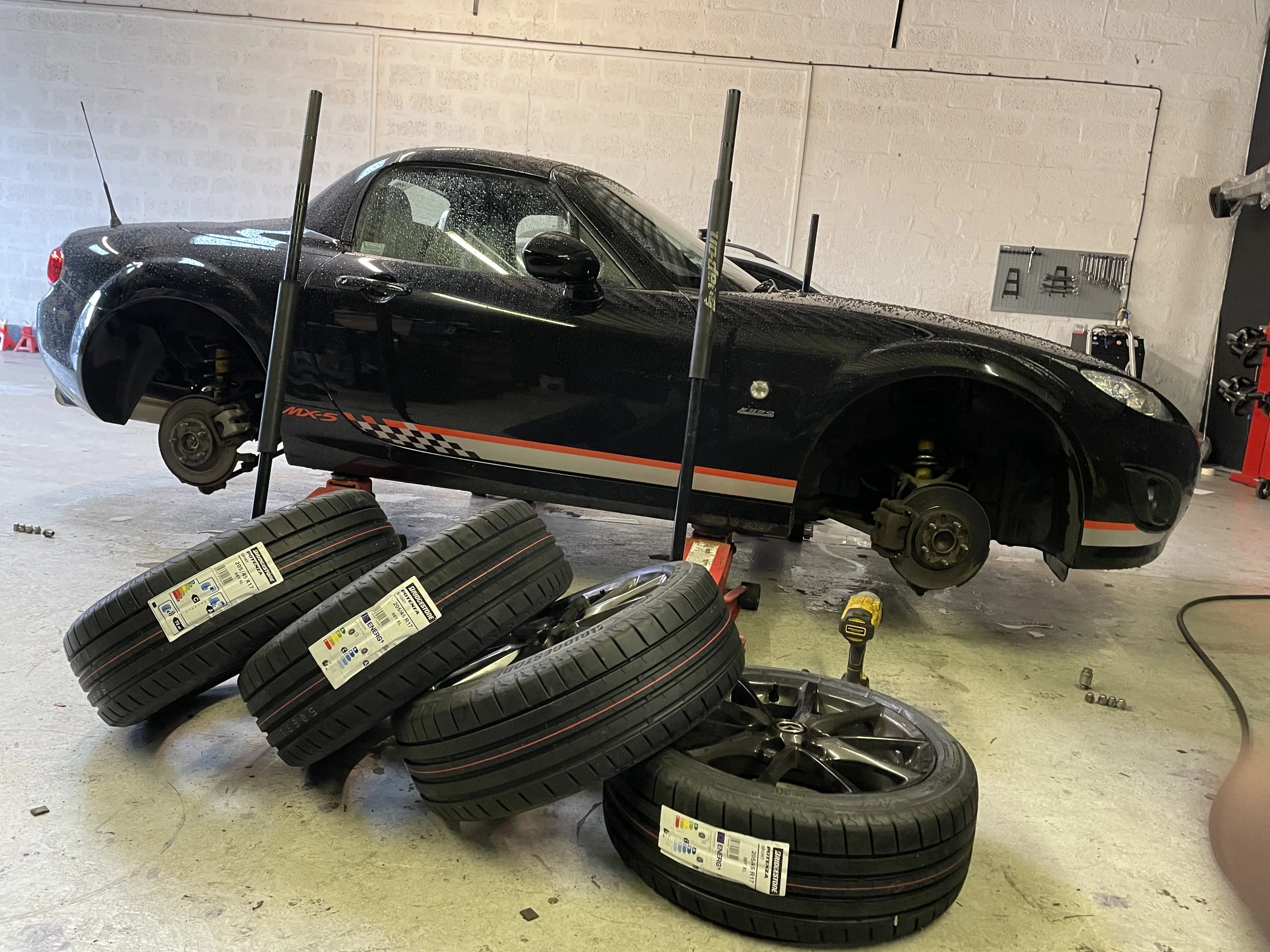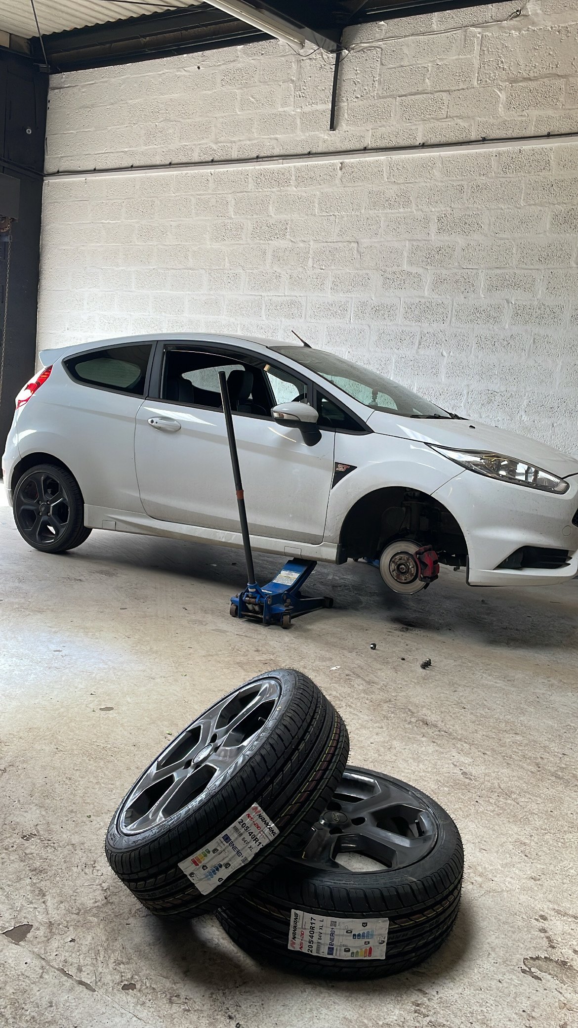 A white hatchback car is lifted on a hydraulic jack with one missing front wheel in a garage. There are two new tires with rims stacked on the concrete floor in the foreground.
