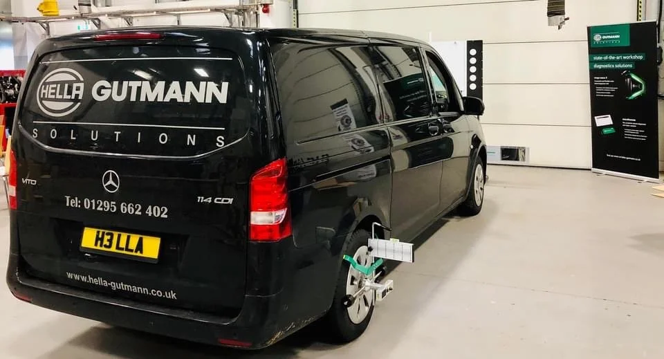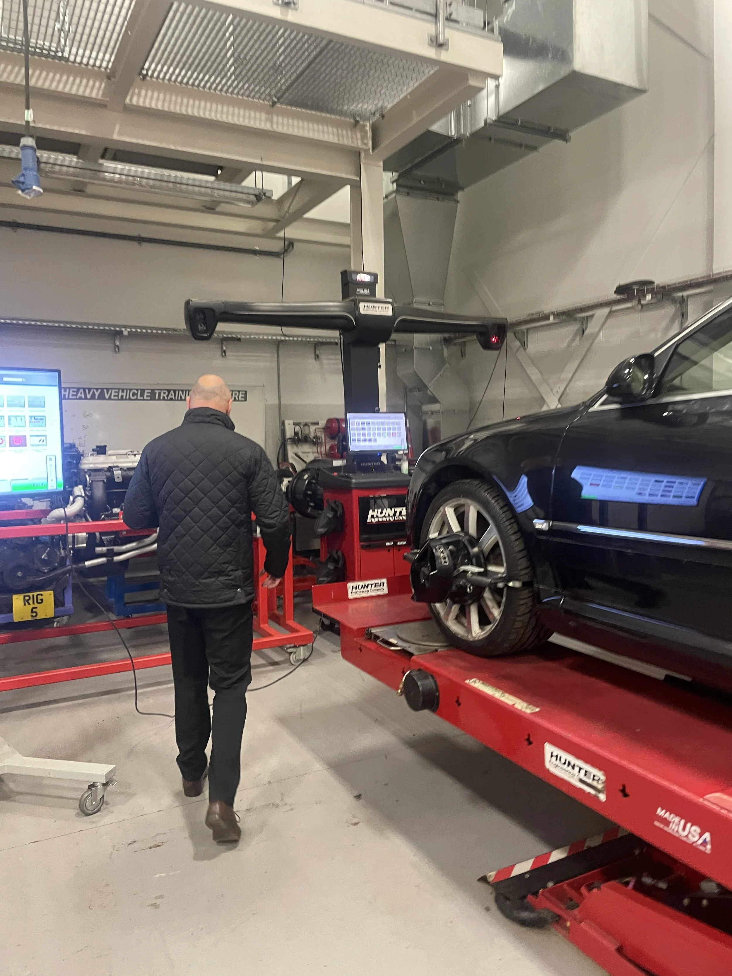 A black sports car mounted on a hydraulic lift in a workshop with text overlay advertising Hunter 4 Wheel Alignment services.