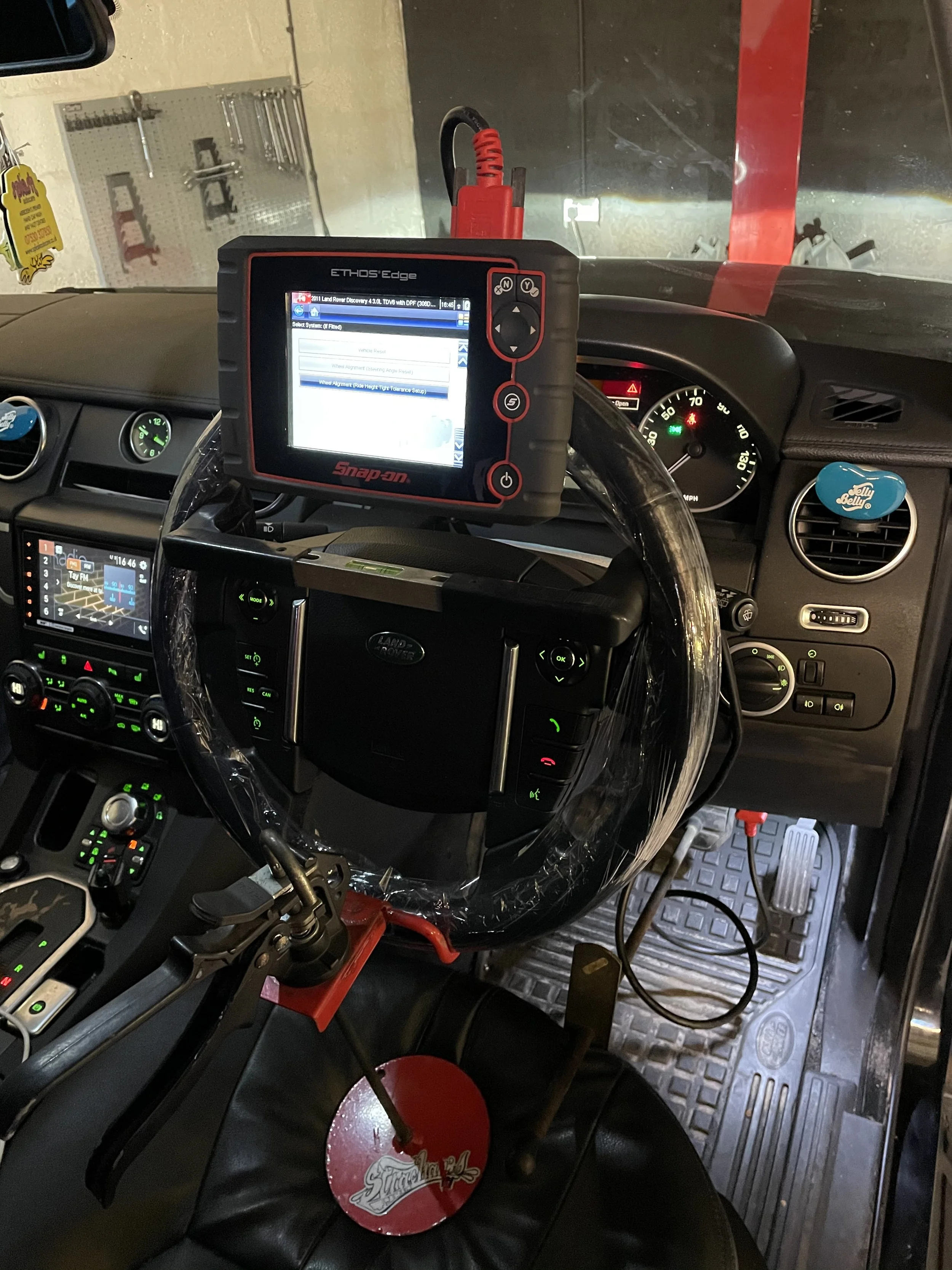 Inside the front cabin of a vehicle, showing the steering wheel, dashboard, and diagnostic tools connected to the vehicle.