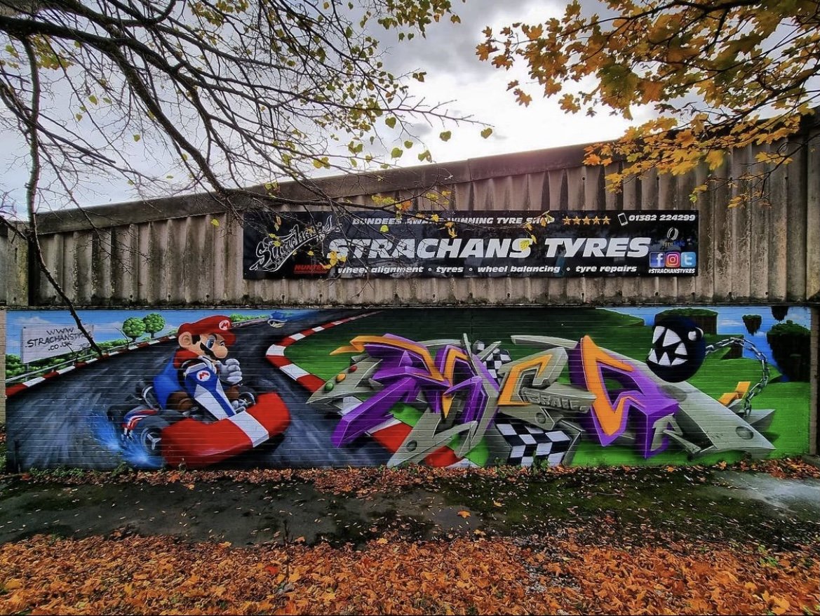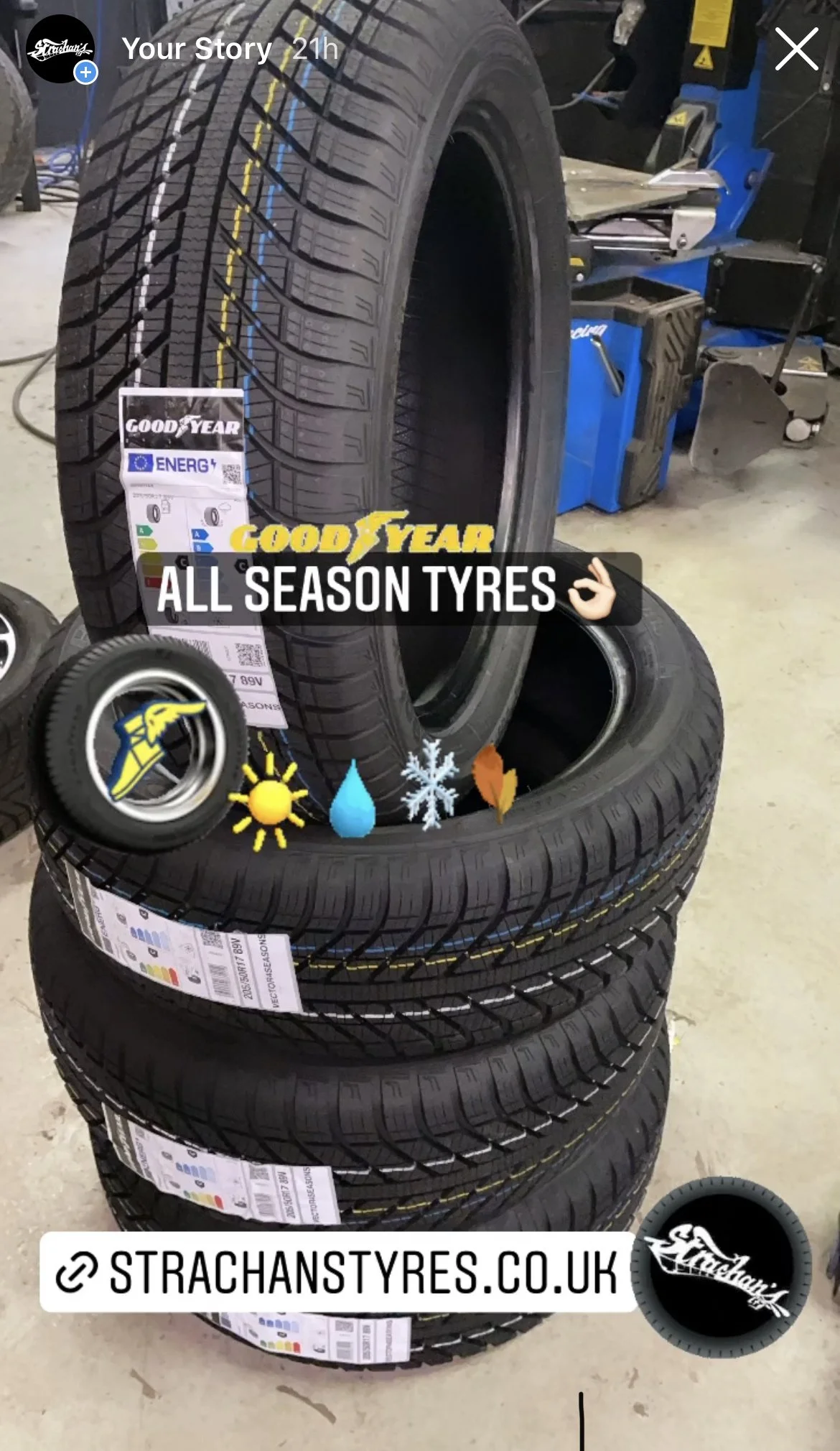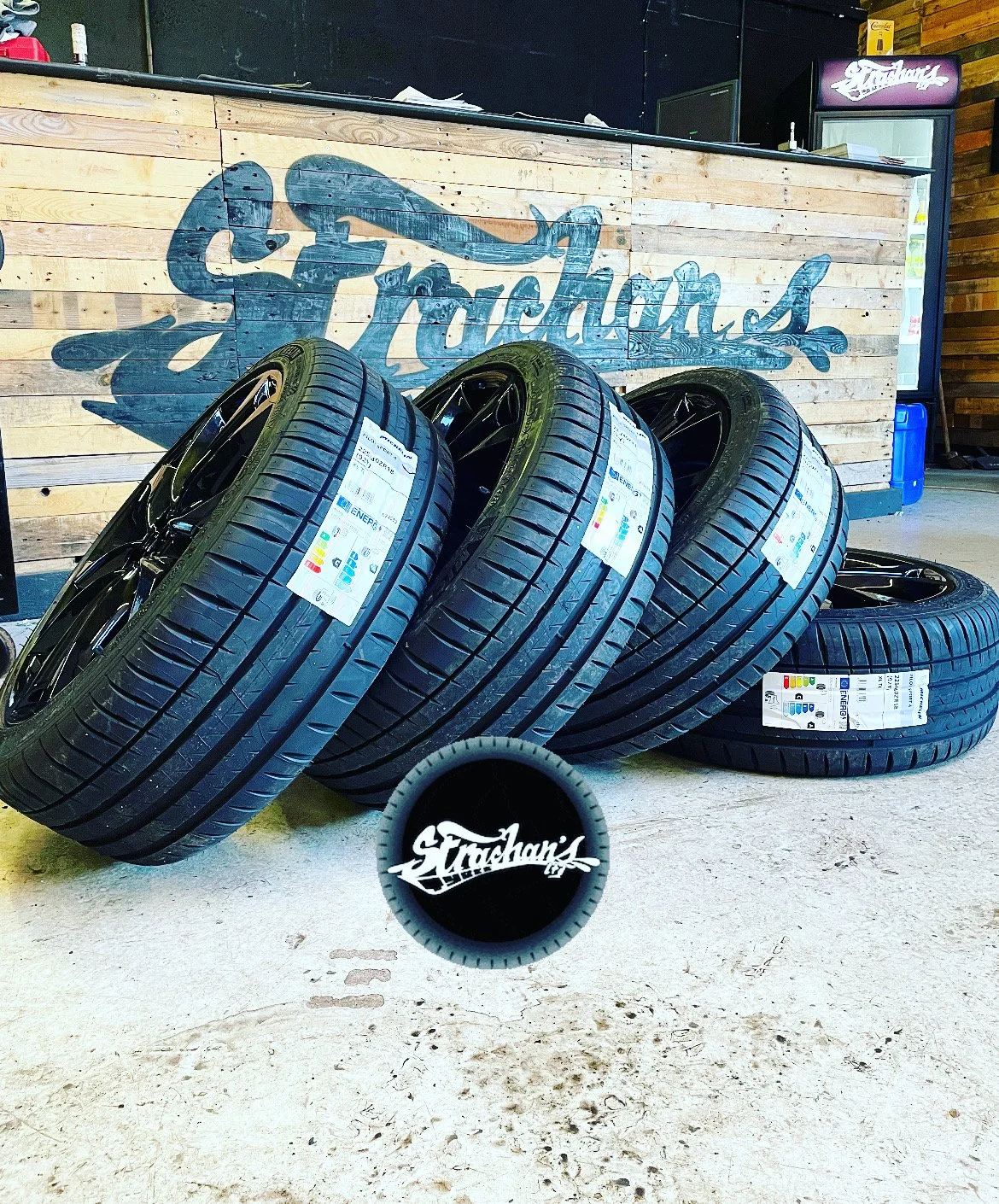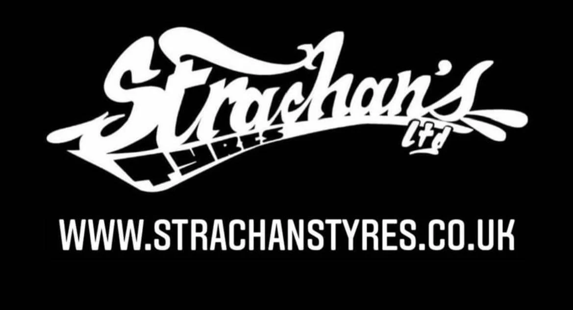 Black background with white text displaying the logo and website for Strachan Tyres, a UK tire company.