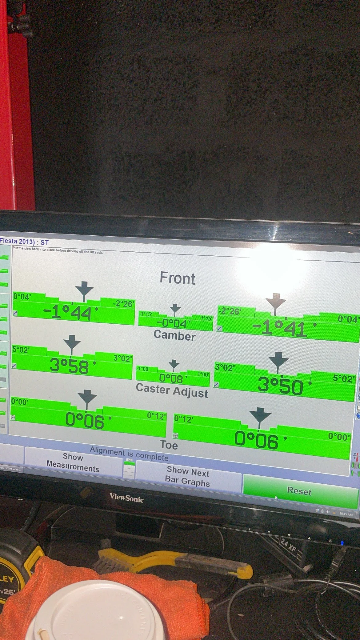 Golf club alignment measurements displayed on a computer screen, showing front, camber, caster adjustment, and toe angles in green and gray with measurement details.