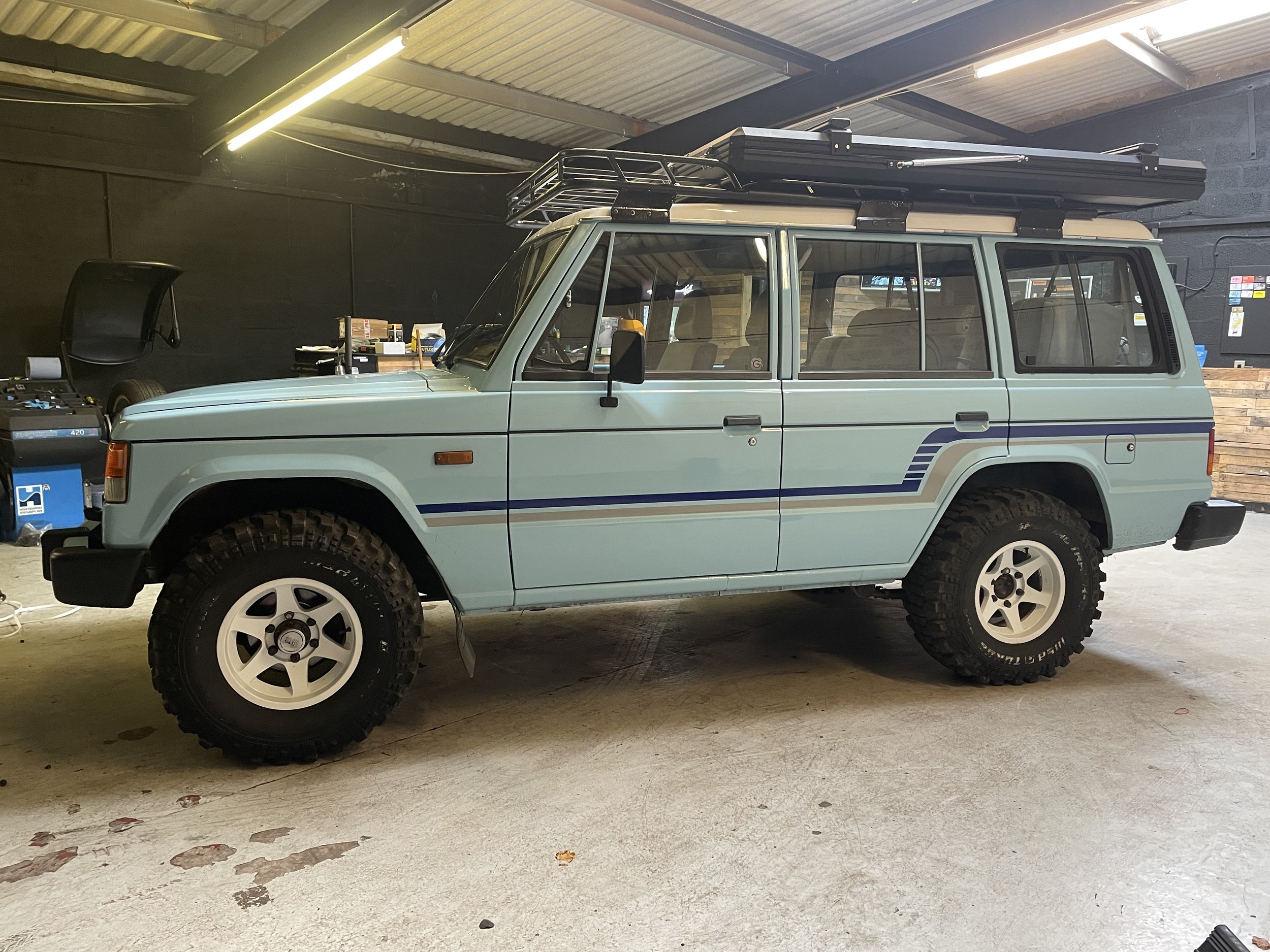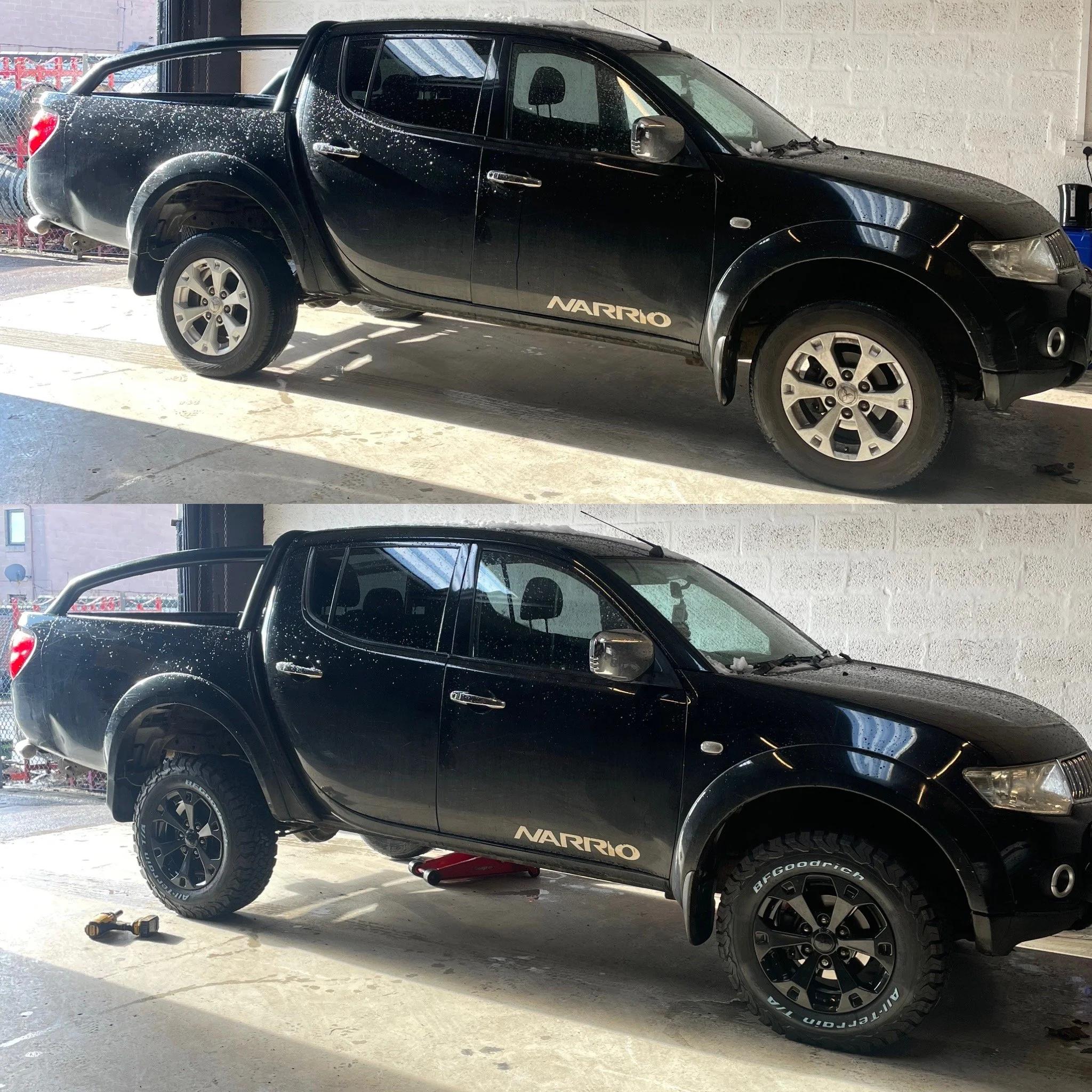 Side view of a black Nissan Navarra pickup truck with the rear wheel lifted, showing the installation of off-road tires in the second image. The truck is indoors with tools on the floor nearby.