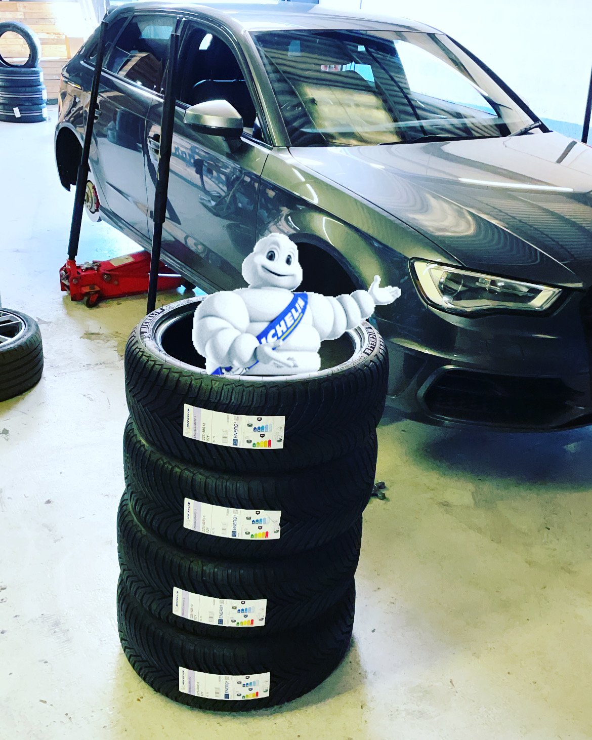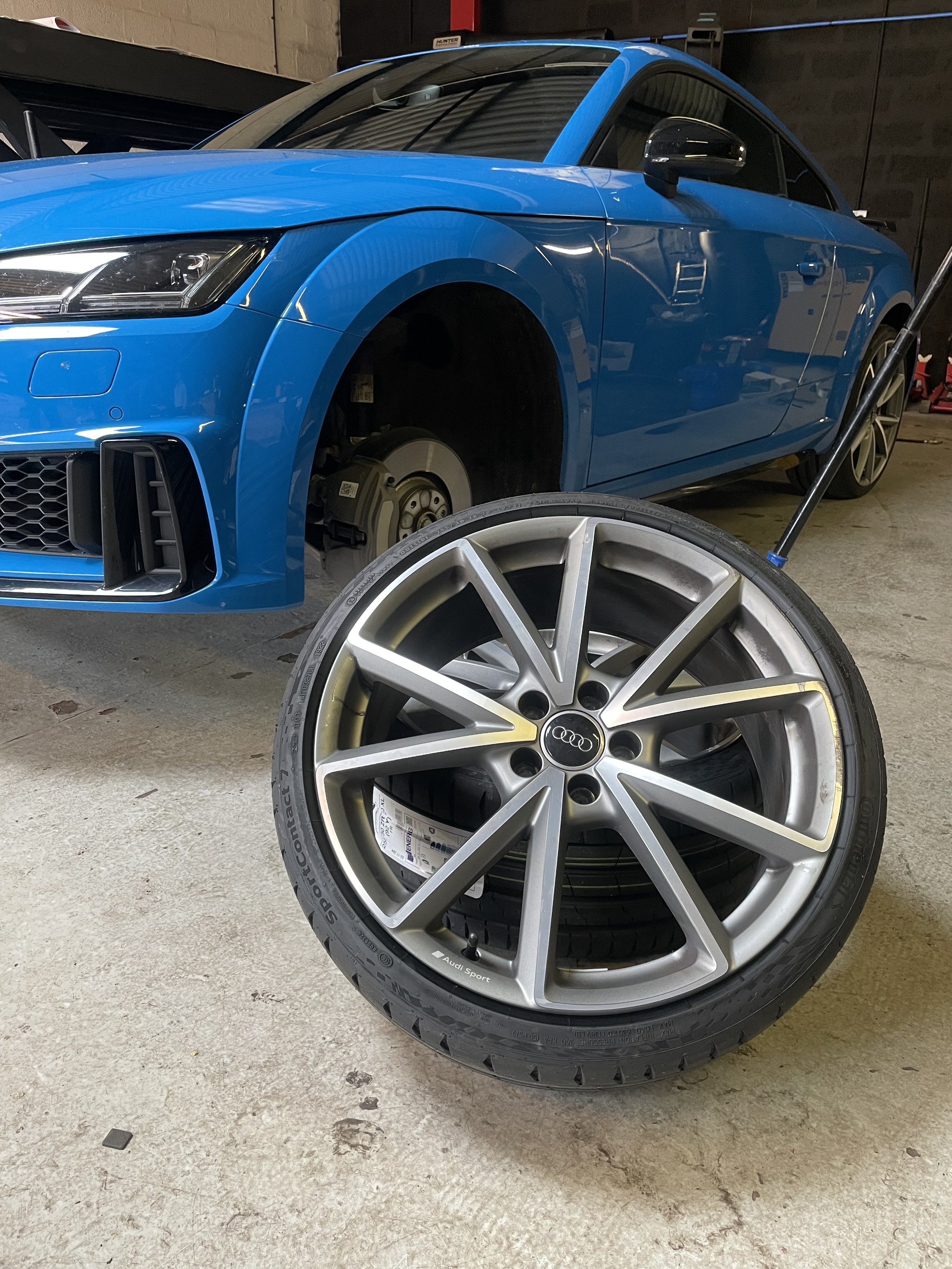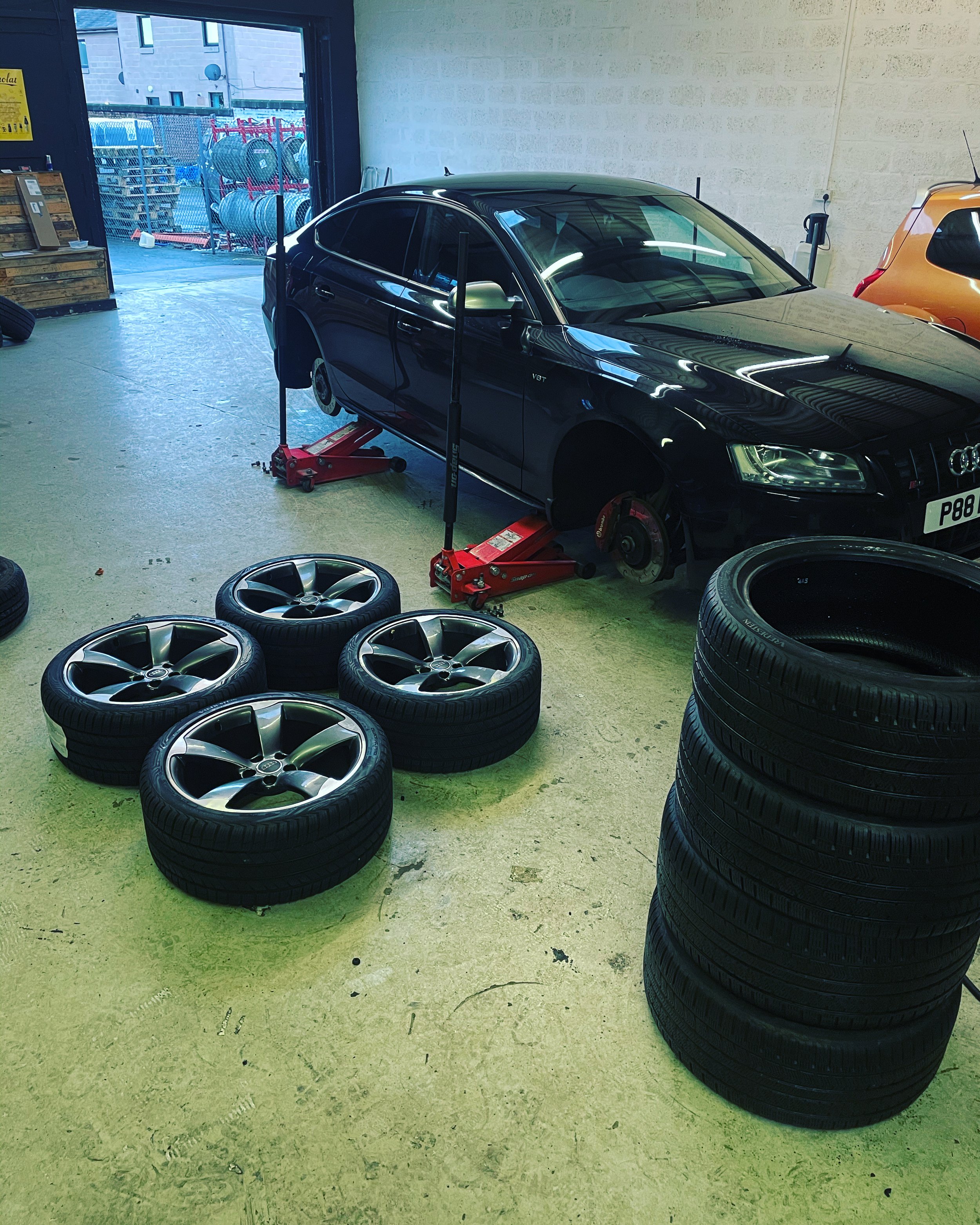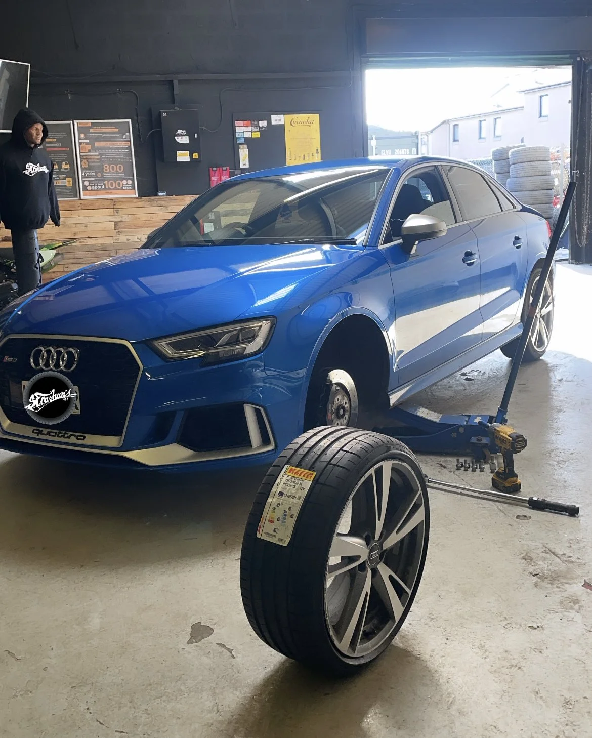 A blue Audi car is in a garage with its front wheel removed. A new tire with alloy rim is leaning against the car, showing the Audi logo on the center cap.
