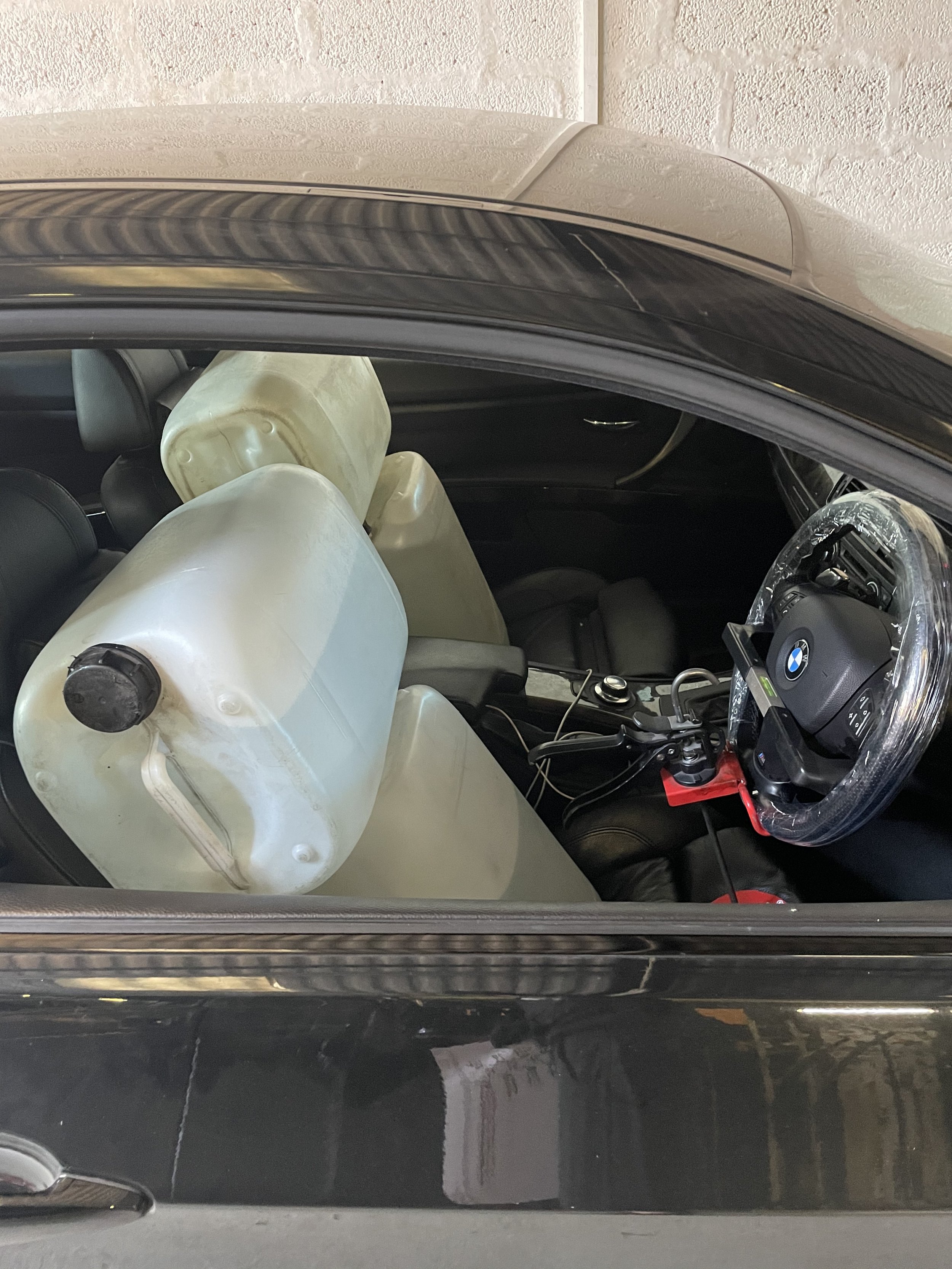 The interior of a black car with two large yellowish-white plastic containers placed on the front seats. The steering wheel has a BMW logo, and the dashboard is visible.