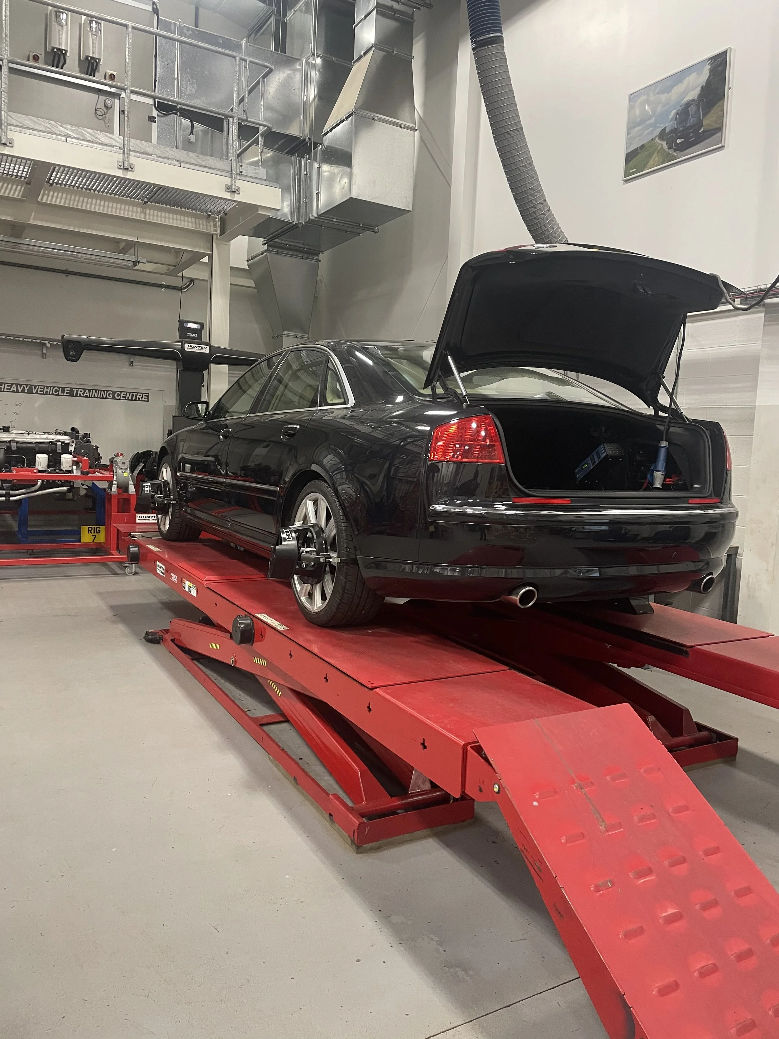 A black Audi car elevated on red hydraulic lifts inside an auto repair shop, with four alloy wheels on the floor nearby and a stack of tires to the right. The background shows an open door with outdoor equipment visible.