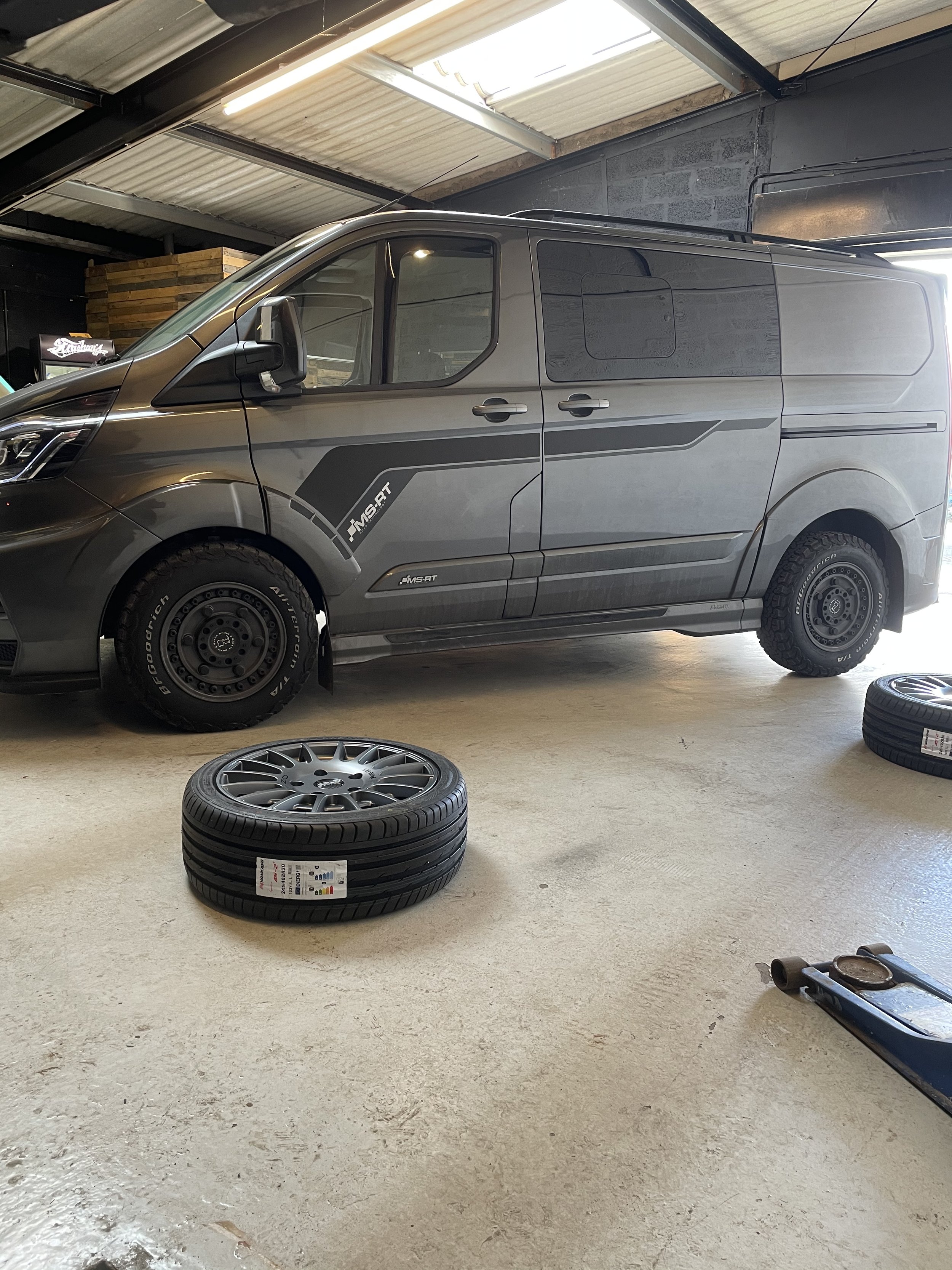 A gray van with black wheels parked inside a garage, with two other tires on the floor and a jack nearby.