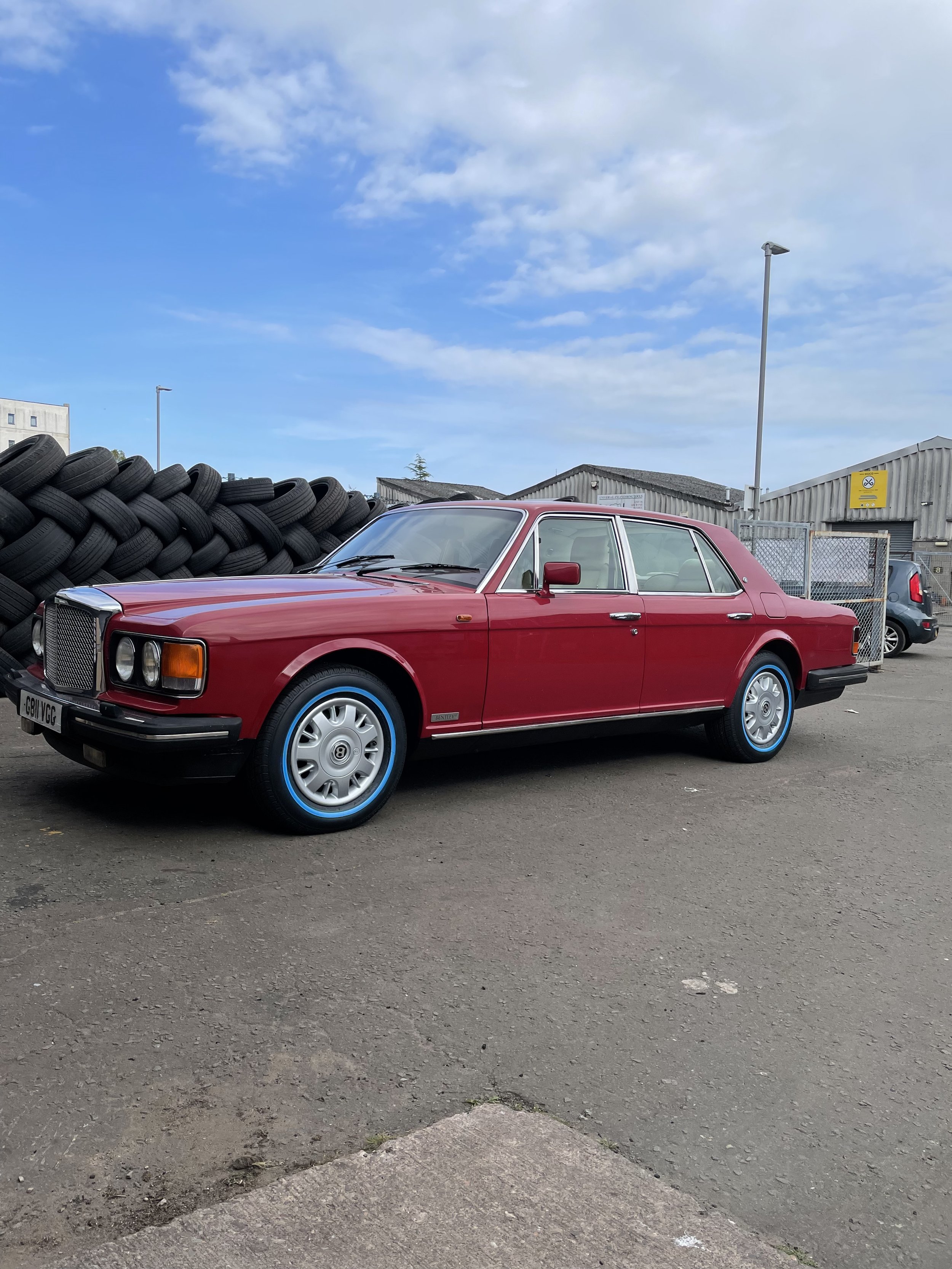 A vintage red sedan parked on a paved lot, with a stack of tires and industrial buildings in the background.