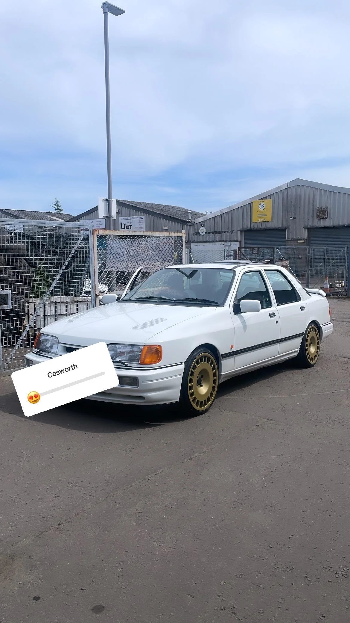 A white vintage sedan with gold alloy wheels parked outdoors near a chain-link fence, with industrial buildings in the background and a streetlight above.