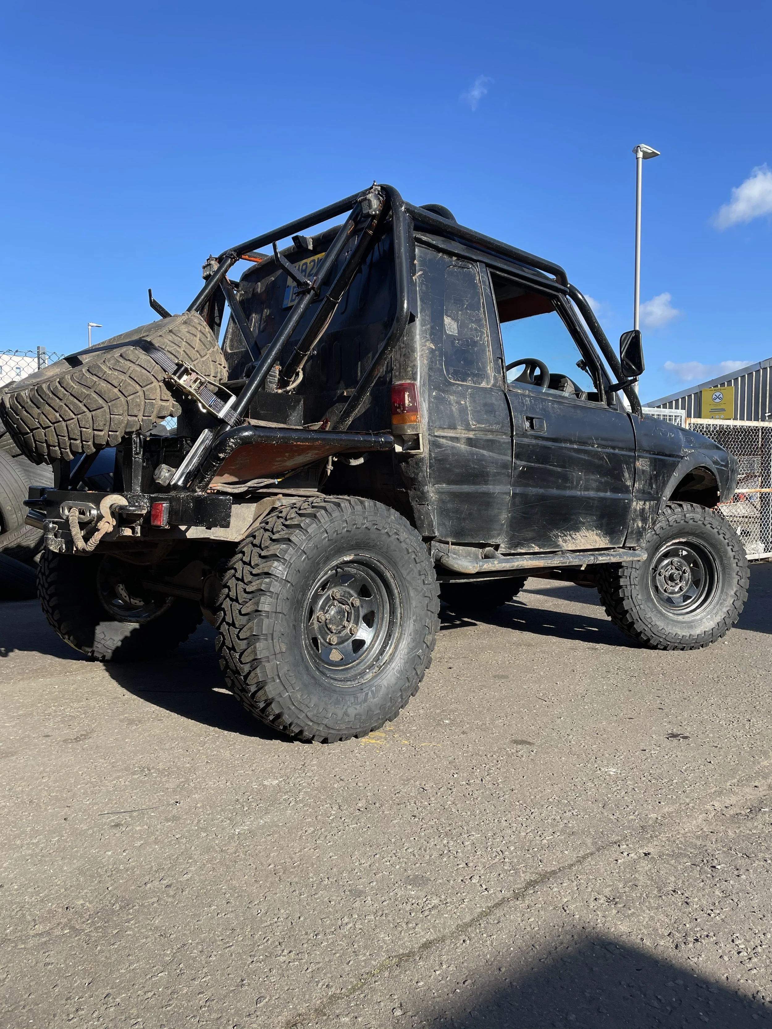 A black off-road vehicle with large tires, a spare tire mounted on the rear, and a roll cage, parked on a paved surface against a background of a chain-link fence, industrial buildings, and a clear blue sky.
