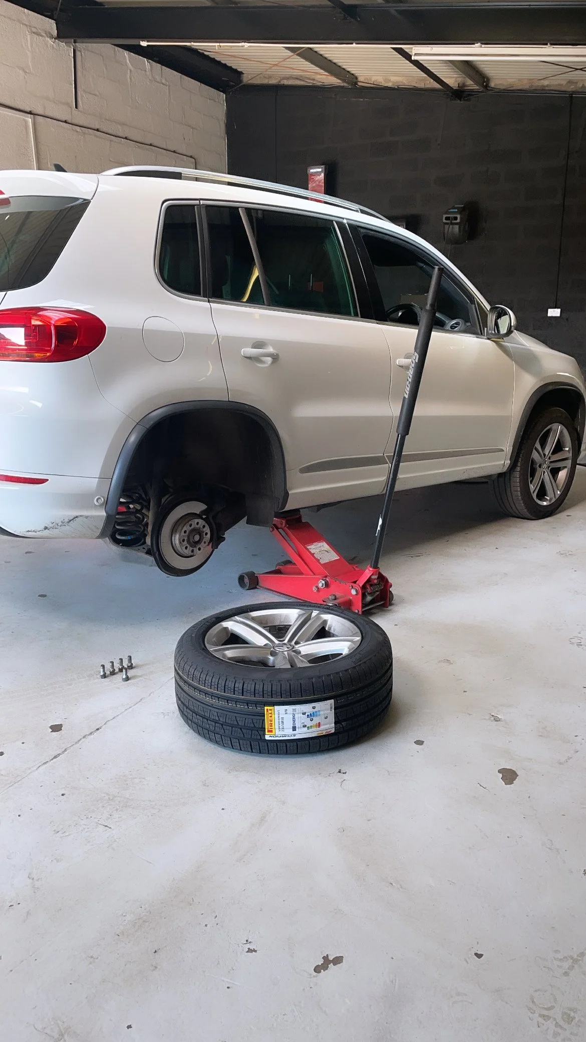 A white SUV is raised on a hydraulic jack in a garage, with a new tire and wheel stored in front of it. The vehicle's rear left wheel is removed, exposing the brake disc and suspension. Four lug nuts are on the floor nearby.
