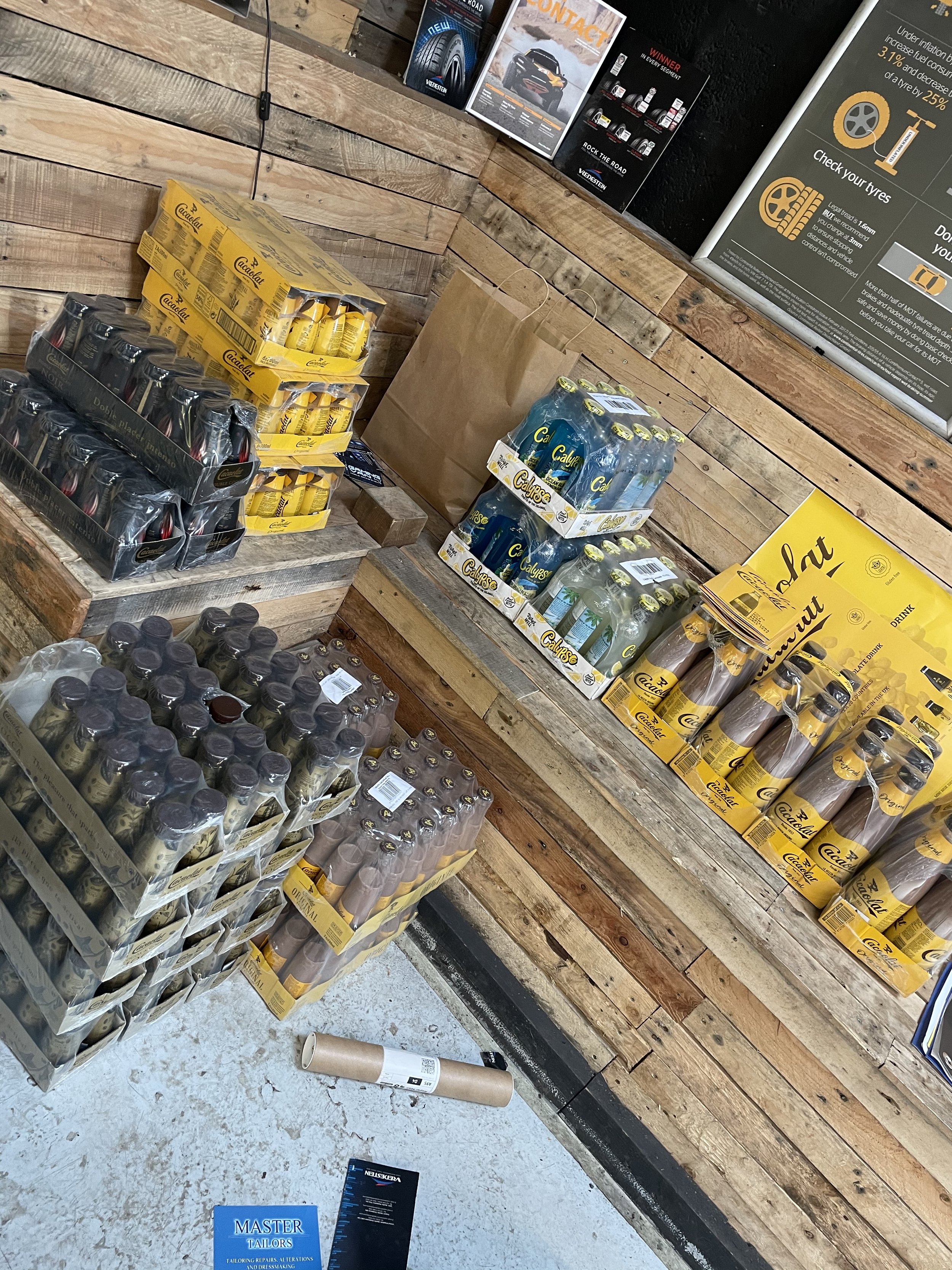 A rustic wooden counter with a black script sign that reads 'Stachans' and a sliced plant leaf design. Items on top include packages and papers.