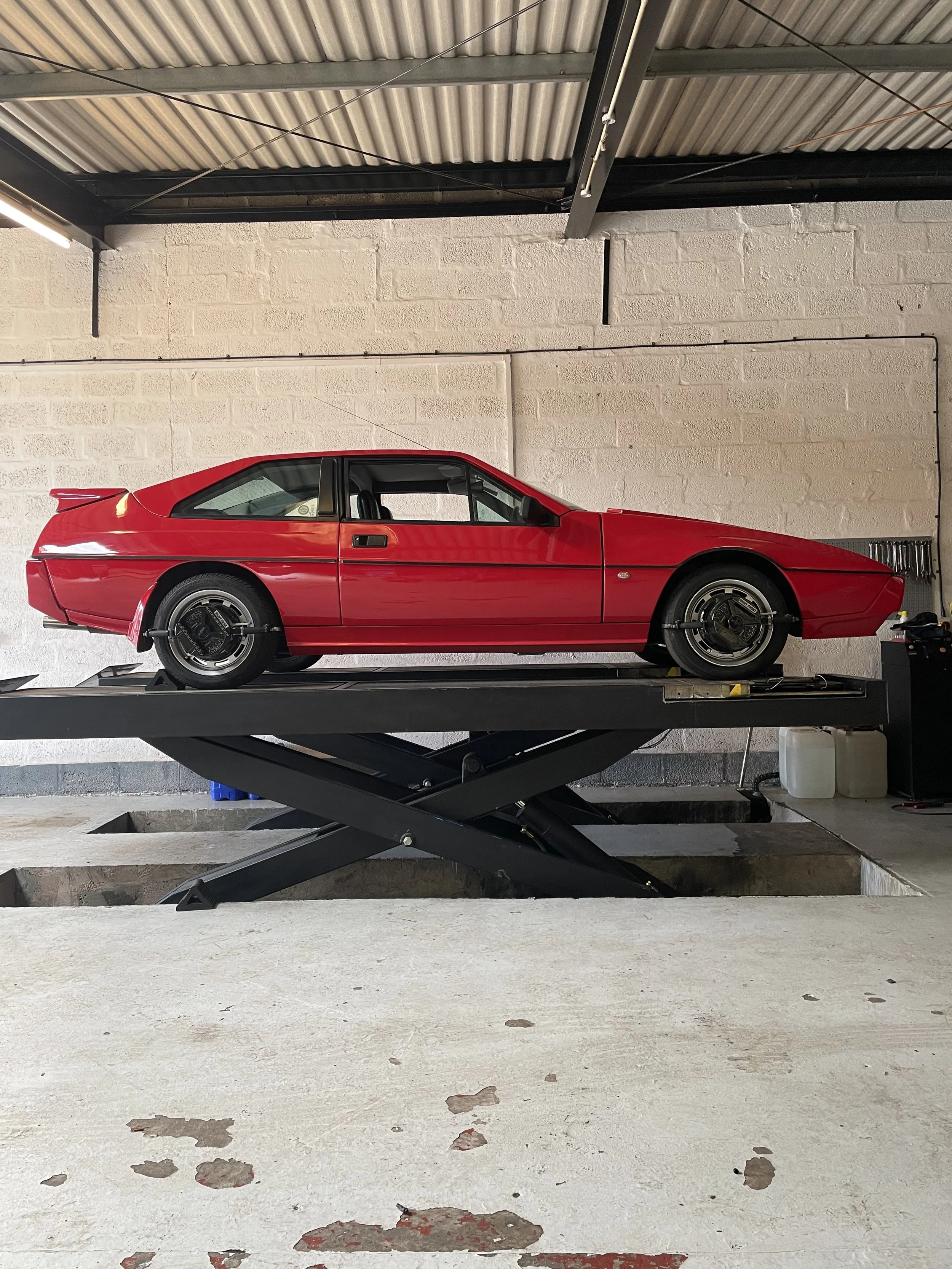 Red vintage sports car on a hydraulic lift inside a garage, with a concrete wall and metal ceiling in the background.