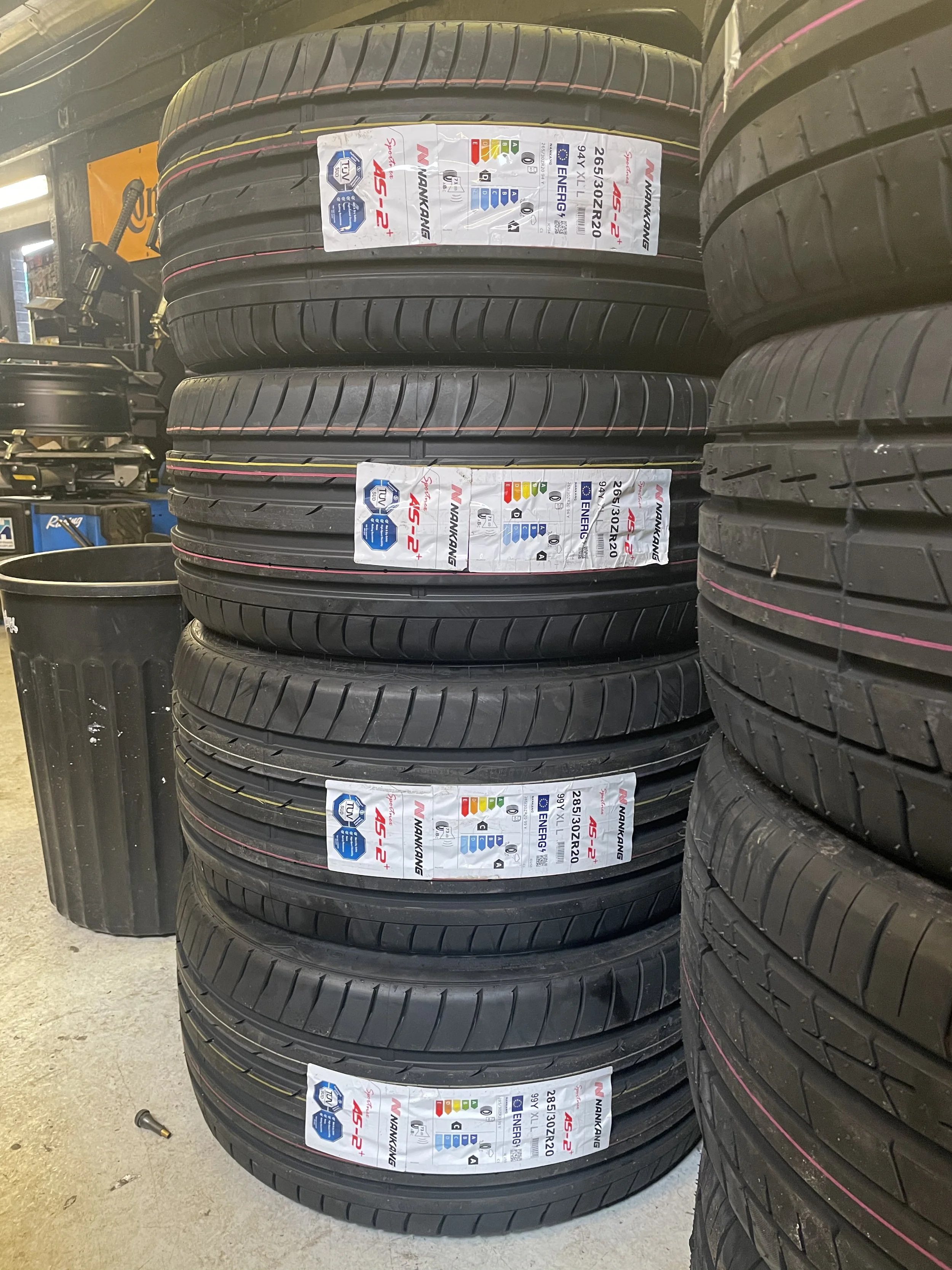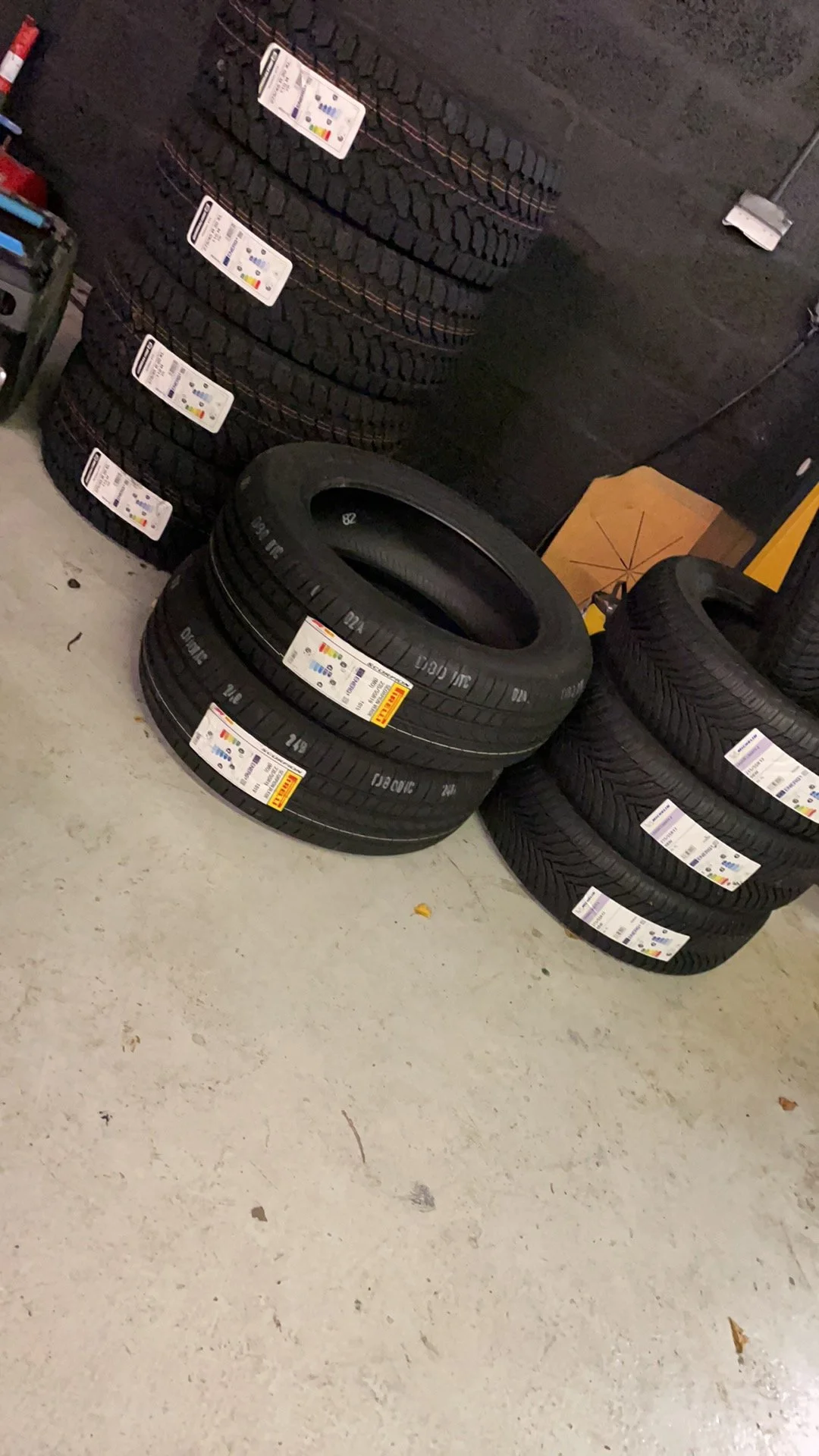 Stack of six new car tires with yellow and white labels in an auto repair shop, with several older tires, tools, and equipment visible in the background.