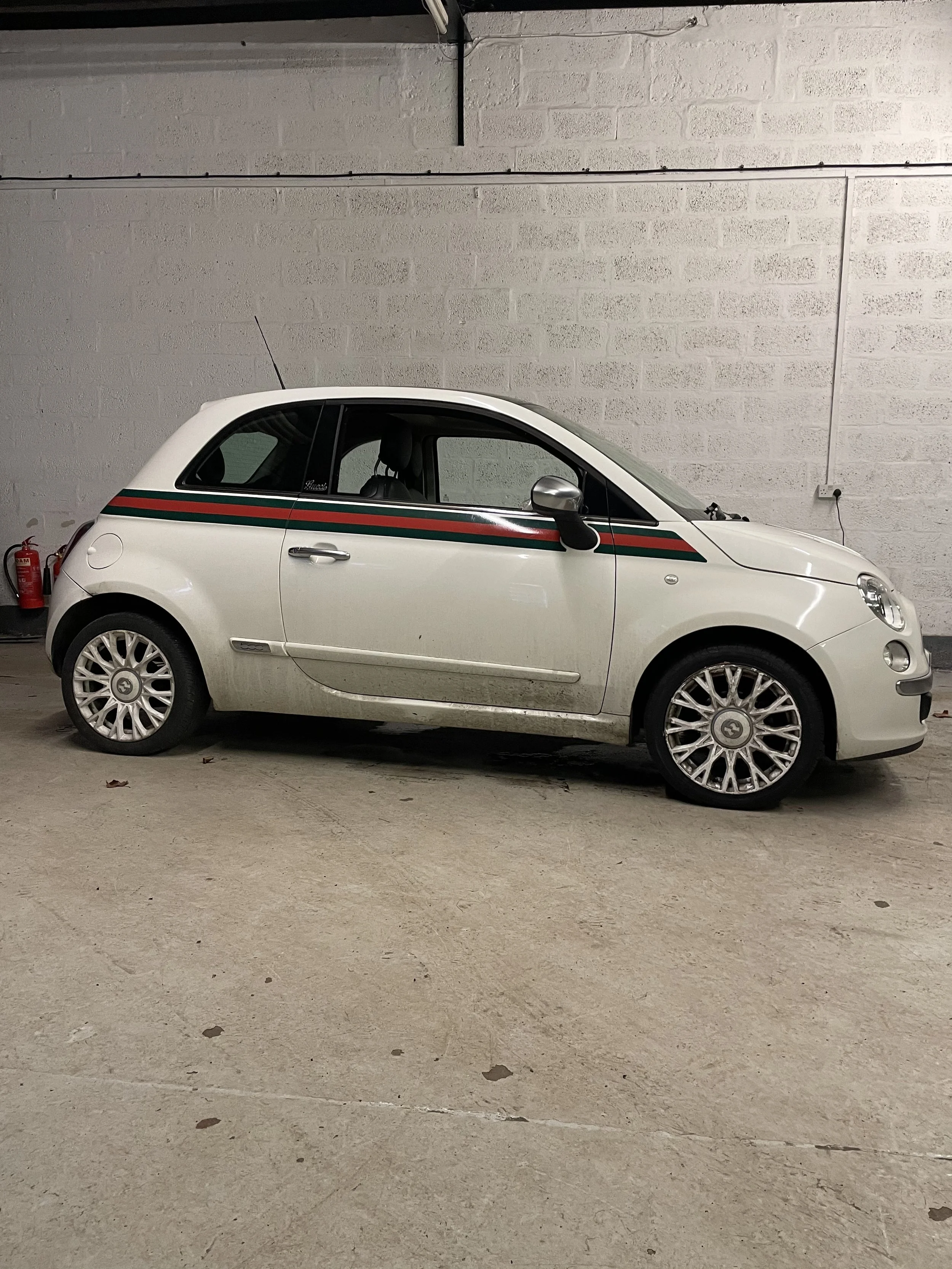 A white Fiat 500 car parked indoors against a gray brick wall, with a red and green stripe along the side.