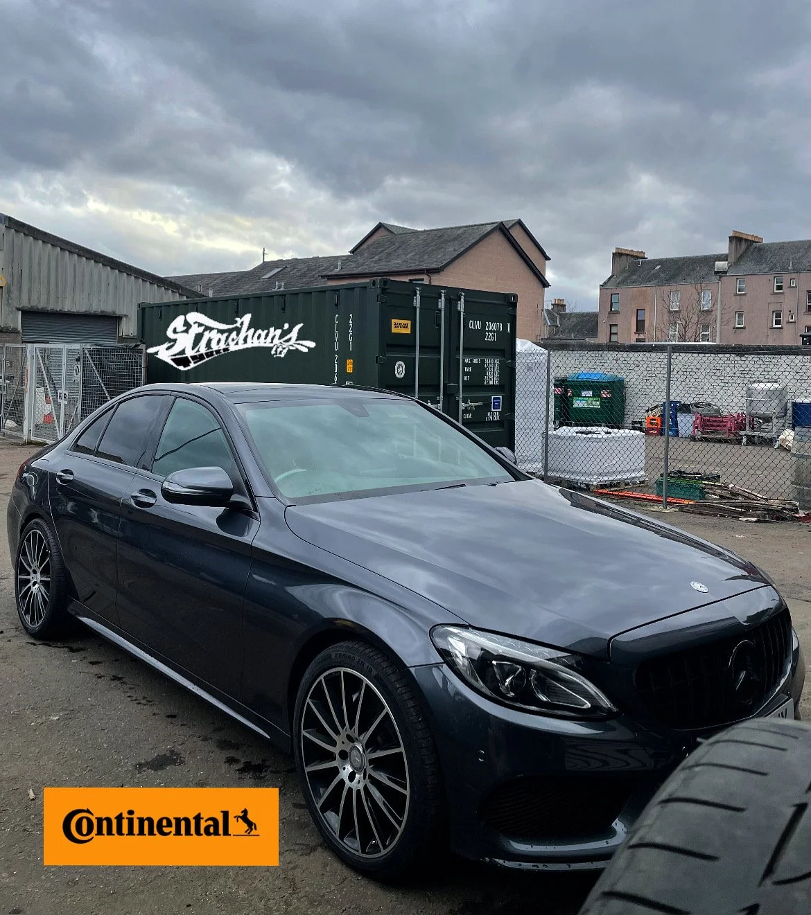 A black Mercedes-Benz sedan parked in an outdoor lot with a chain-link fence, cargo containers, and buildings in the background. The sky is overcast.