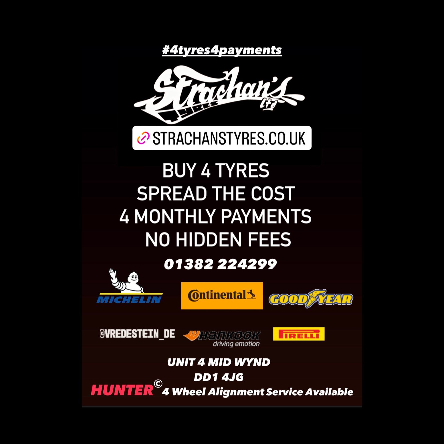 Advertisement for Strachan's tyres, offering a deal to buy four tyres with four monthly payments, no hidden fees. Contact number and logos of Michelin, Continental, Goodyear, Hankook, Pirelli, and Hunter 4 Wheel Alignment.