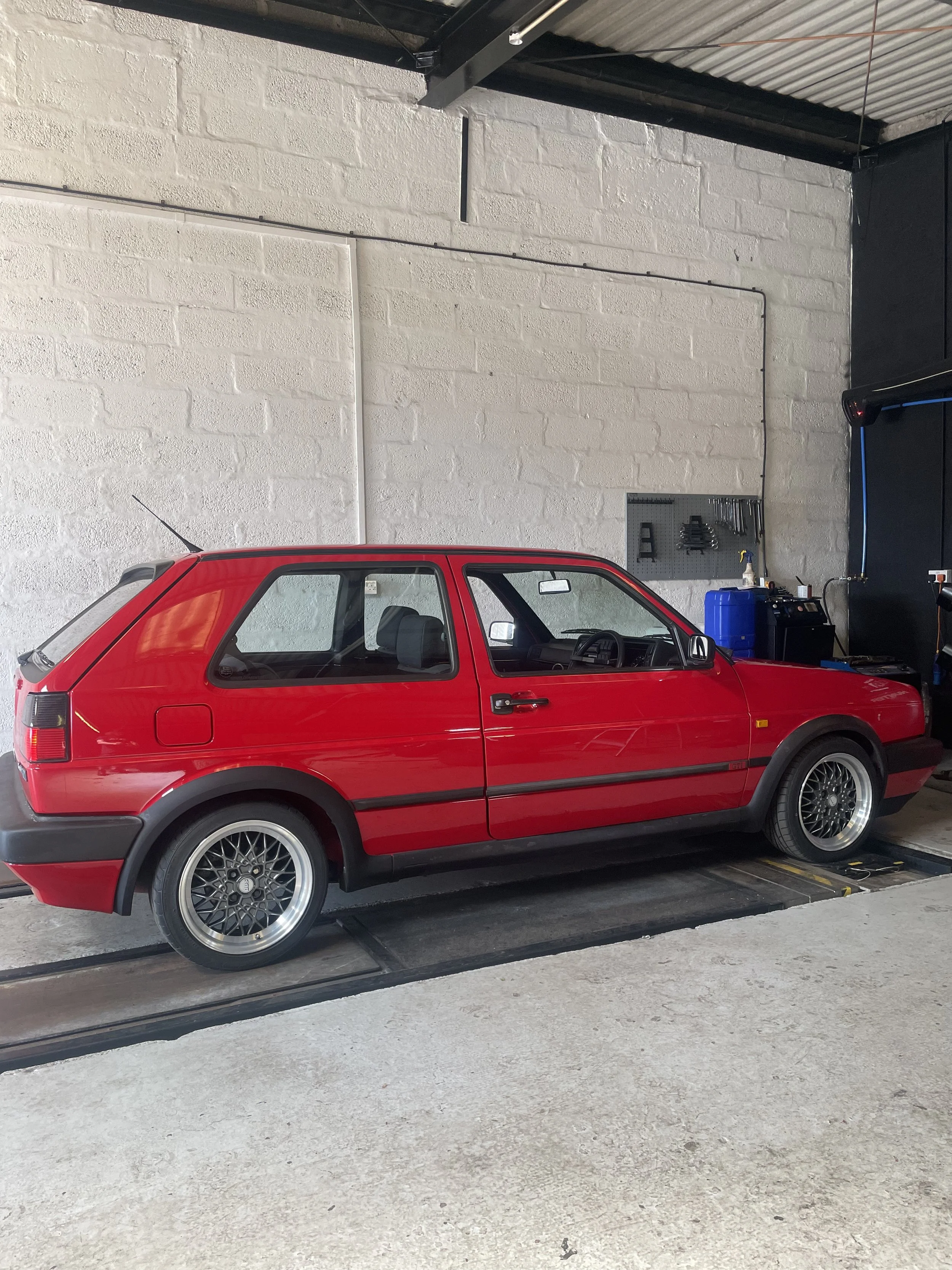 A red vintage hatchback car, parked indoors on a dynamometer roller, with tools and equipment on a wall-mounted pegboard in the background.