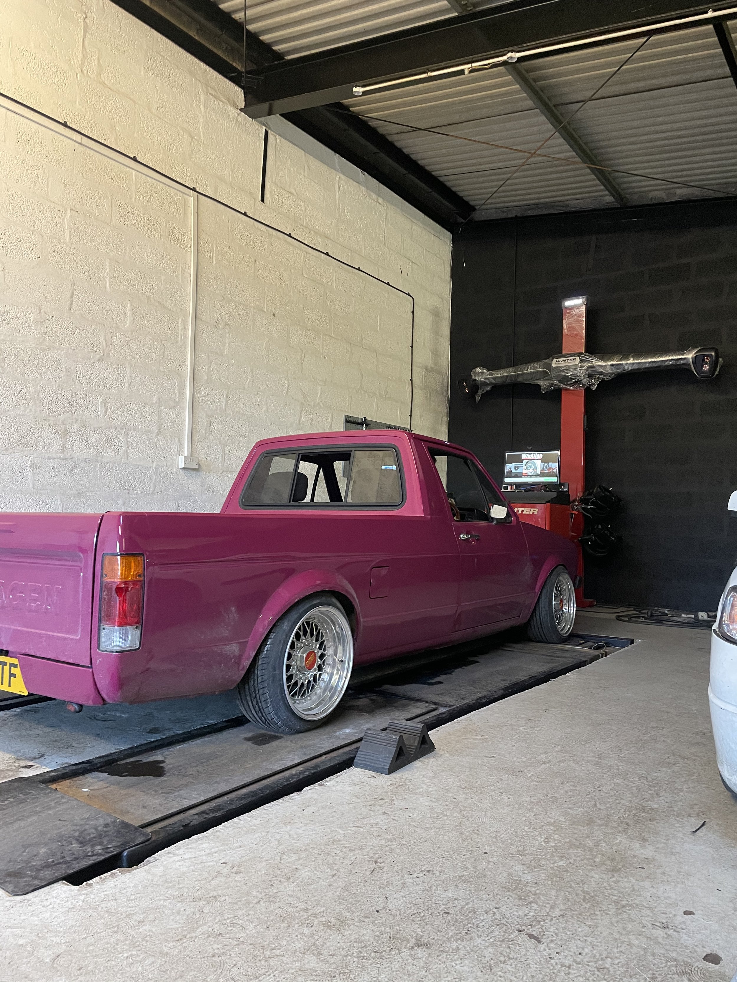 A pink pickup truck inside an automotive workshop on a dynamometer testing platform.