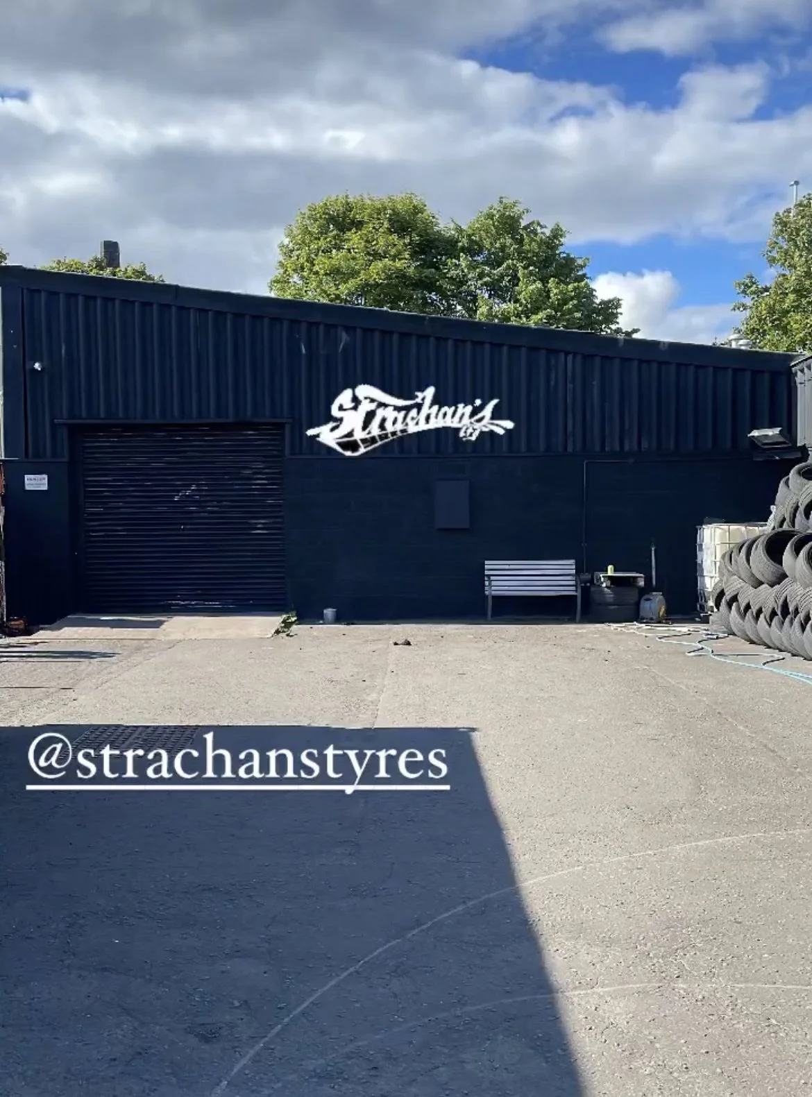 A black industrial building with a white sign that says 'Strachan's'. There are tires stacked on the right side and a bench in front of the building. The sky is partly cloudy.