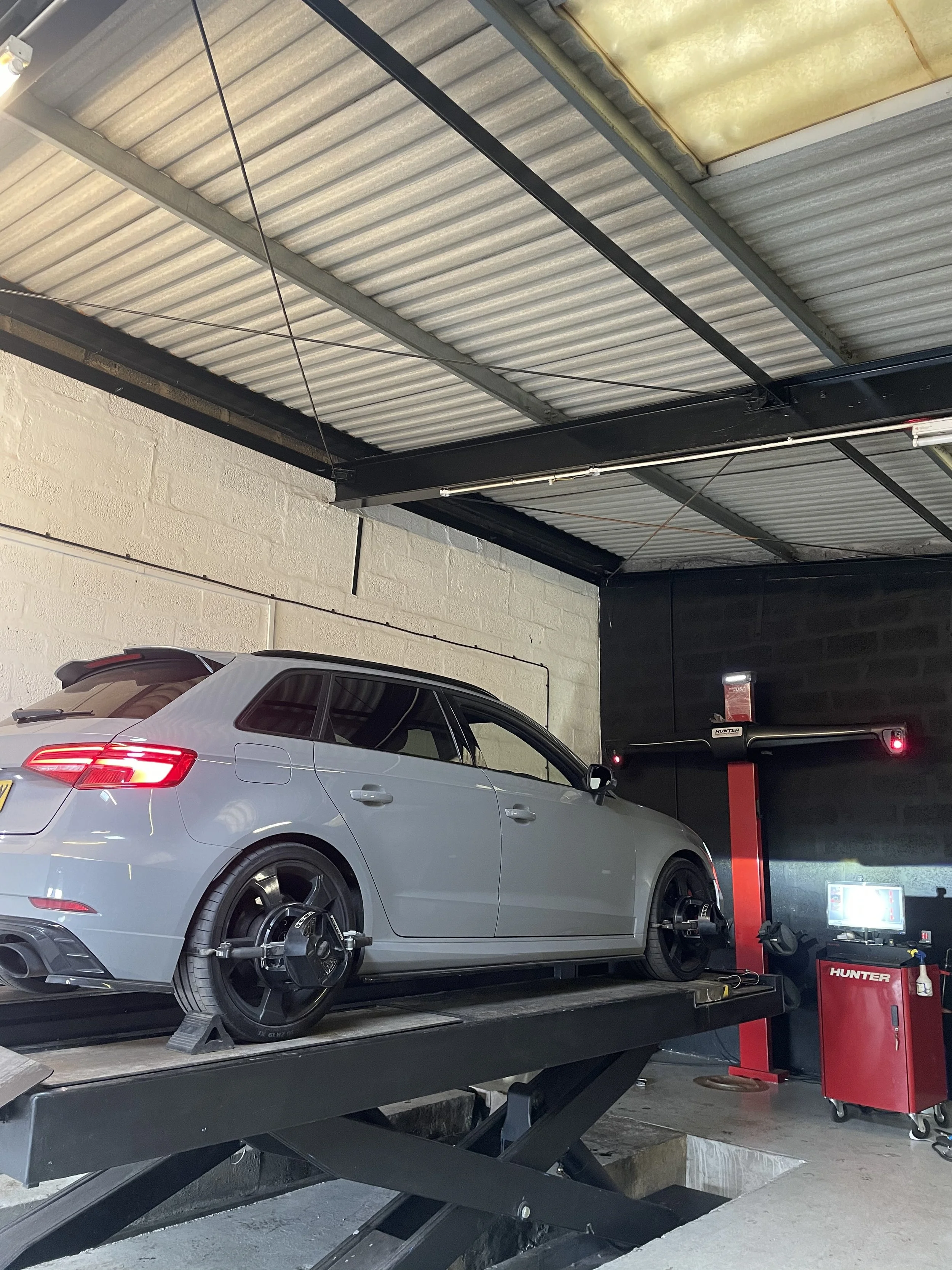 A silver Audi hatchback on a car lift in an automotive workshop, connected to wheel alignment sensors, with a computer monitor and tools nearby.